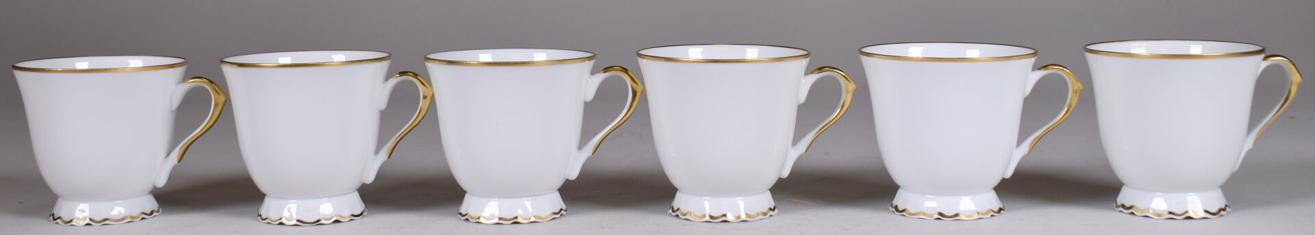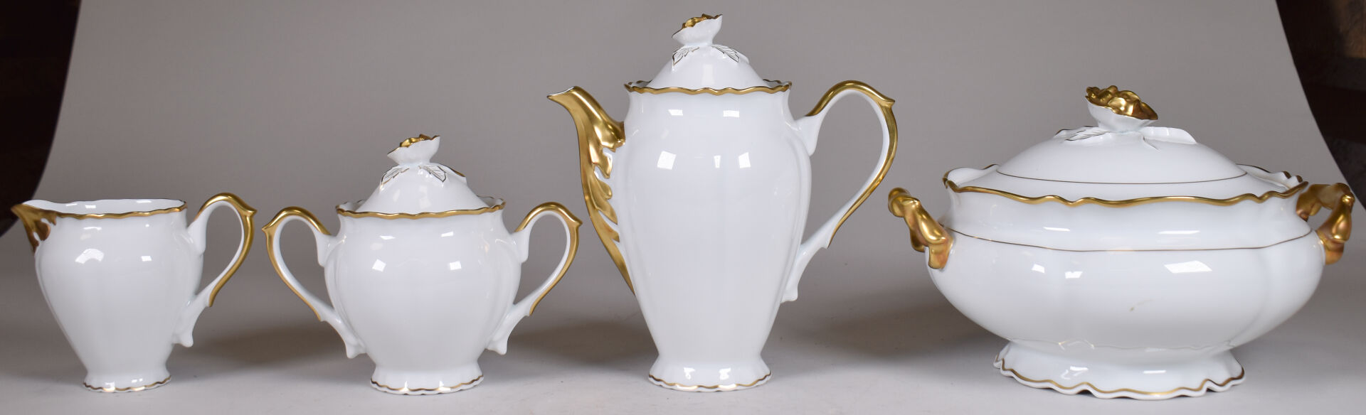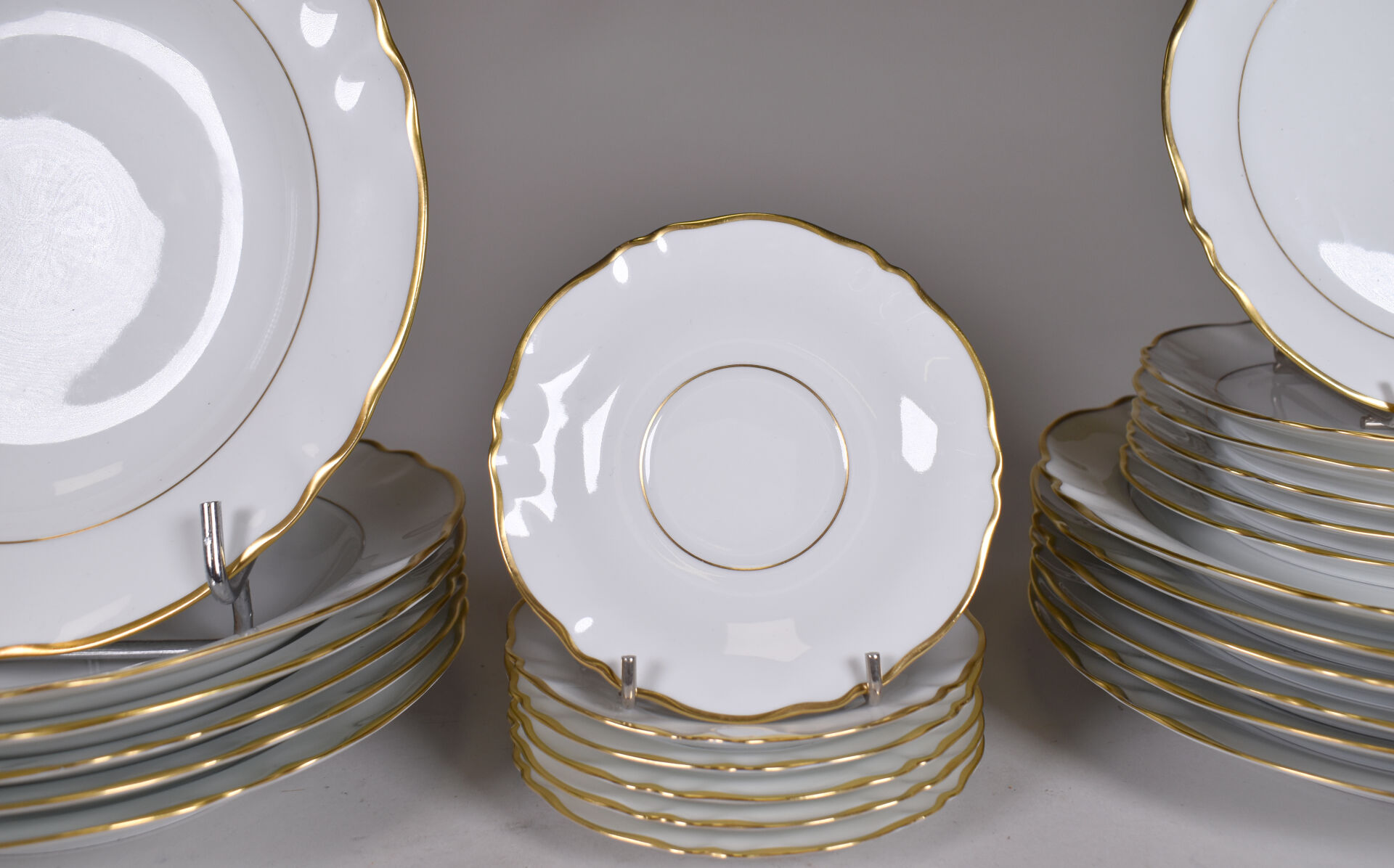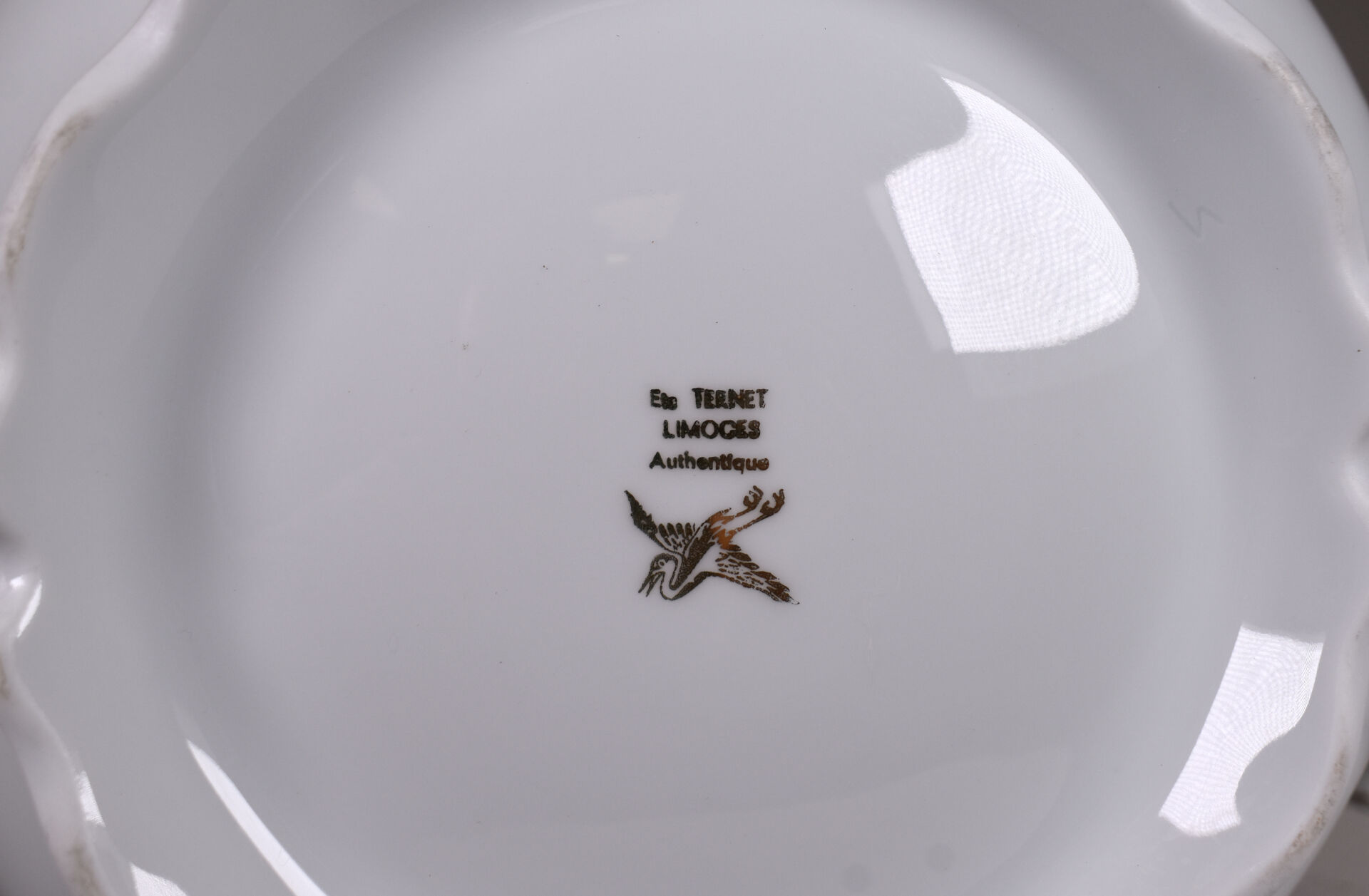 TERNET – LIMOGES. Partie de service à café en porcelaine et service de table à liseré or comprenant une cafetière, un pot à sucre, un pot à lait, six tasses et six sous-tasses, six assiettes plates (une avec un éclat sous l’aile) et six assiettes creuses (une avec un éclat sur l’aile). Marqués.