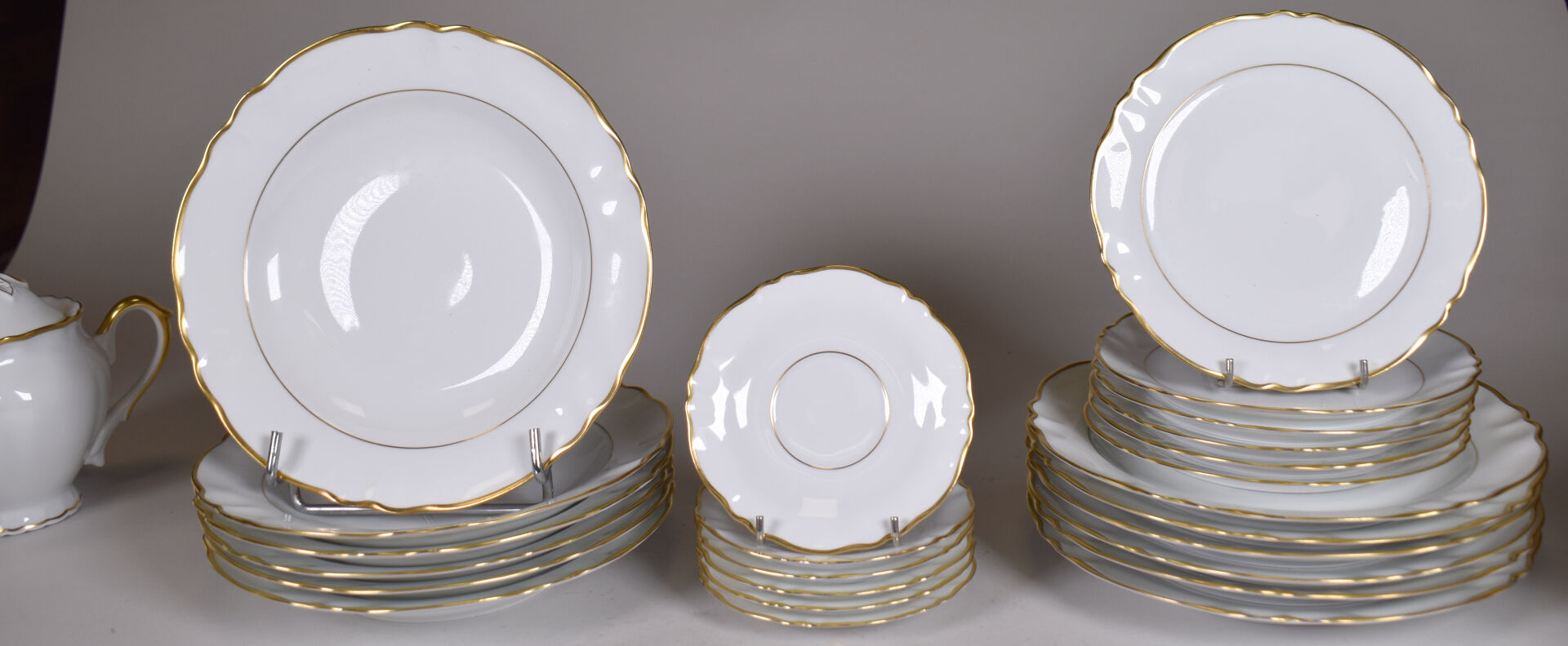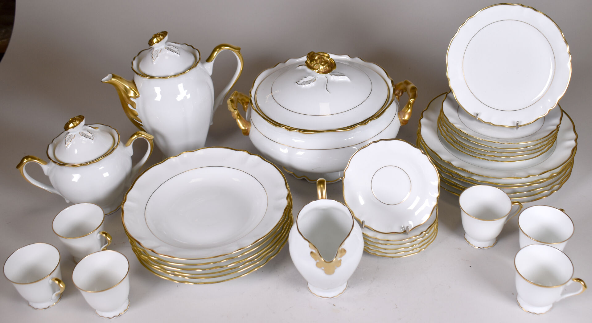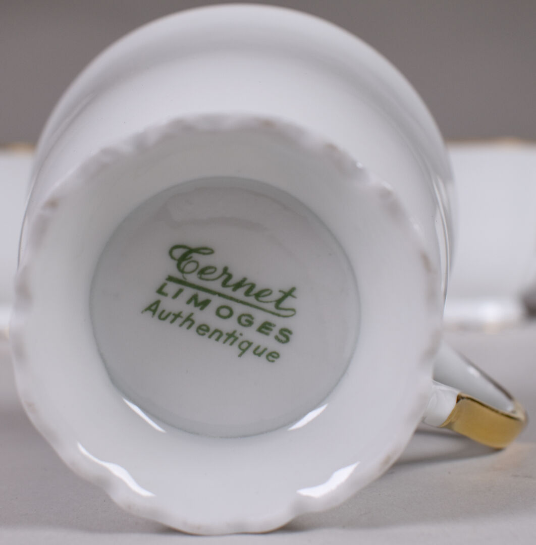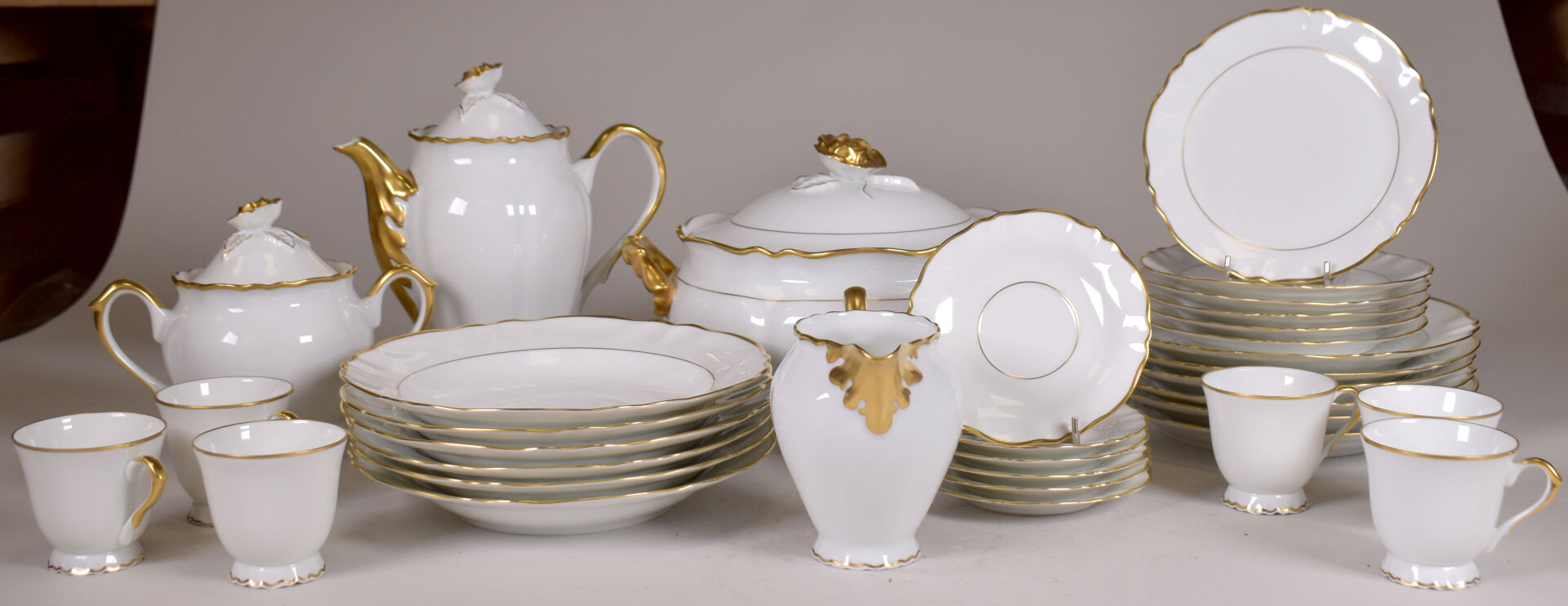 TERNET – LIMOGES. Partie de service à café en porcelaine et service de table à liseré or comprenant une cafetière, un pot à sucre, un pot à lait, six tasses et six sous-tasses, six assiettes plates (une avec un éclat sous l’aile) et six assiettes creuses (une avec un éclat sur l’aile). Marqués.