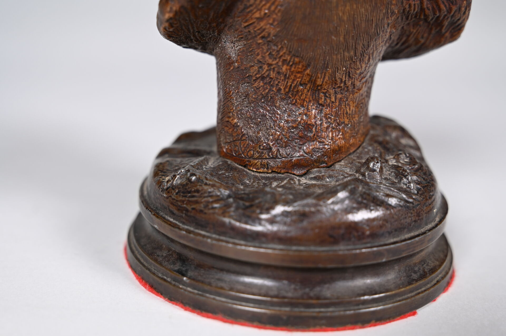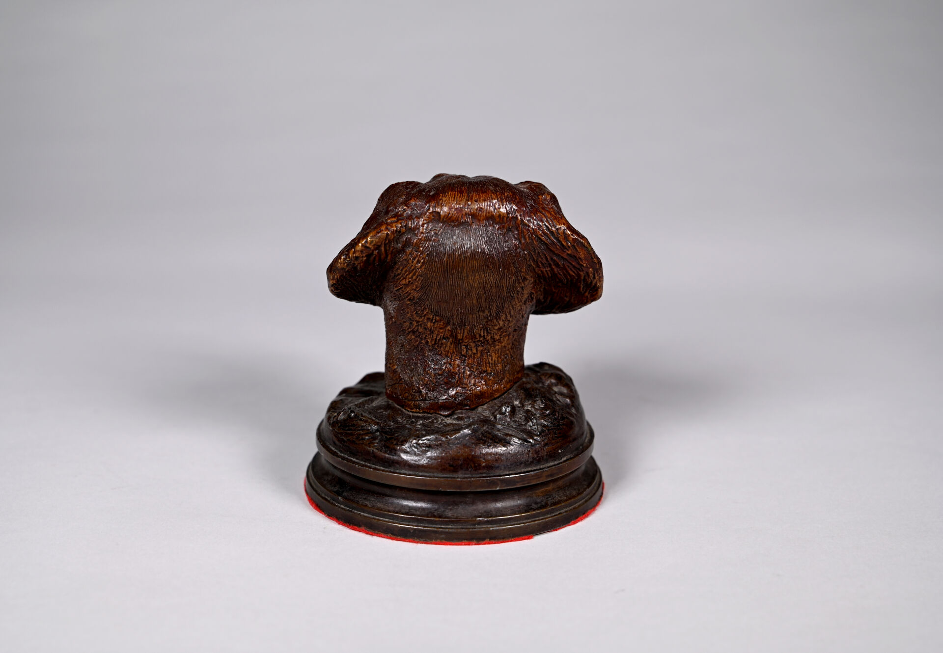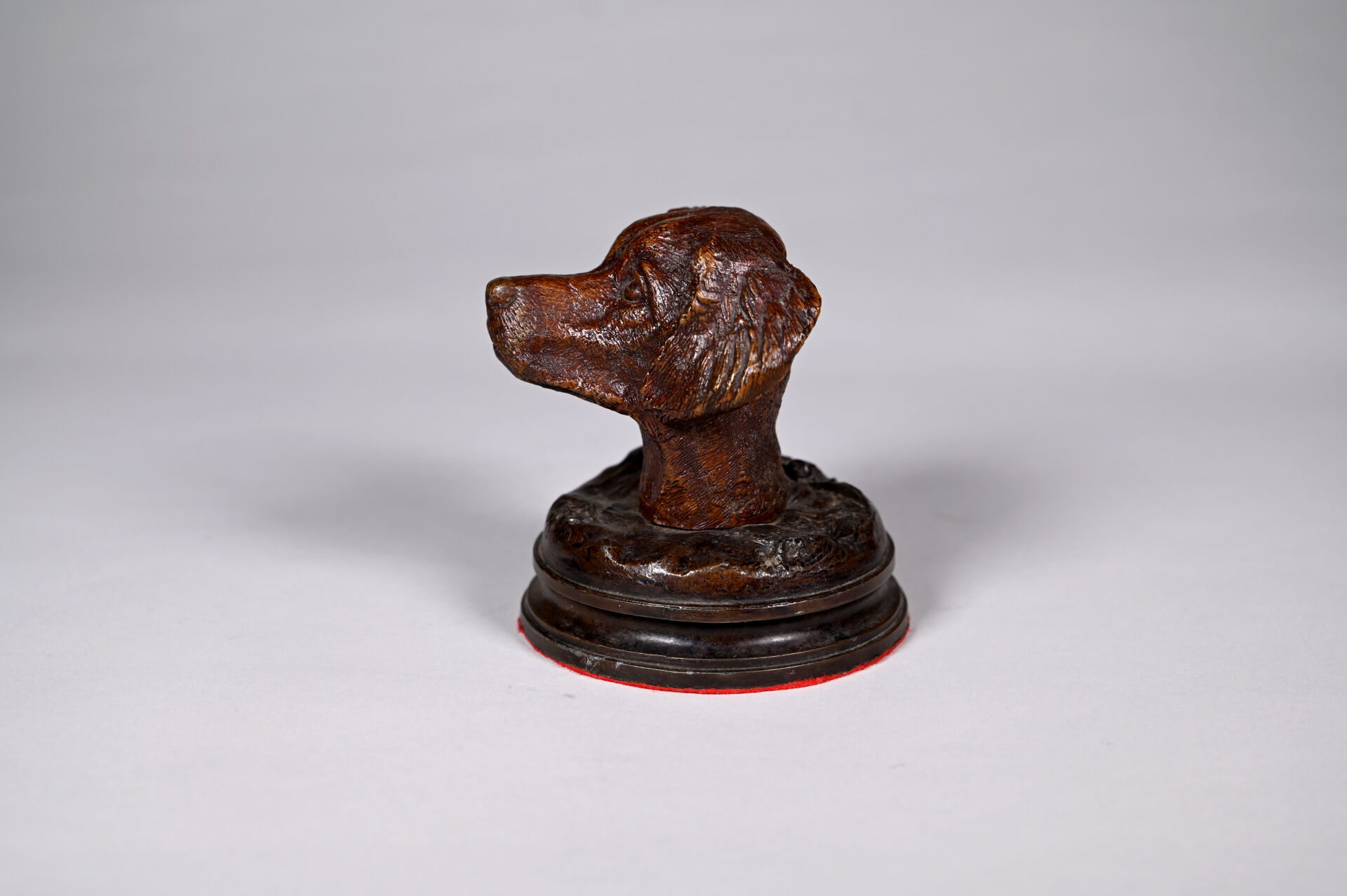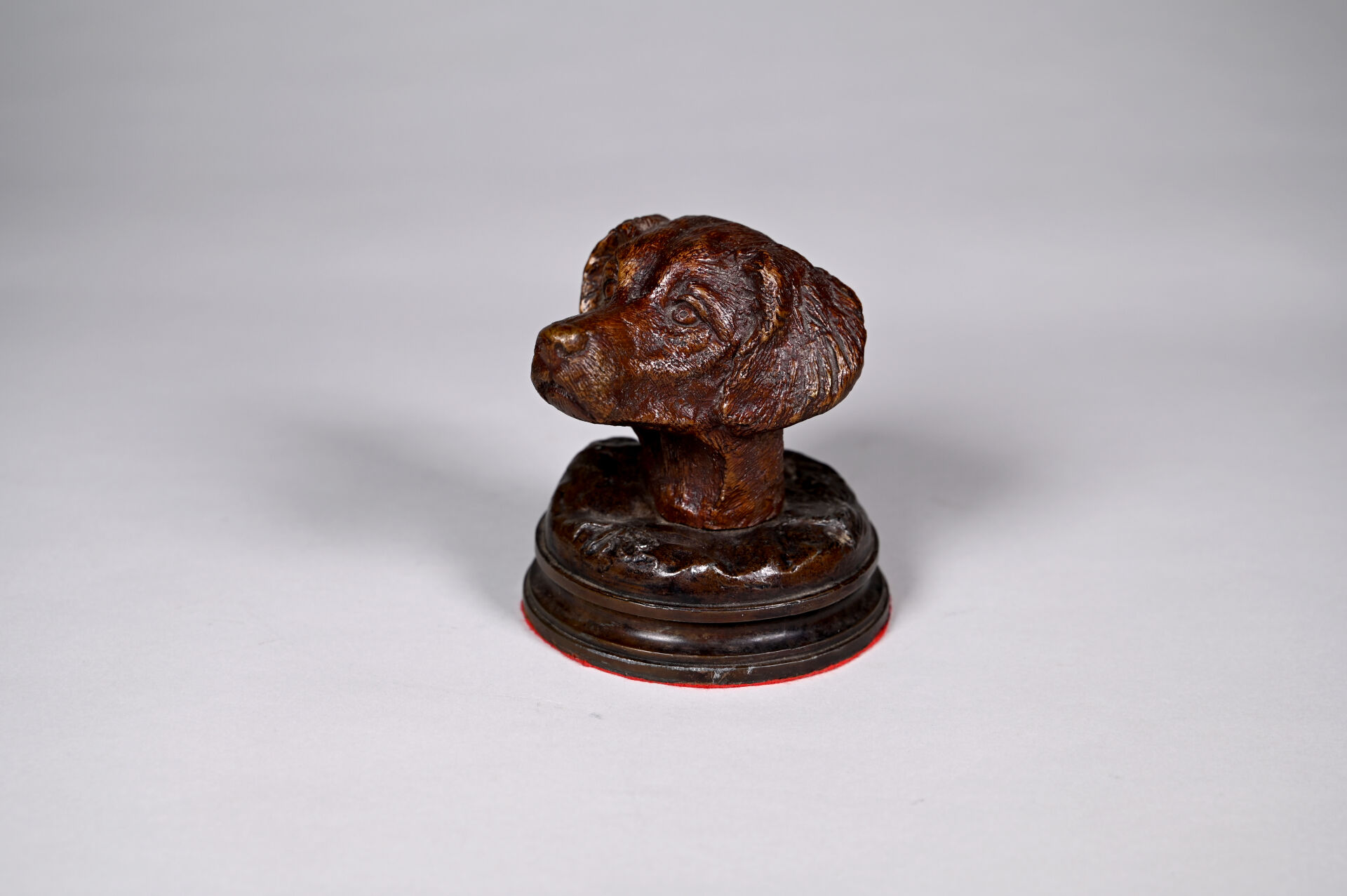 Tête de chien en bronze sculpté patiné brun. Porte une signature au dos. Haut. : 13 cm.