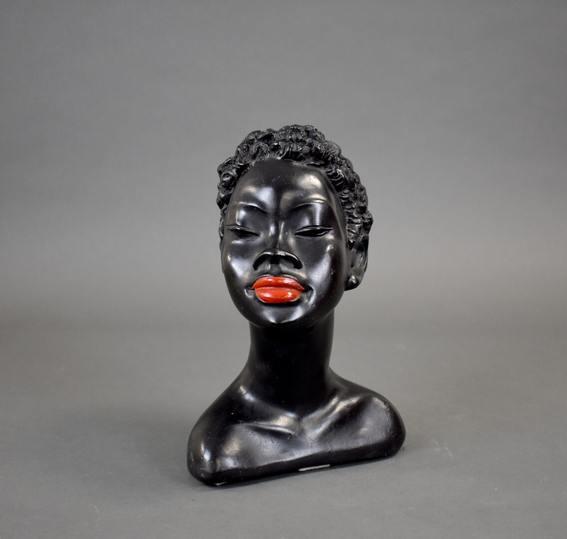 Tête de femme africaine en céramique ou plâtre noir et rouge. Signée au dos. Haut. : 29,5 cm.