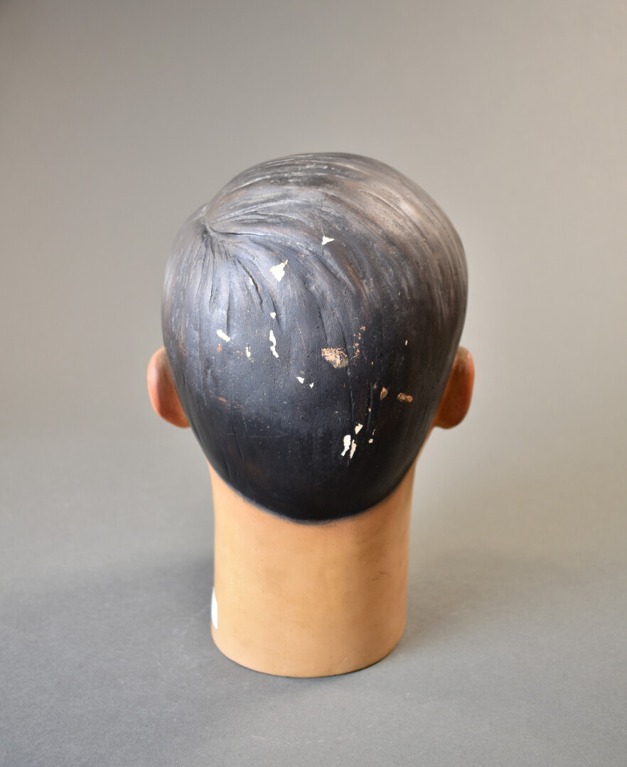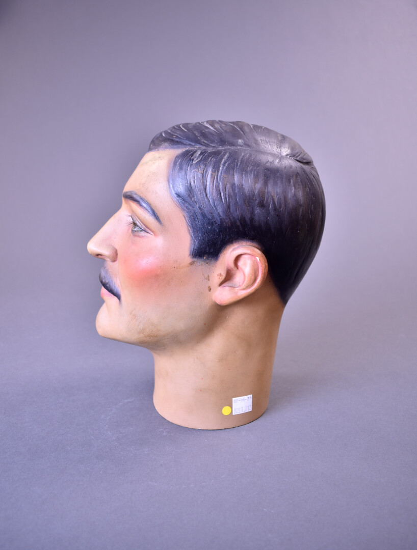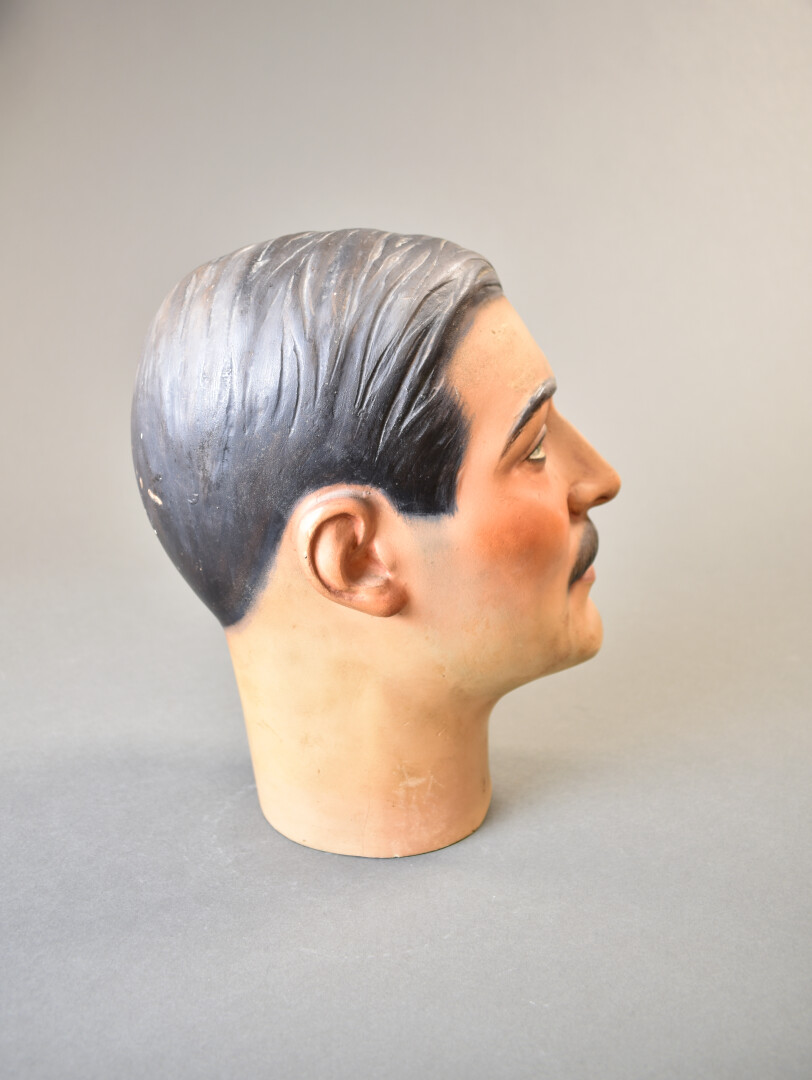 Tête de manequin masculin en céramique,les yeux en verre (un fèle, quelques usures). Vers 1930. Haut. : 29 cm.