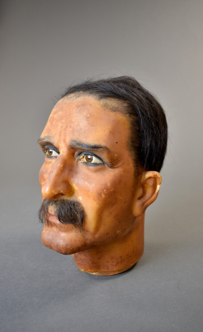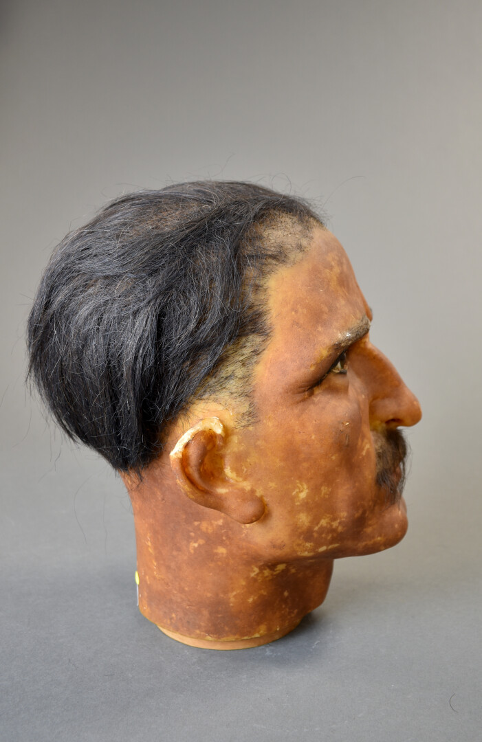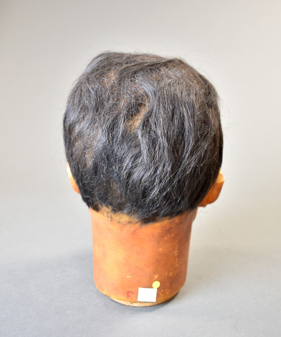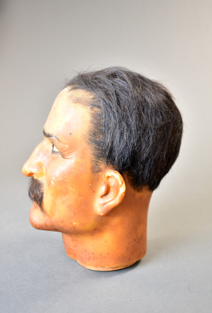 Tête de manequin masculin en cire et cheveux, les yeux en verre (quelques manques). Vers 1920/1930. Haut. : 29 cm.