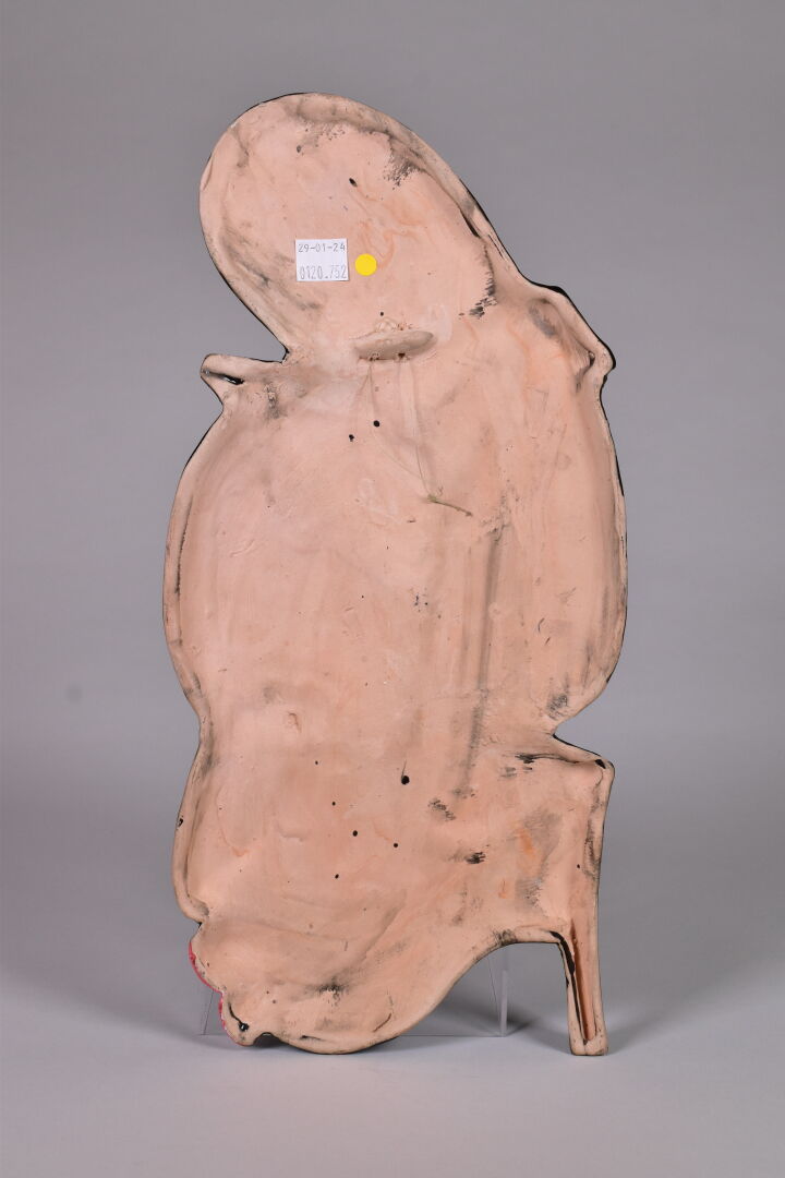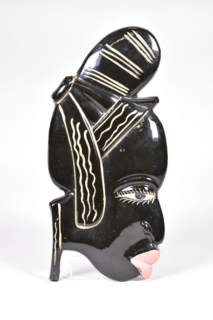Tête de nubienne en céramique émaillée noir, rose et or. Milieu du XXe siècle. 40 x 25 cm.