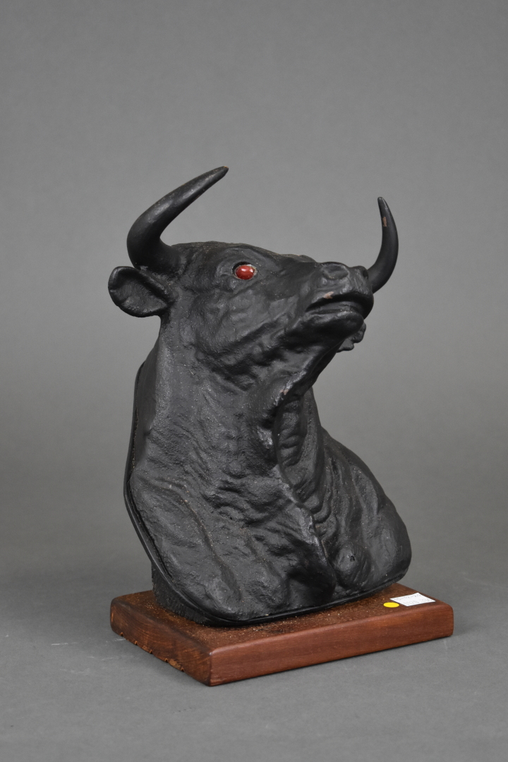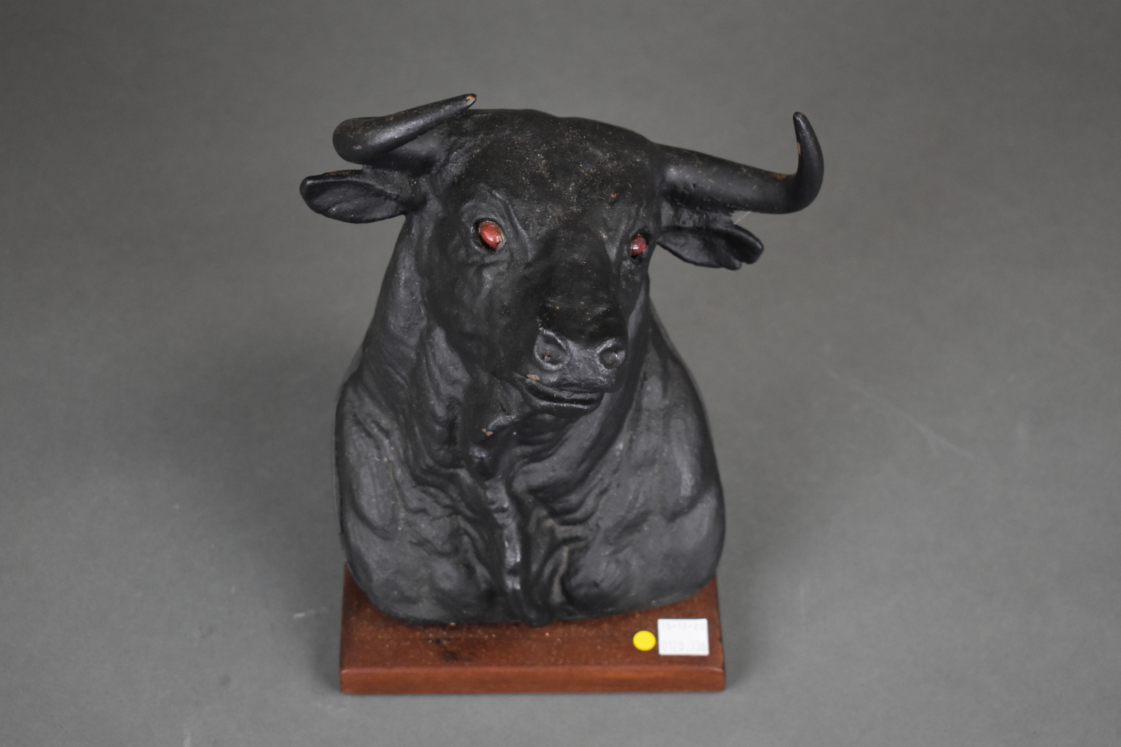 Tête de taureau en métal laqué noir, les yeux en verre rouge. Socle en bois. XXe siècle. Haut. : 27 cm.