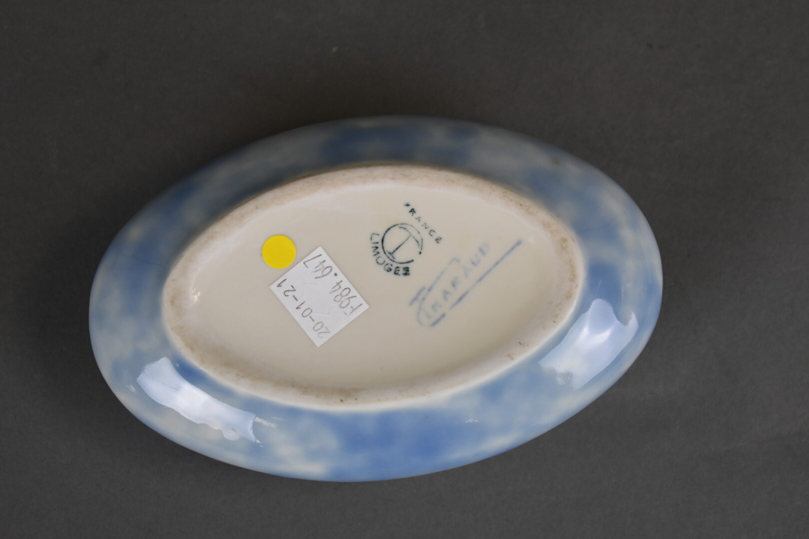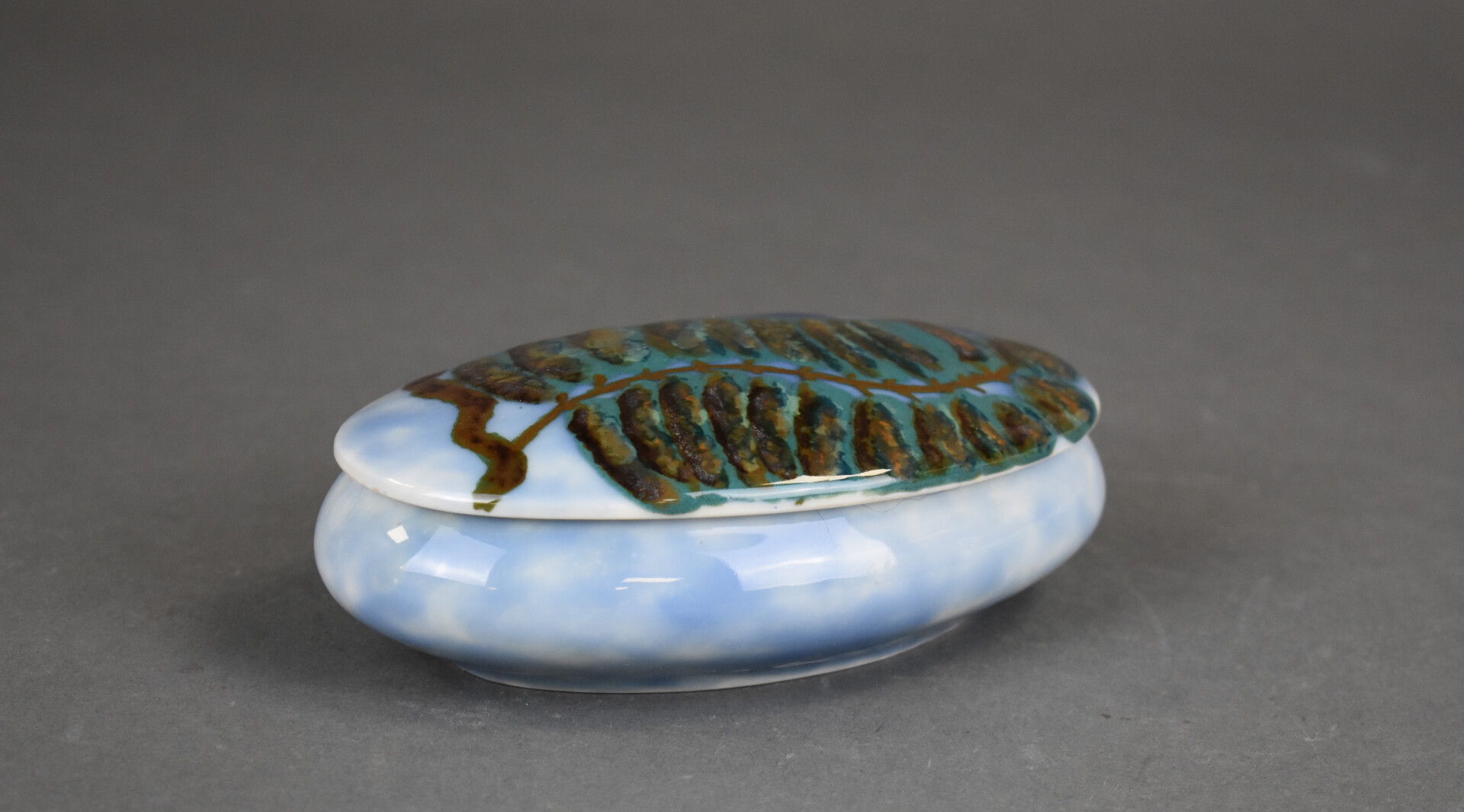 THARAUD LIMOGES. Bonbonnière en porcelaine émaillée d’une feuille de fougère. Marquée. Haut. : 6 cm.