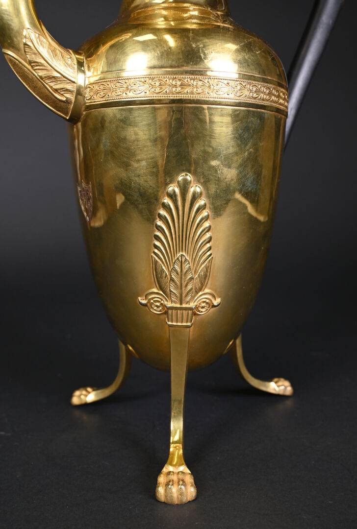 Théière en argent 925/1000e doré poinçon 2e coq Paris (1809 – 1818). Le bec orné d’une tête de cheval, les pieds griffe à décor de palmettes, l’anse en bois noirci. Chiffrée. Poinçon du maître orfèvre : Jean-pierre-Nicolas BIBRON ( » JPB « – un lion et une étoile), reçu en Frimaire de l’An V. Epoque Empire. : 38 cm. Poids brut. : 1 093 g.