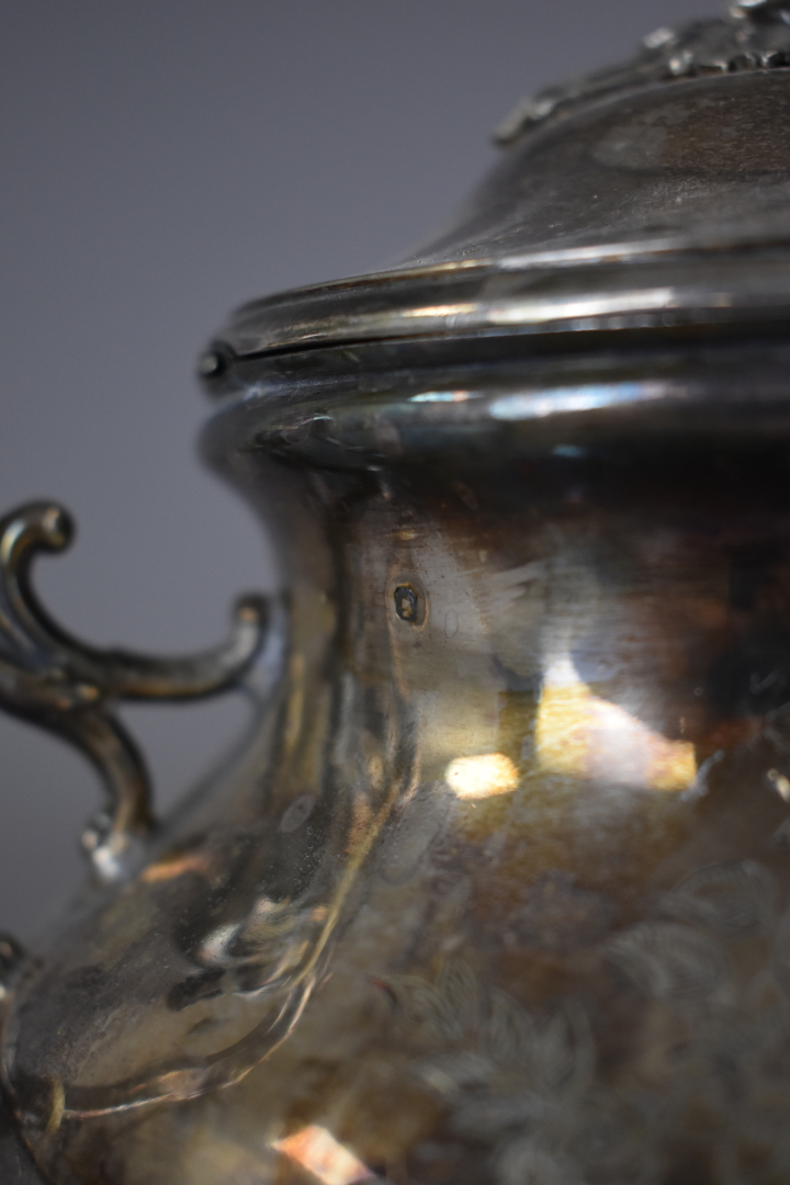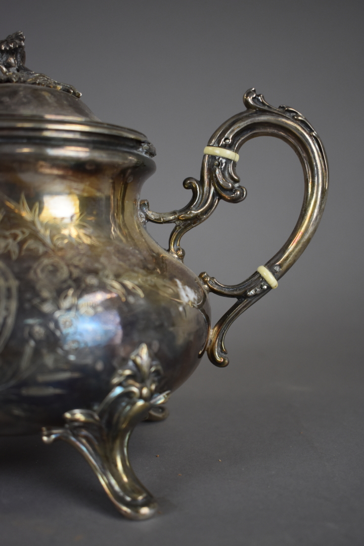 Théière en argent 950/ 1000e, la panse à décor ciselé d’un médaillon chiffré (poiçon minerve 1er titre). Poids brut. : 543 g.