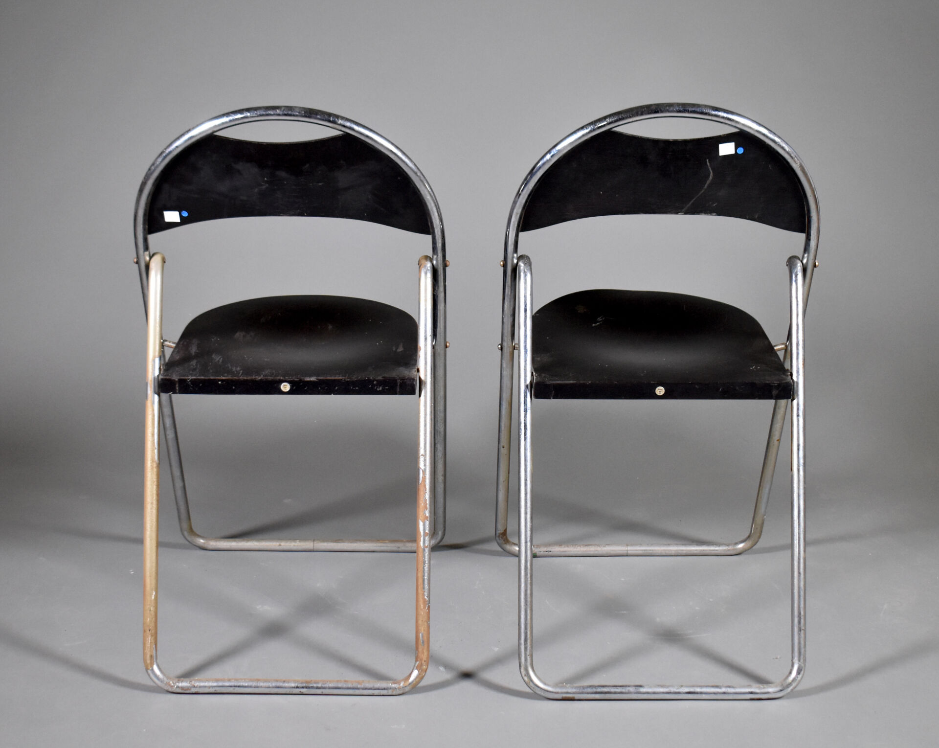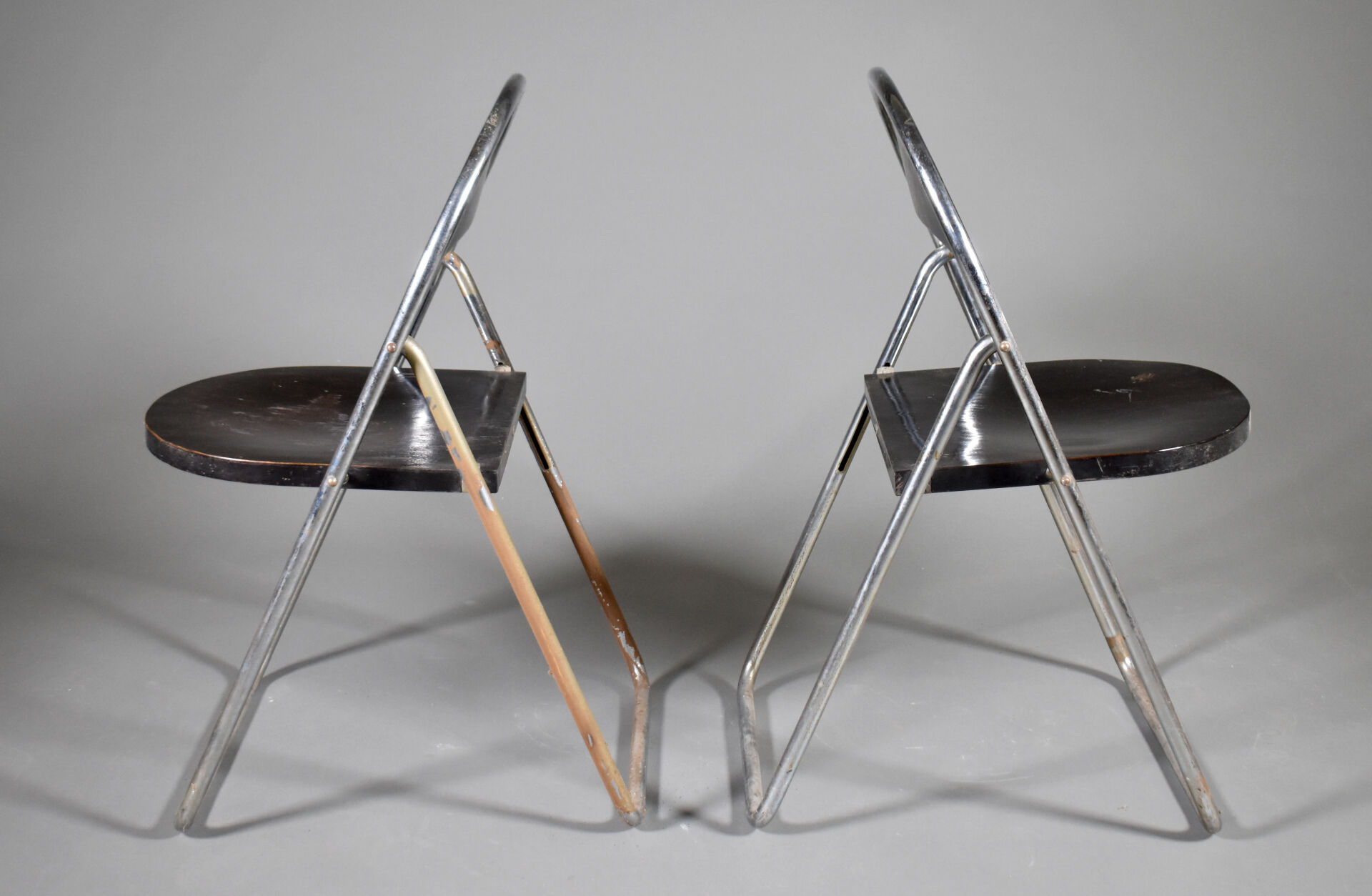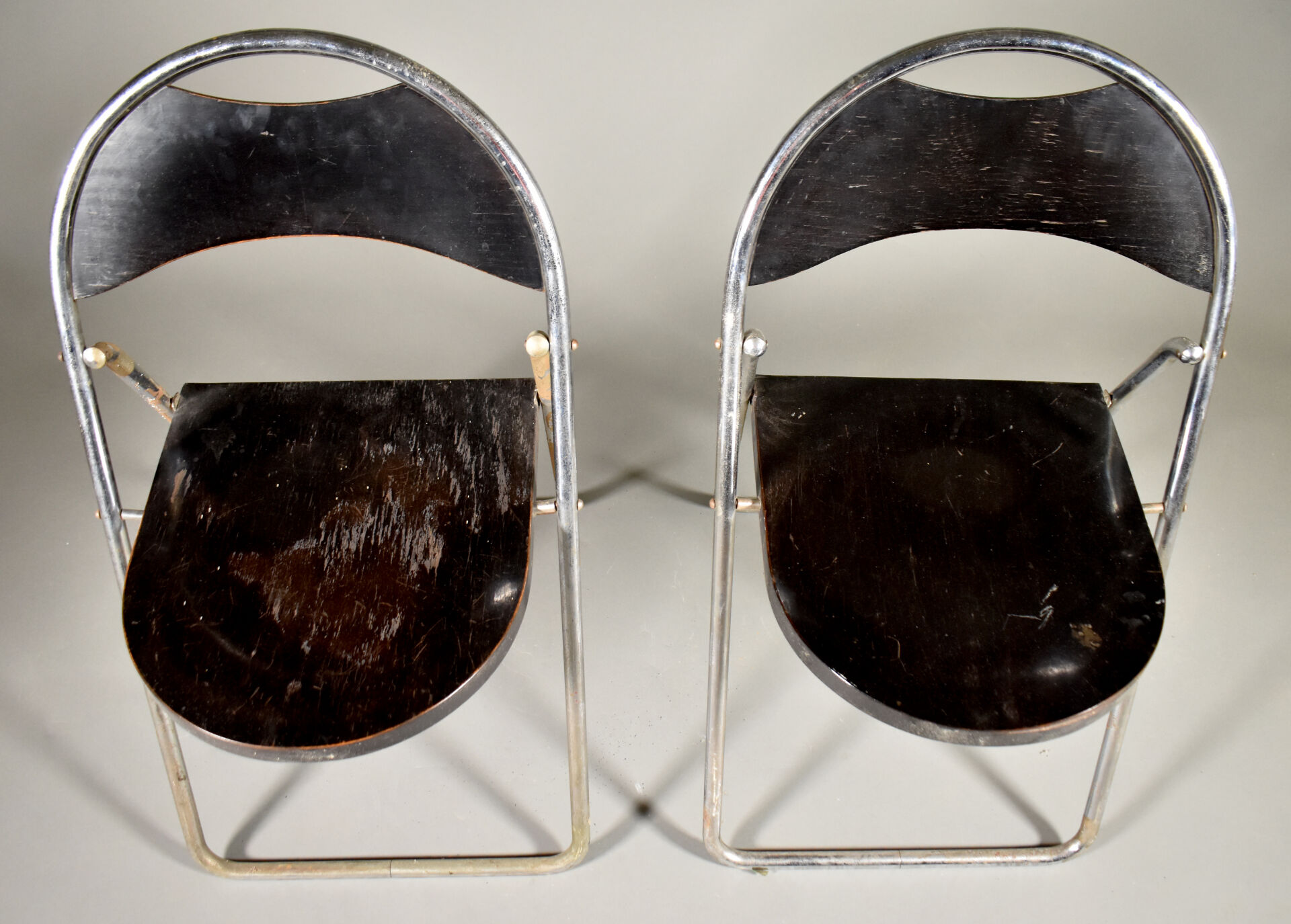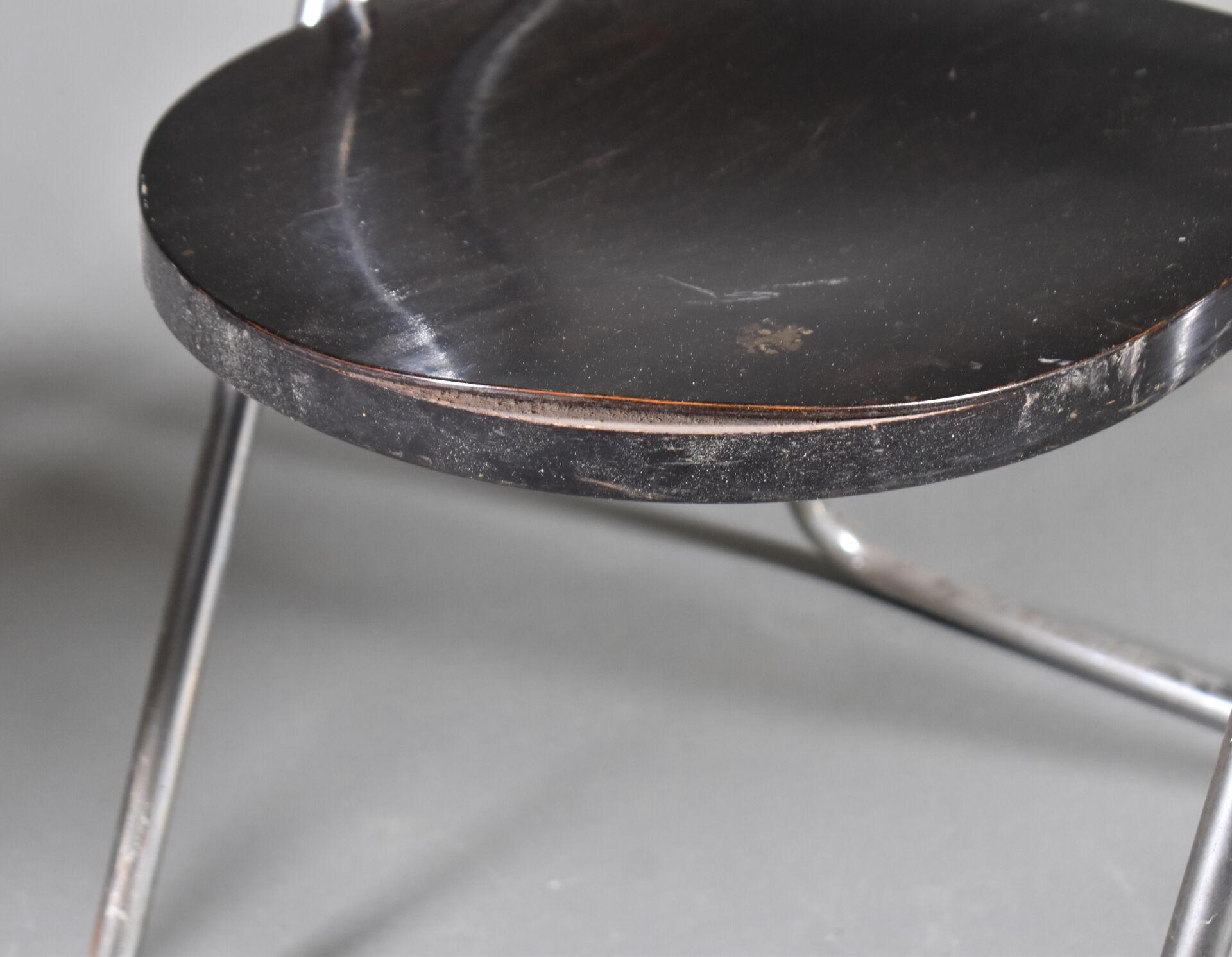 THONET EDITEUR. Paire de chaises en métal tubulaire chromé à dossier et assise en bois laqué noir. Plaque. Haut. : 80 cm.