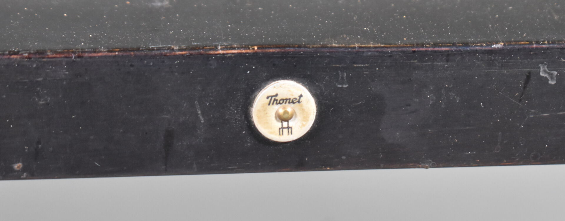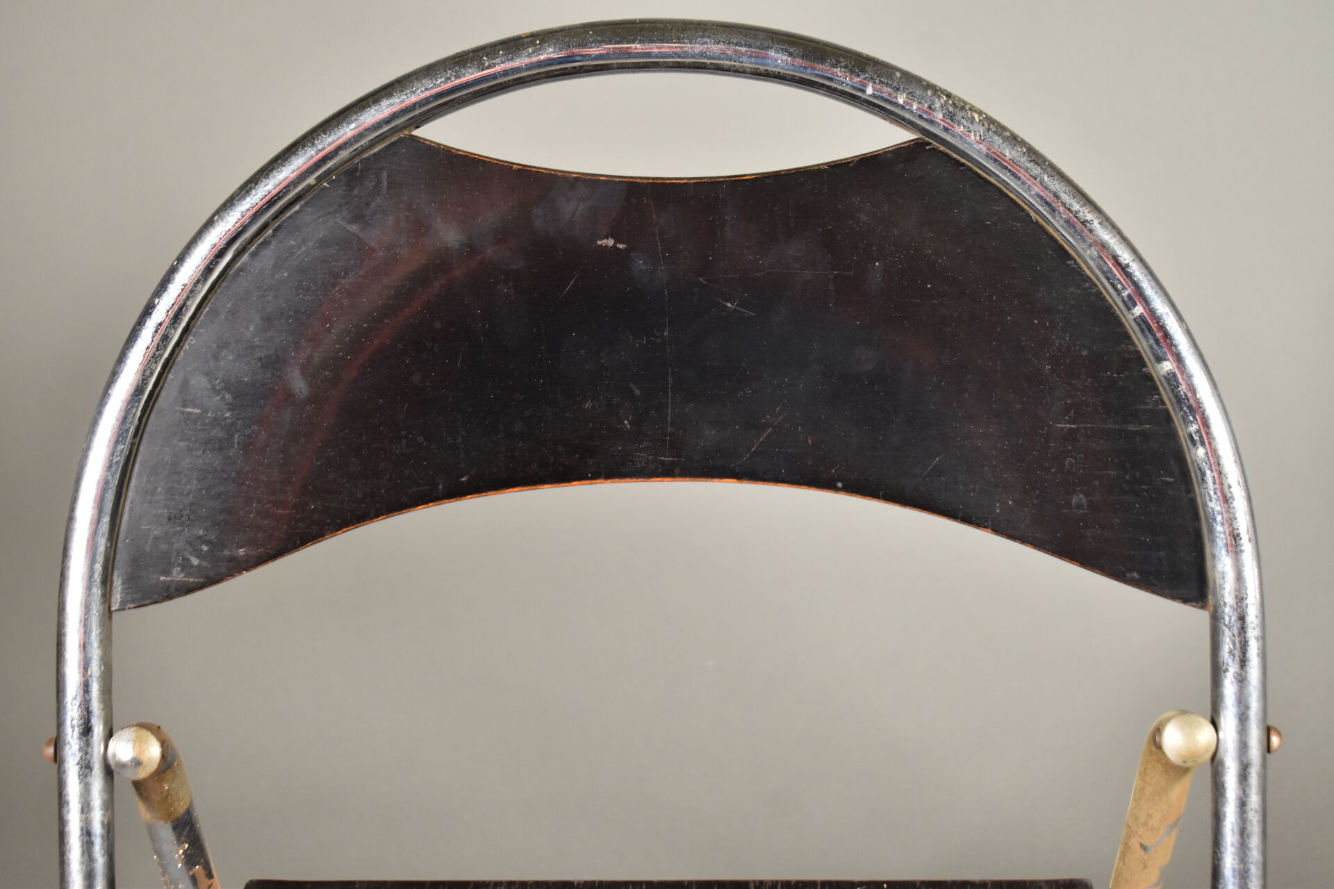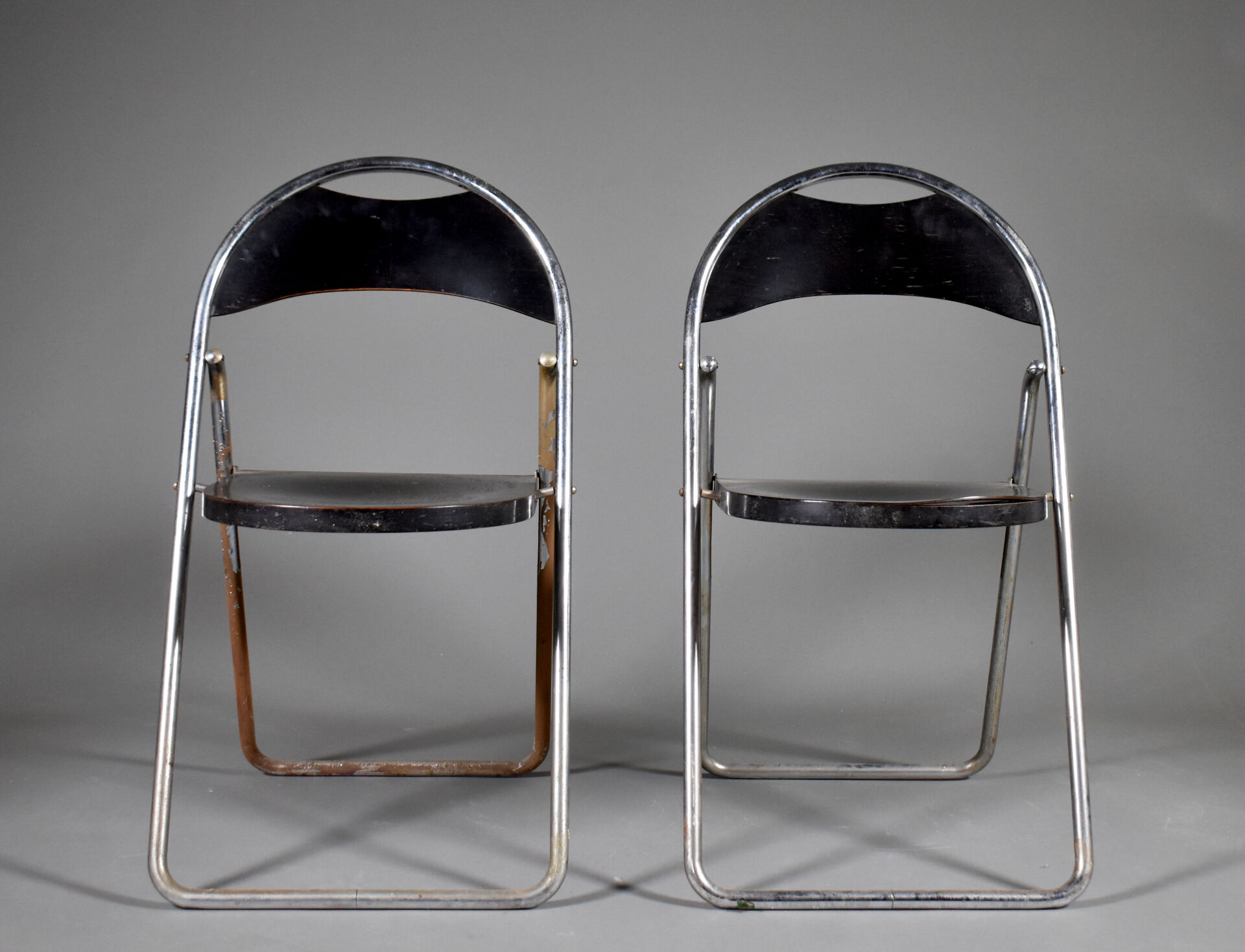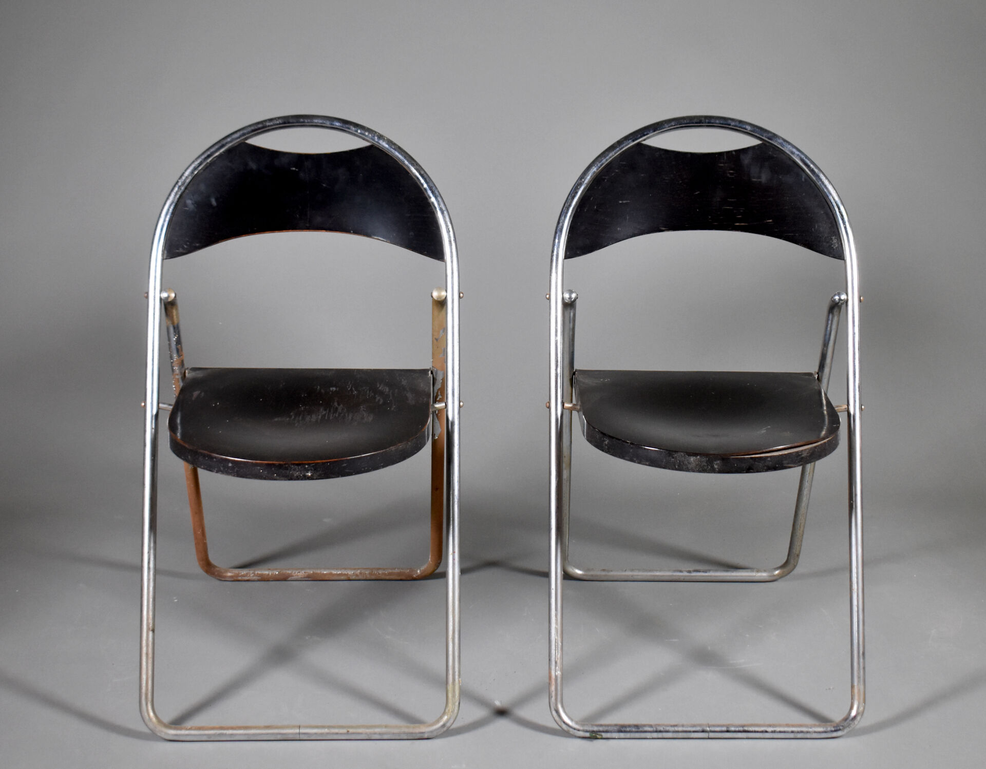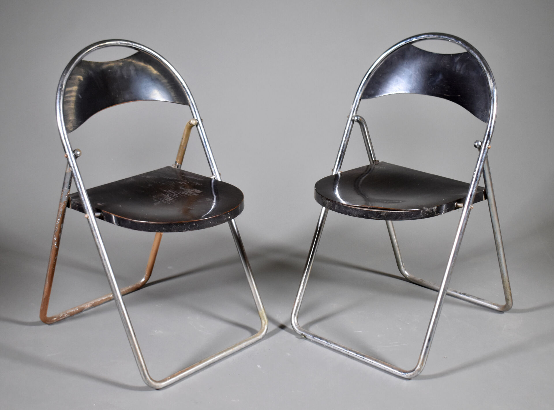 THONET EDITEUR. Paire de chaises en métal tubulaire chromé à dossier et assise en bois laqué noir. Plaque. Haut. : 80 cm.