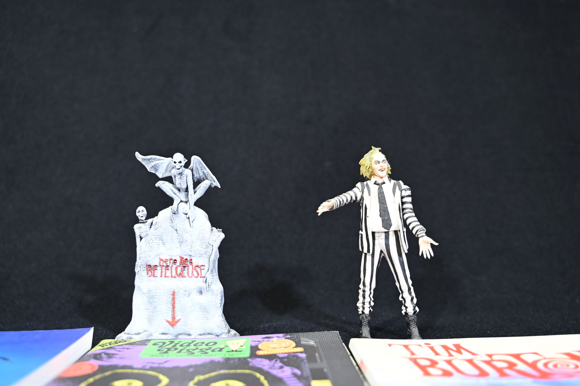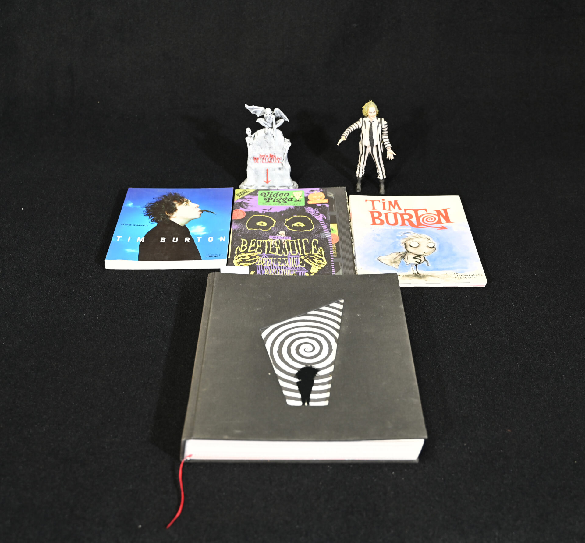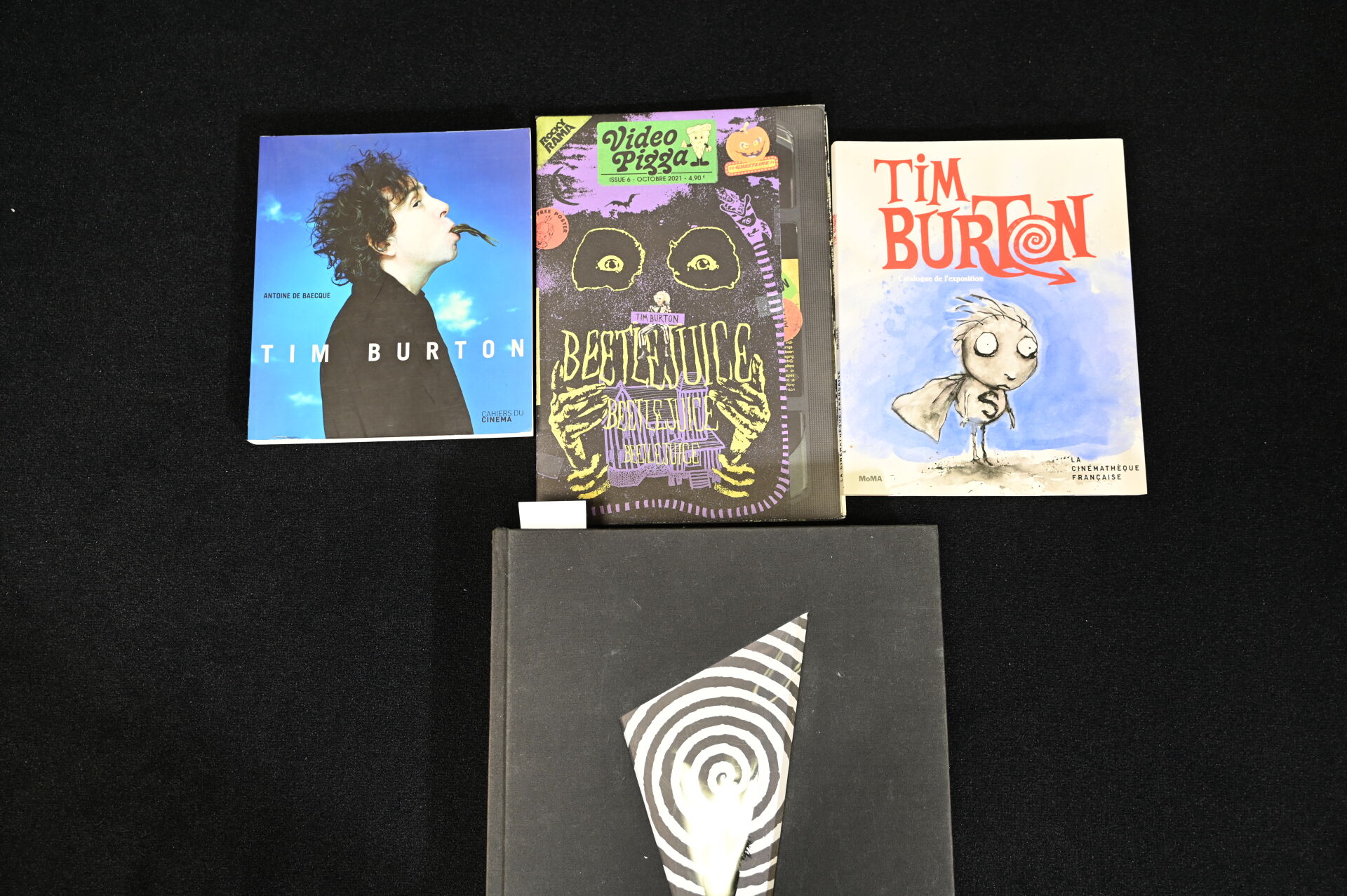 TIM BURTON – BEETLEJUICE . Trois ouvrages soit « Tim Burton » par De Baecque, Cahiers du Cinéma (2010), « Tim Burton – Catalogue de l’exposition » de Magliozzi et He, La Cinémathèque Française et « L’Art de Tim Burton » de Gallo, Steeles Publishing (2009). On joint un poster de Beetlejuice – Rocky Rama, et deux figurines soit Beetlejuice avec les traits de Michael Keaton (Haut. : 19 cm) et un décor (têtes coupées).