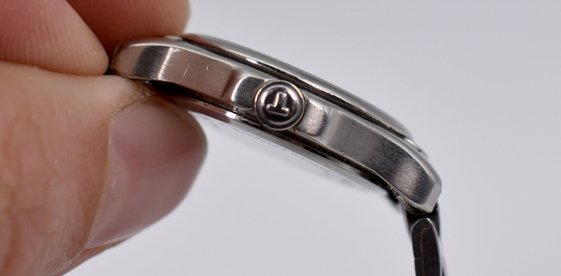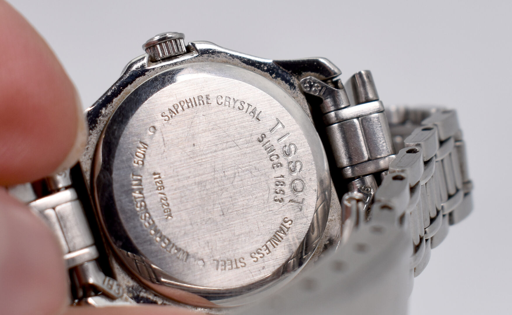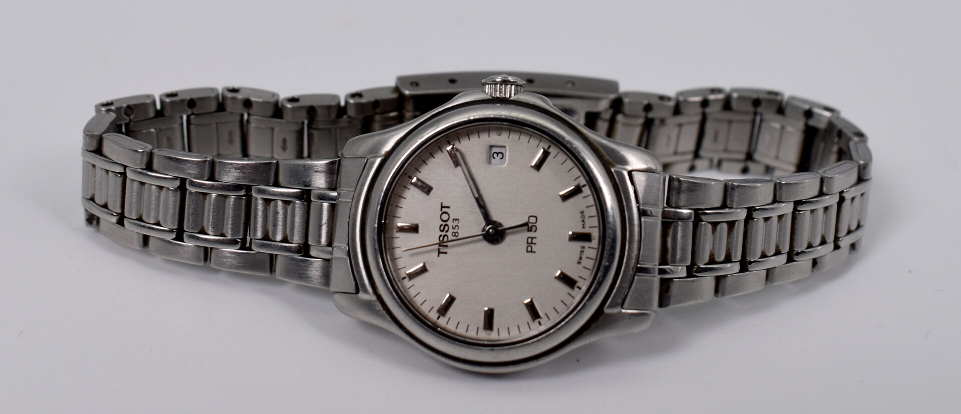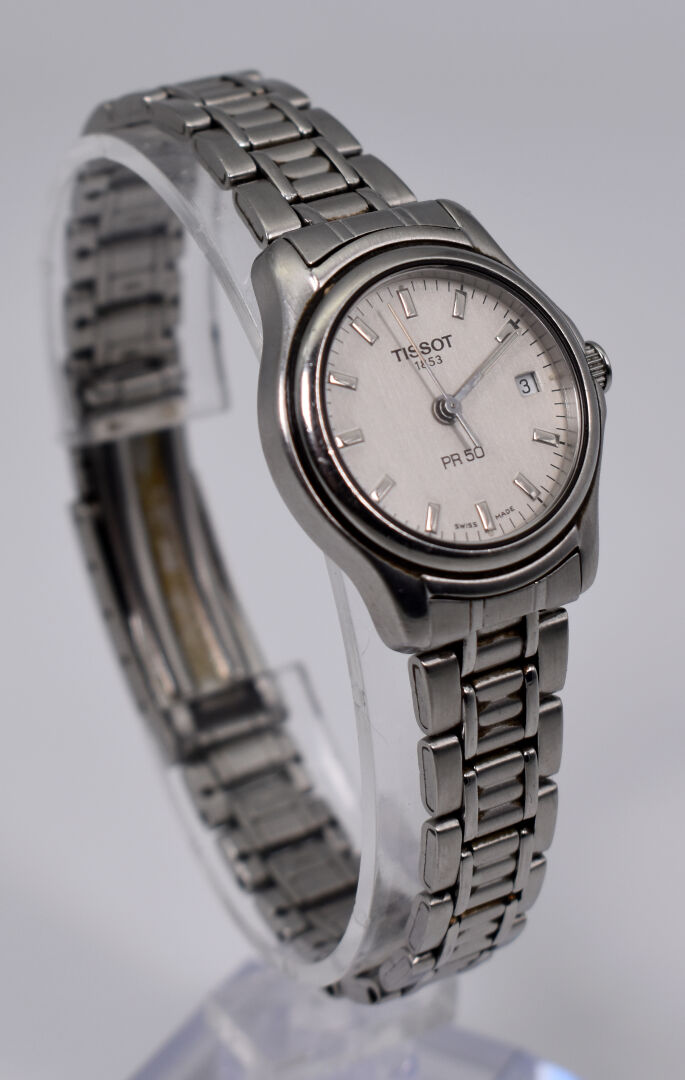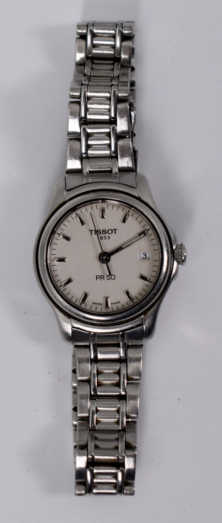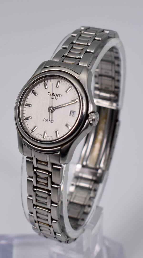 TISSOT. Montre bracelet de dame en acier, modèle PR 50. Cadran circulaire signé sur fond blanc, guichet date à 3 heures..