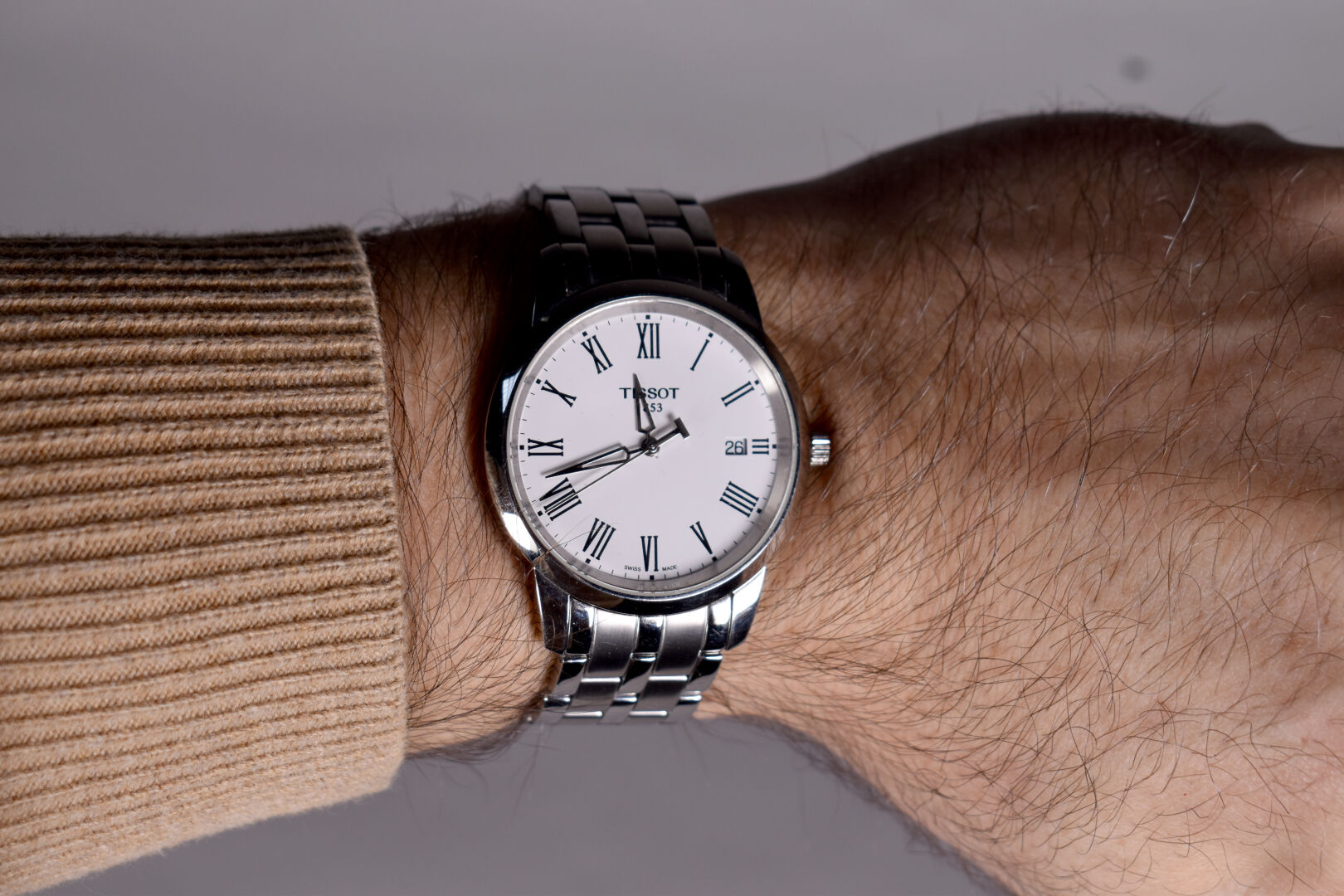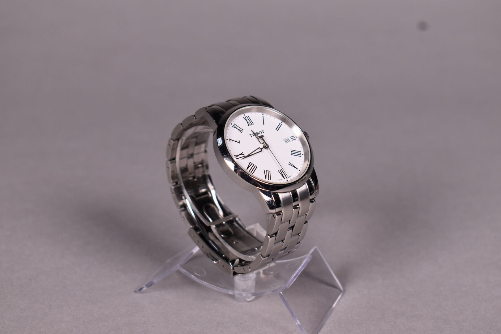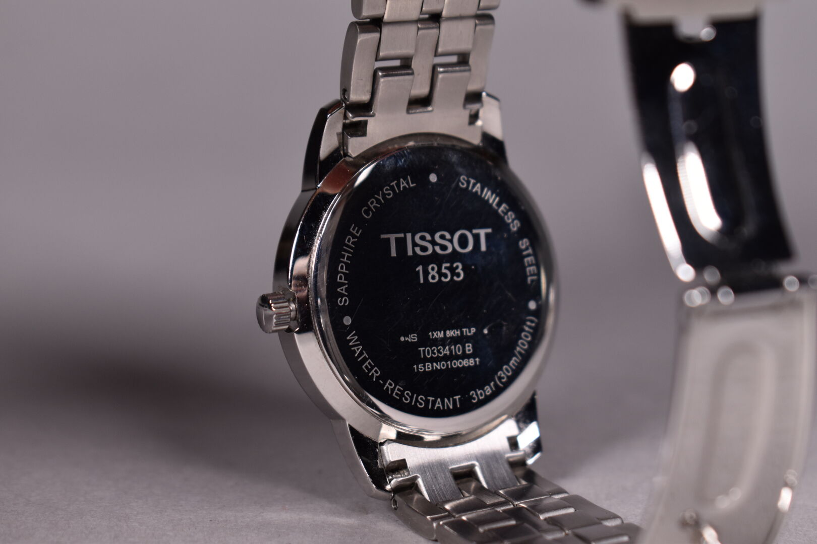 TISSOT. Montre bracelet d’homme en acier. Cadran signé sur fond blanc, guichet date à 3h. Mouvement à quartz (démarre).