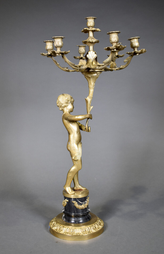 Torchère en bronze ciselé doré à 6 bras feuillagés et 7 lumières. Le fût formé par un putto sur une colonne en marbre noir. Style Louis XV, XXe siècle. Haut. : 79 cm.