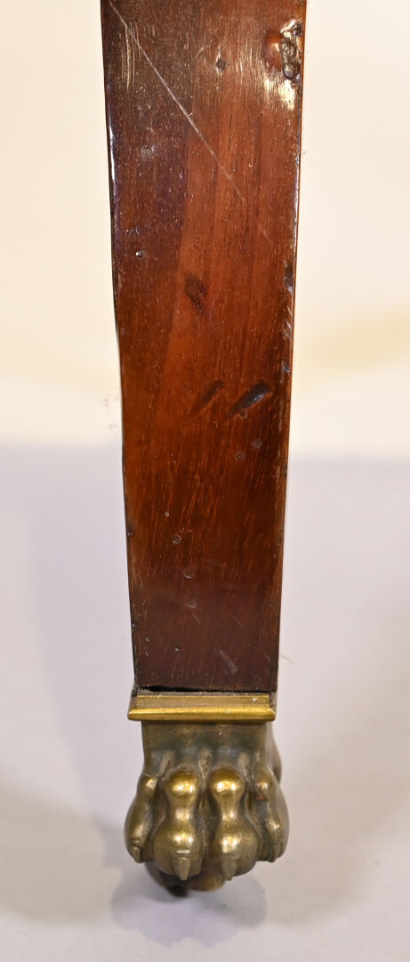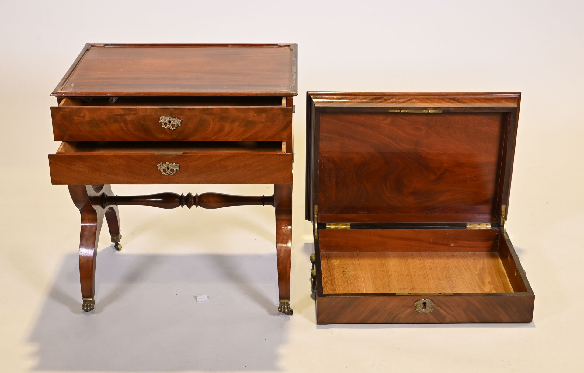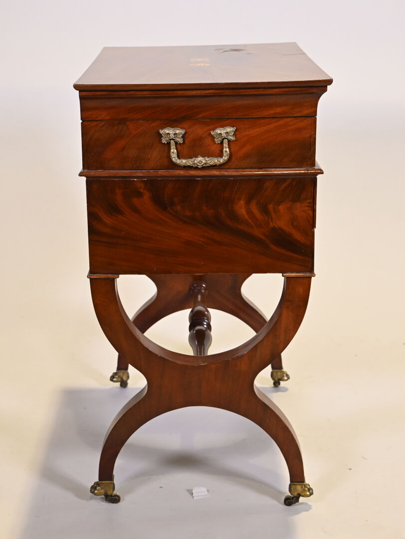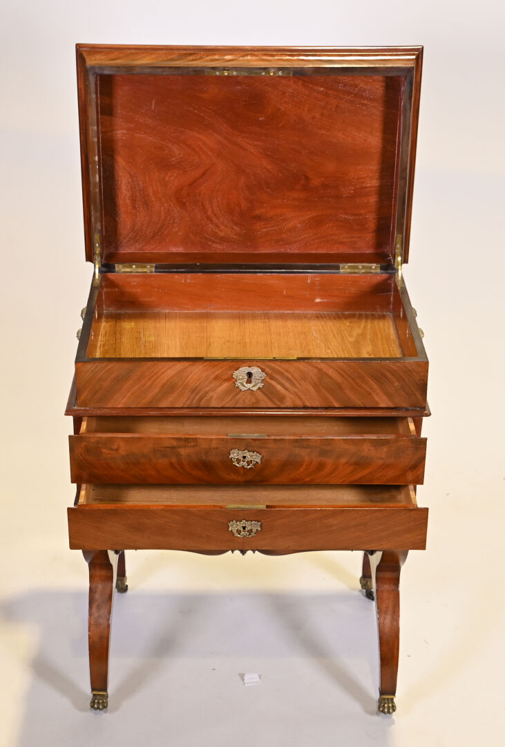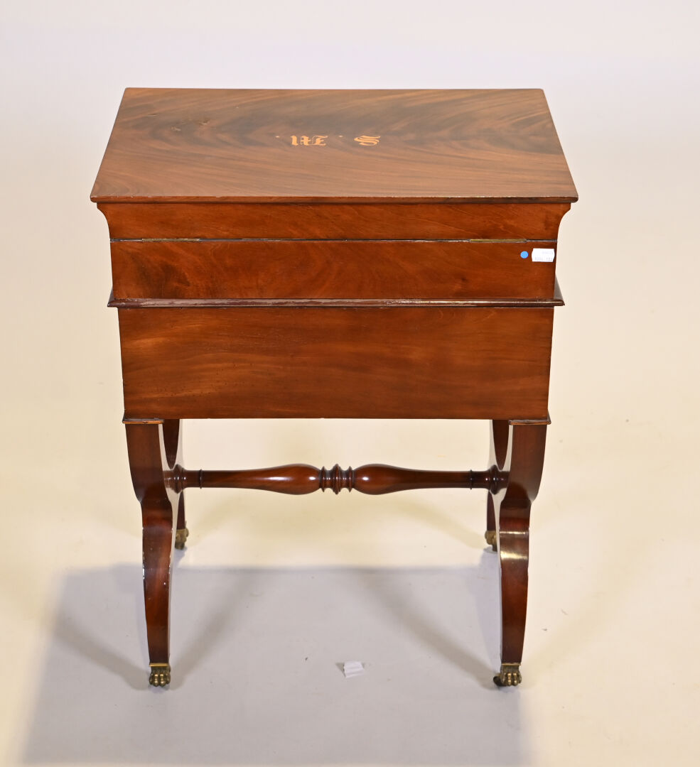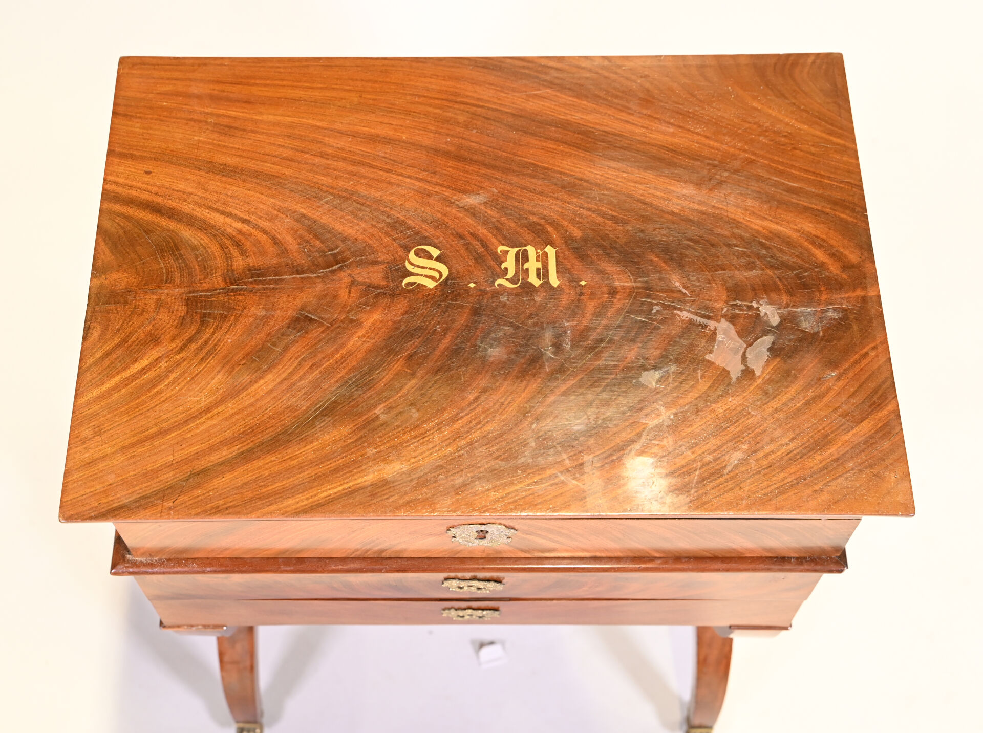 Travailleuse en acajou et placage d’acajou, le couvercle à charnières monogrammé de bois blond des lettres S.M (craquellements, petites usures). Elle ouvre à deux tiroirs et repose sur un piétement en X terminé par des griffes sur roulettes. XIXe siècle. Haut. : 72,5 cm – Larg. : 54 cm – Prof. : 37 cm.