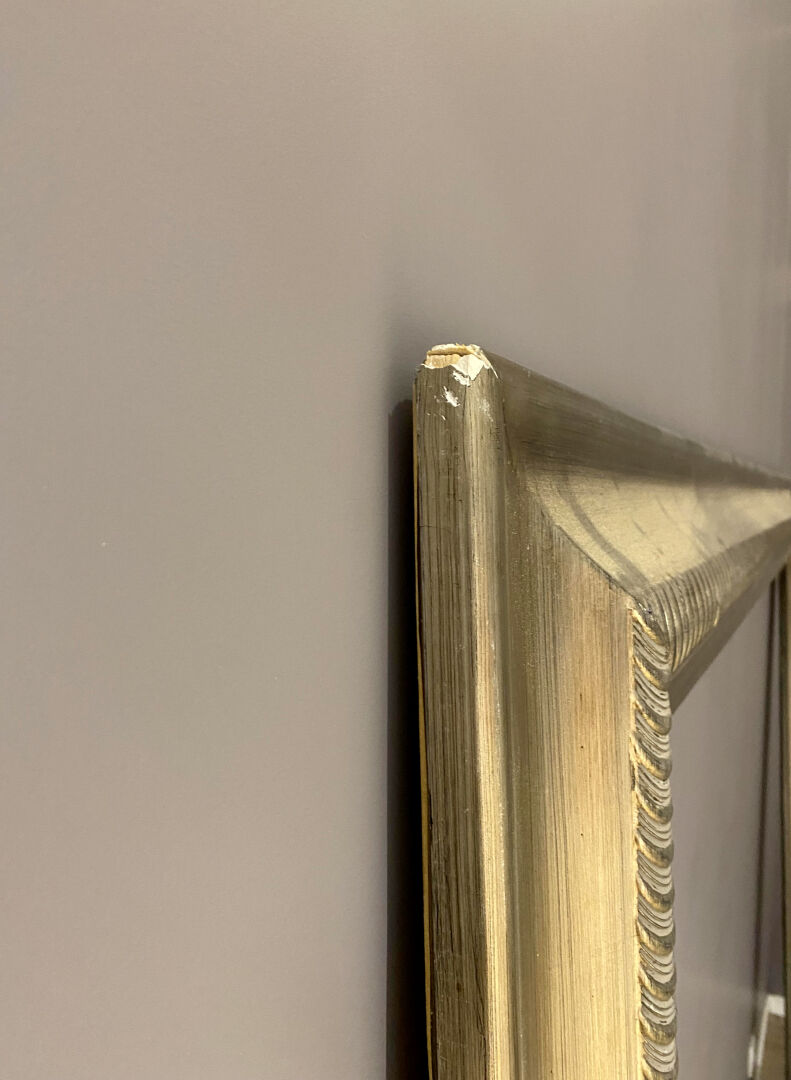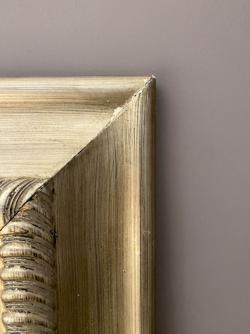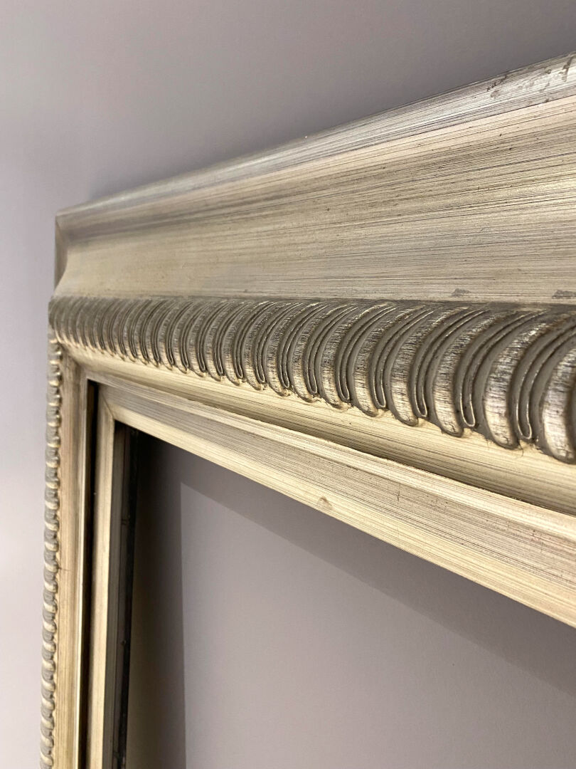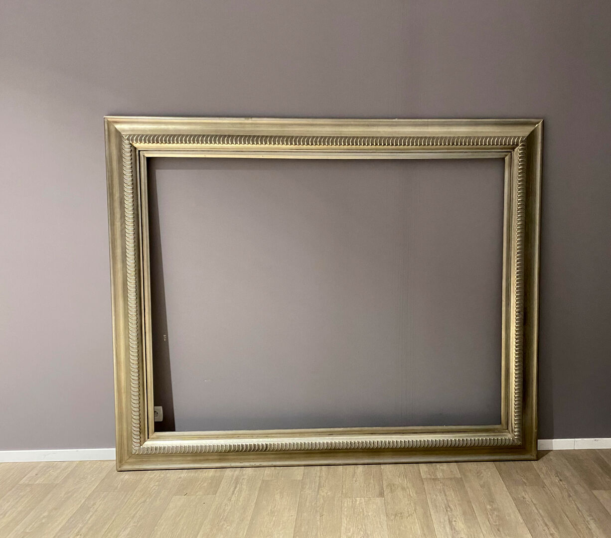 Très grand cadre en bois mouluré argenté (usures). 180 x 220 cm.
