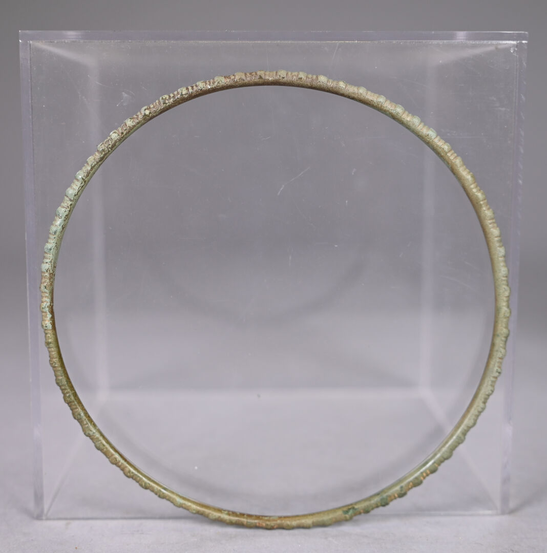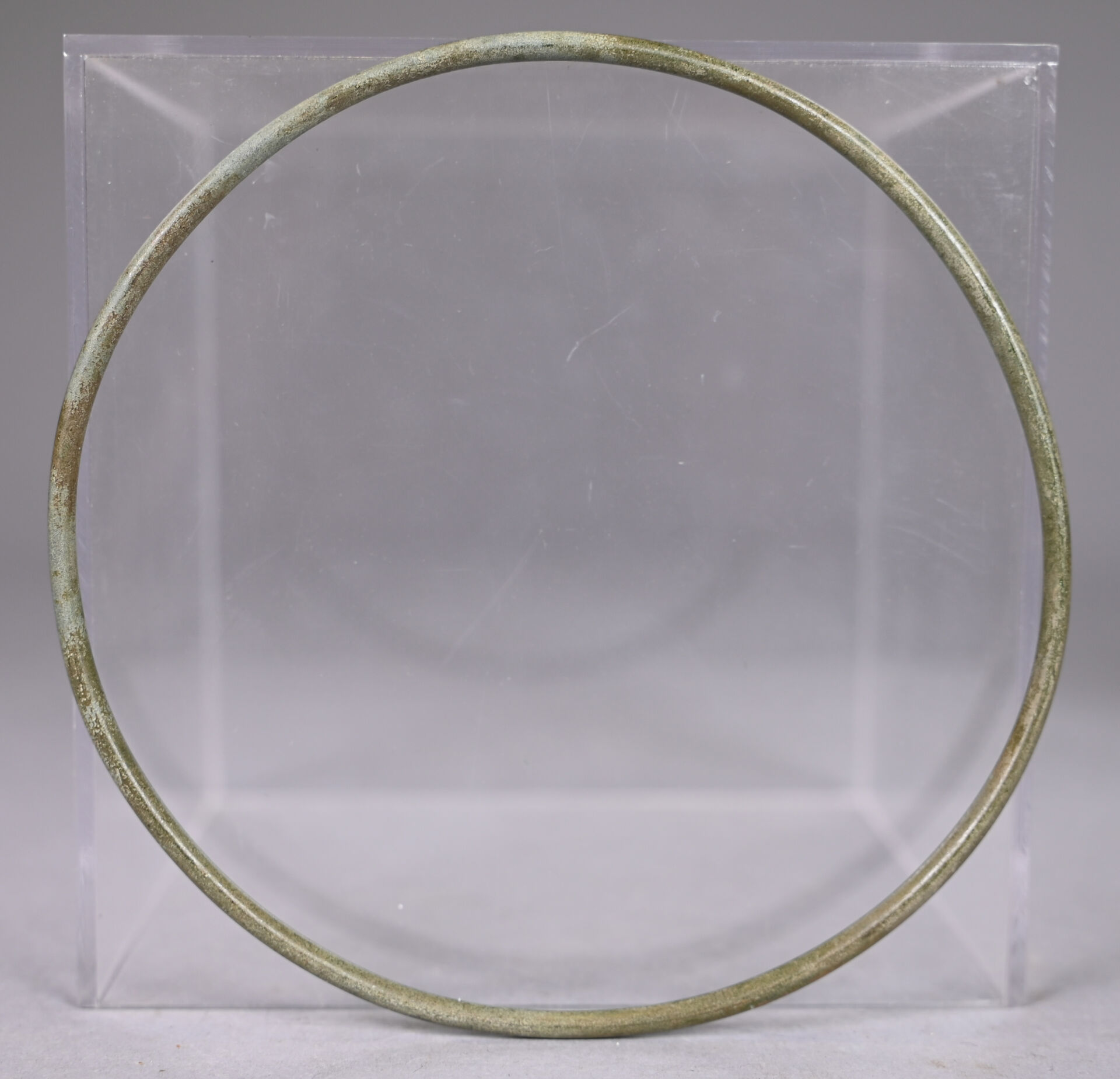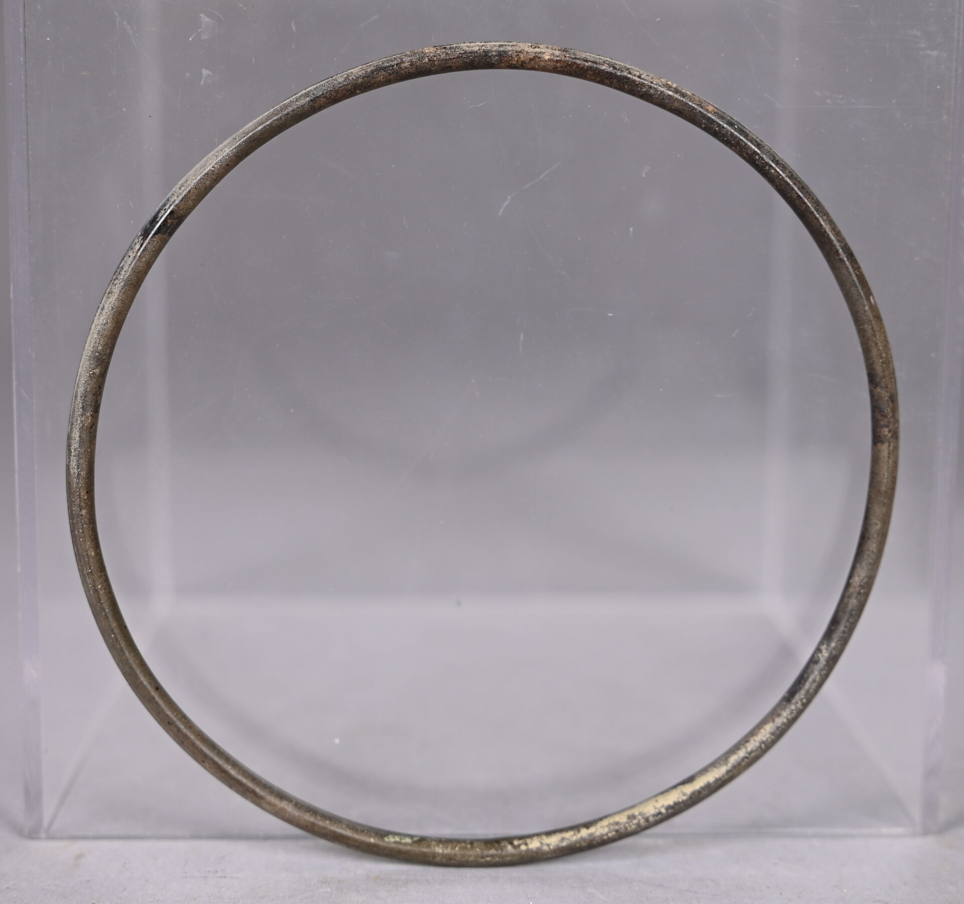 Trois anneaux en bronze de l’Age de Fer (v. le milieu du Ier millénaire av. J.-C.), l’un décoré de lignes transversales. Diam. : 5,2 cm., 4,7 cm. et 4,3 cm.