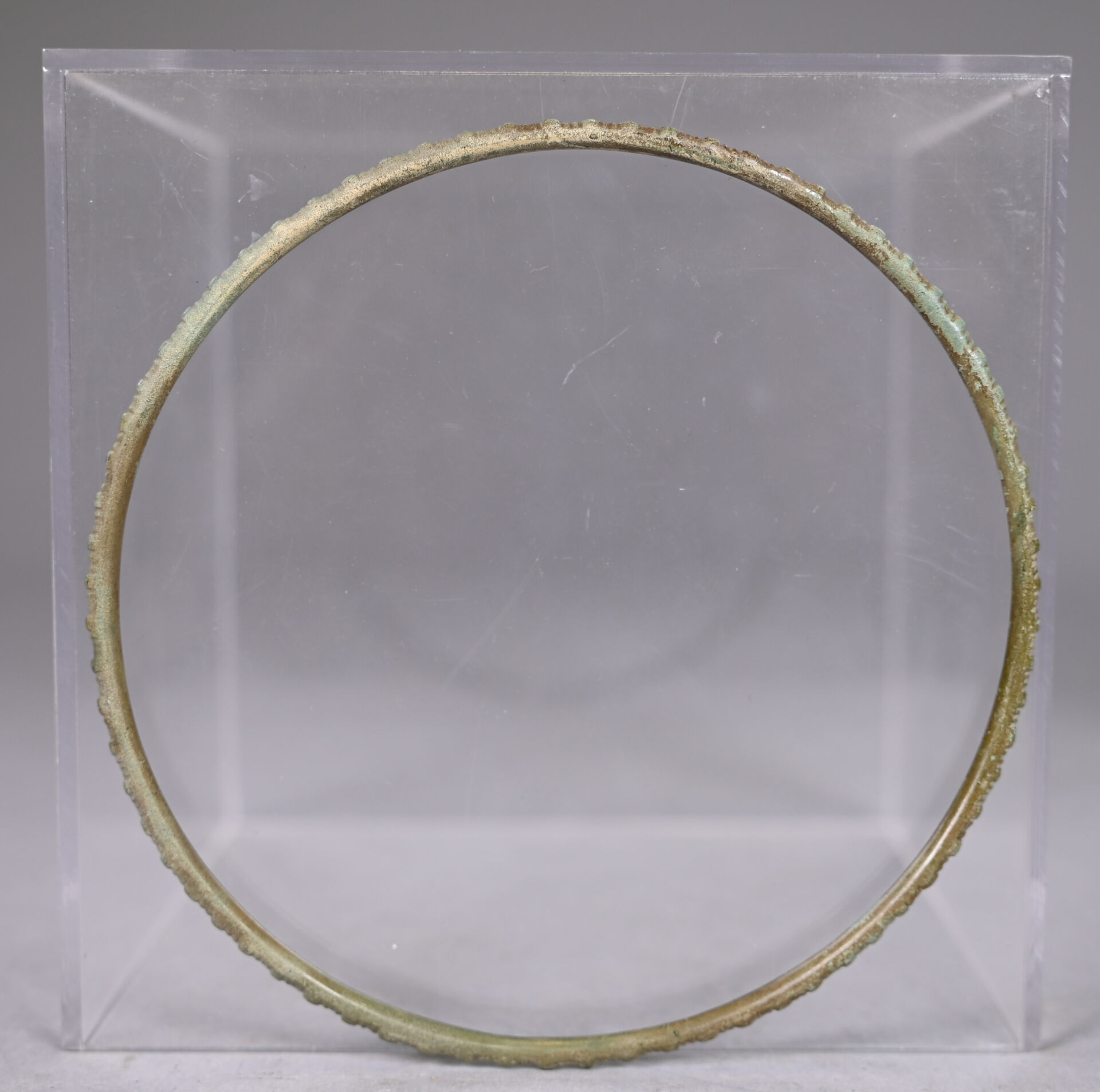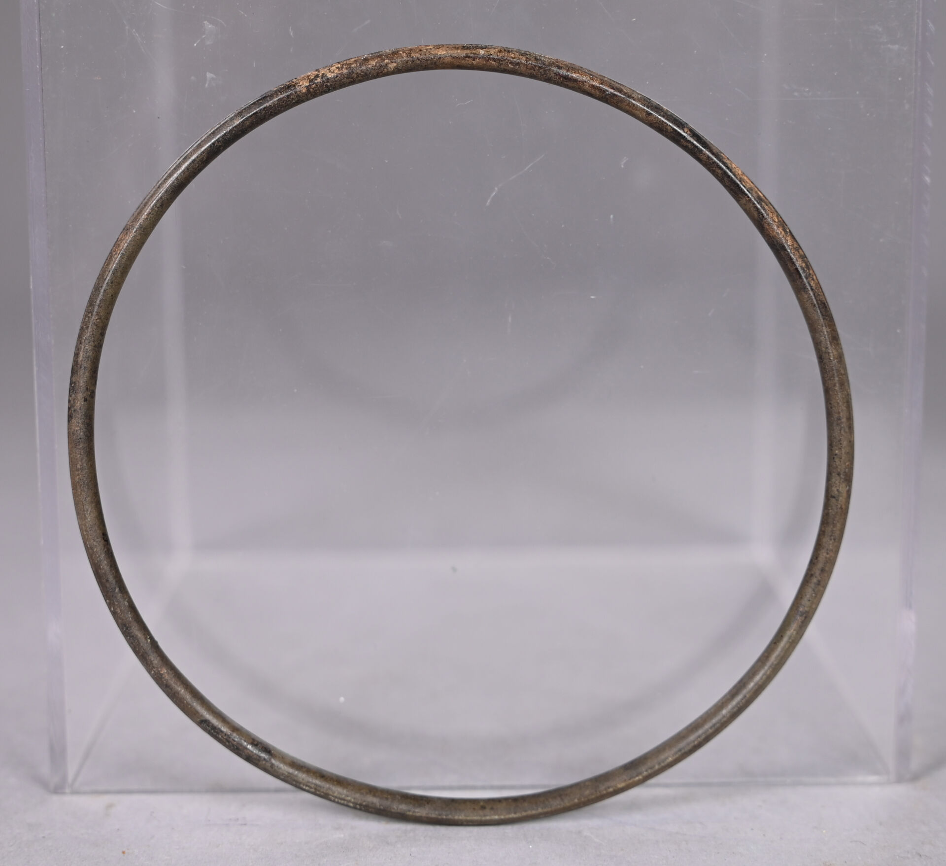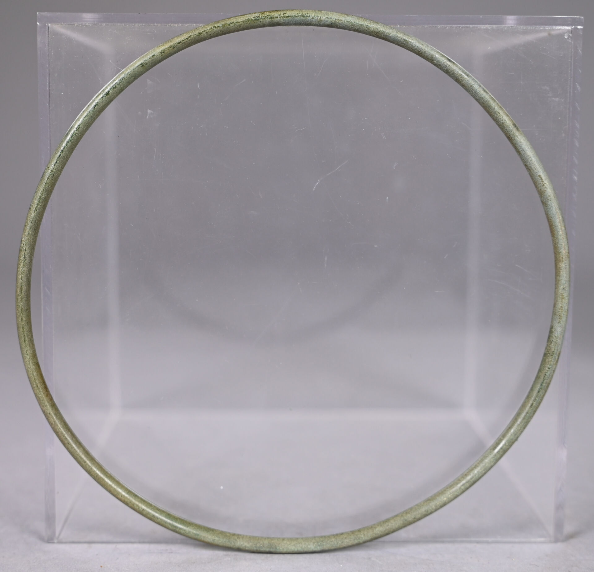 Trois anneaux en bronze de l’Age de Fer (v. le milieu du Ier millénaire av. J.-C.), l’un décoré de lignes transversales. Diam. : 5,2 cm., 4,7 cm. et 4,3 cm.