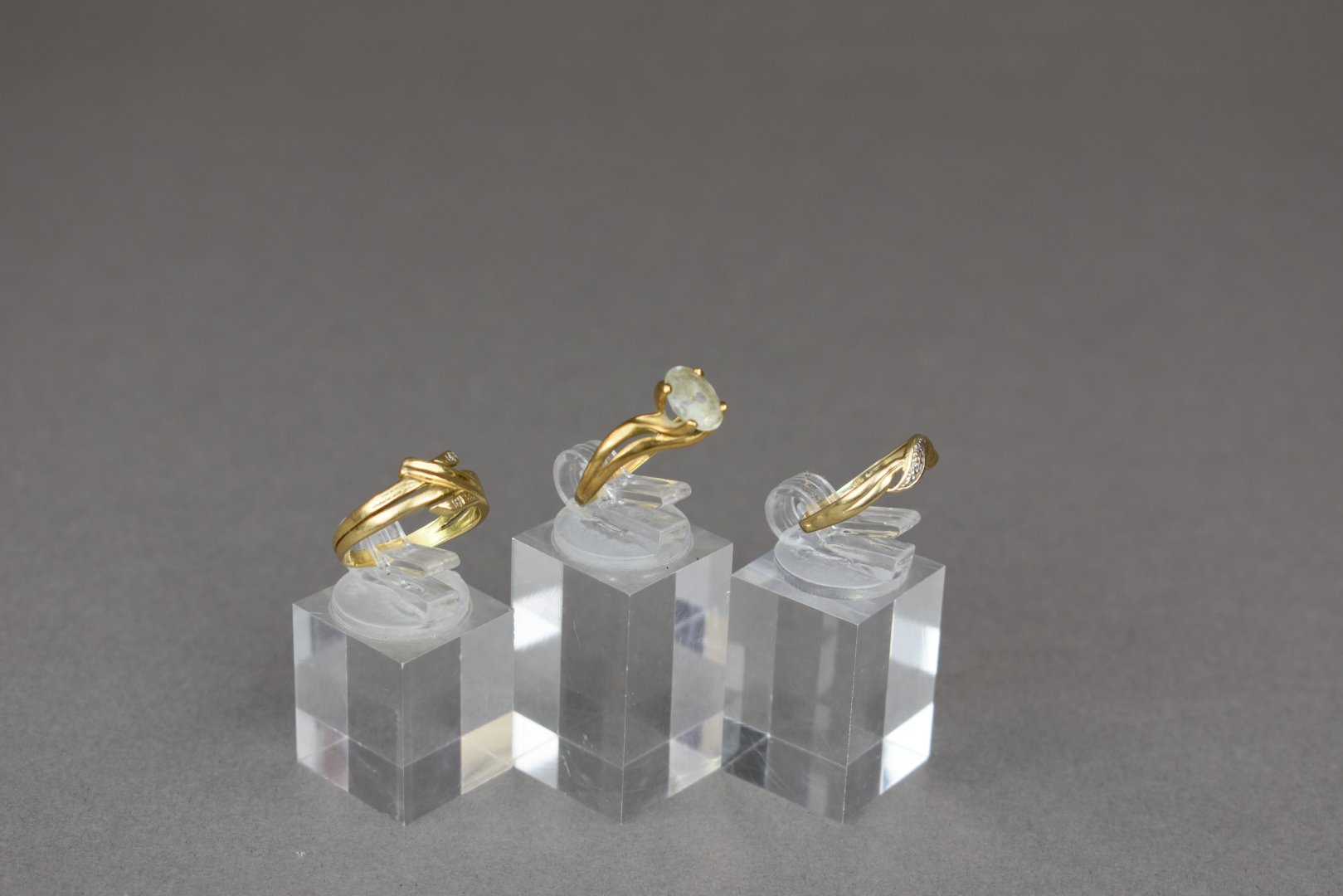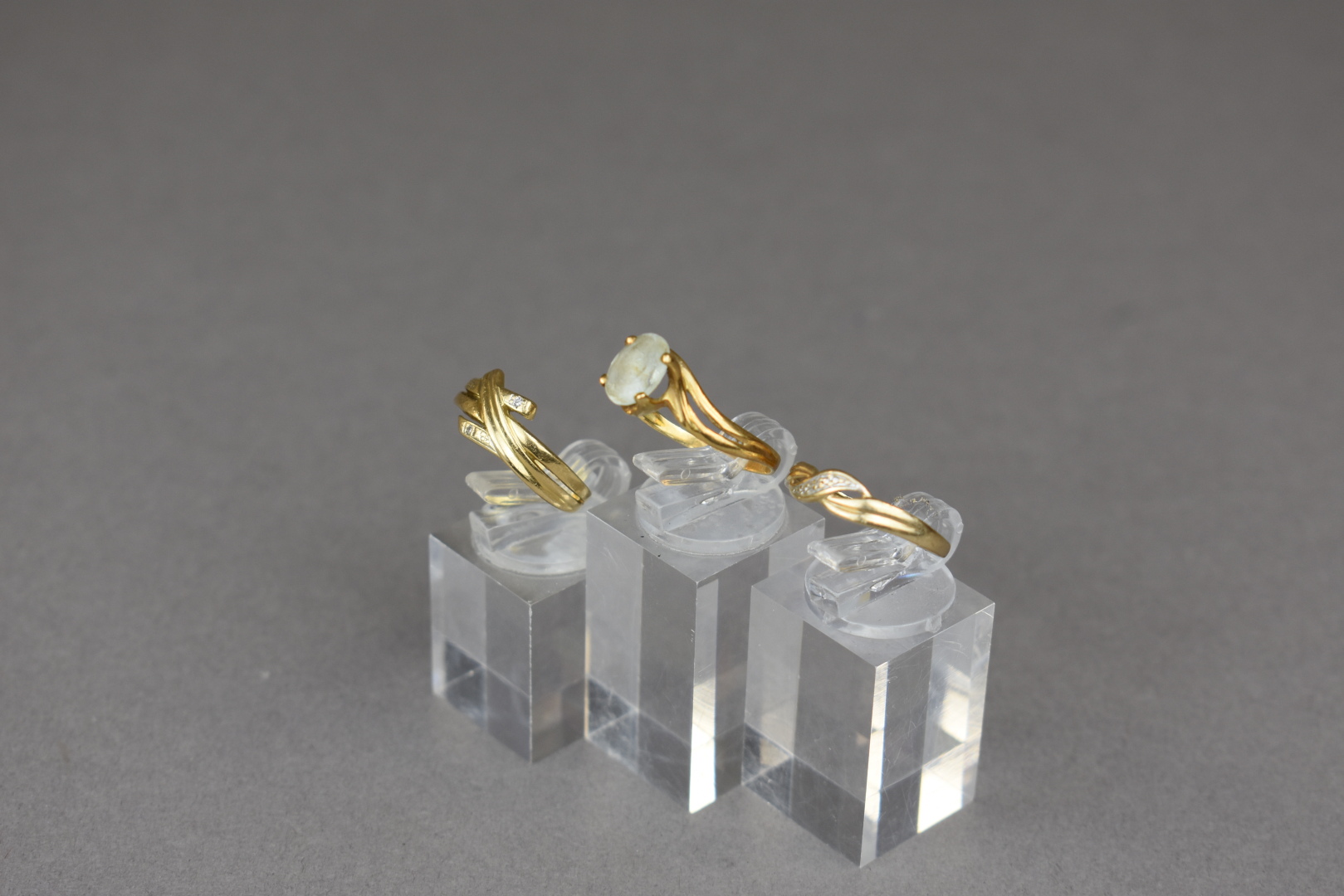 Trois bagues en or jaune 18K 750/1000e, une ornée d’une pierre blanche de forme ovale, une autre ornée de deux très petits éclats de diamants. TDD. 58 et 57. Poids brut : 6,60 g.