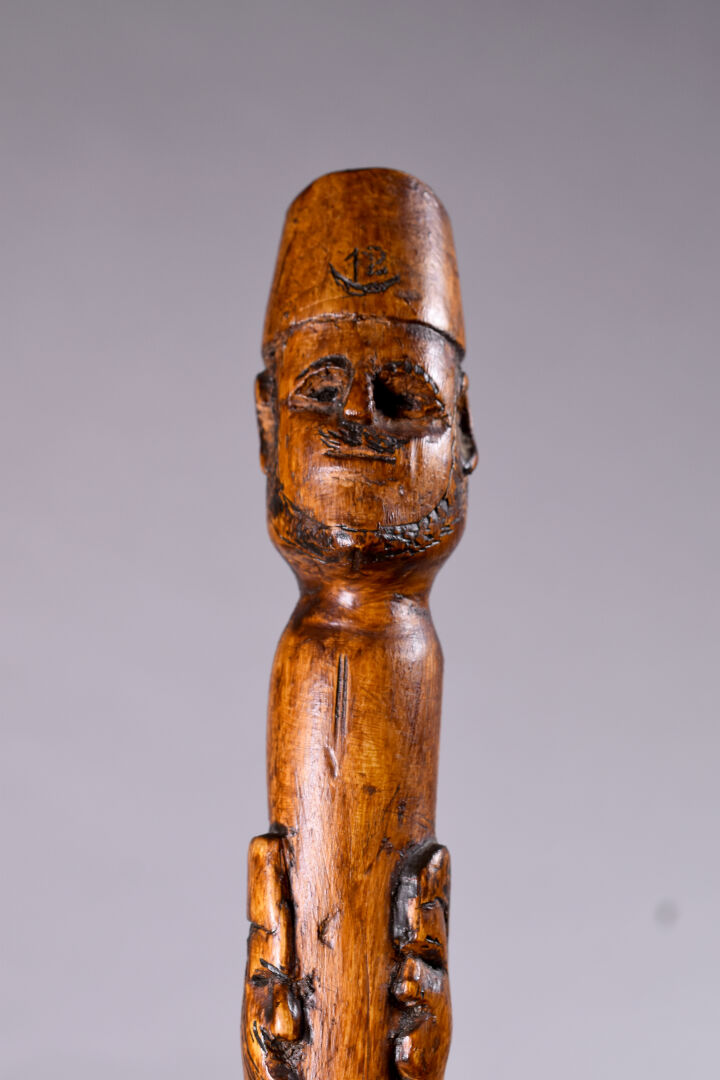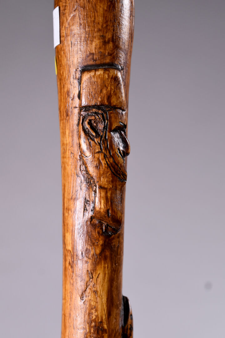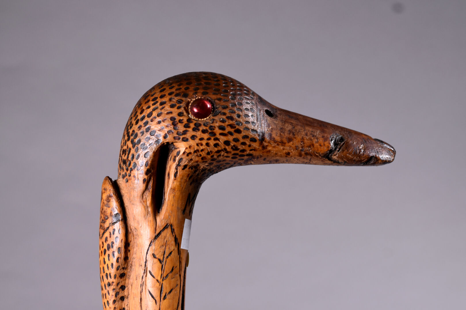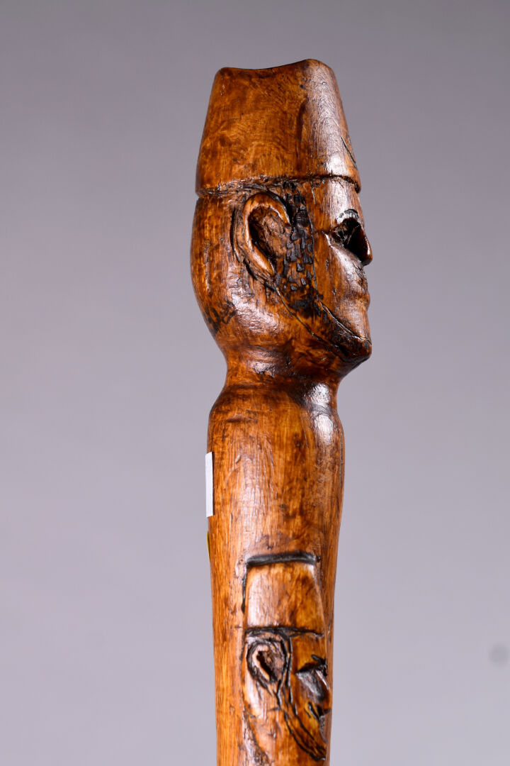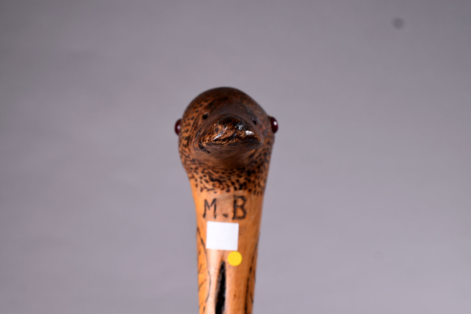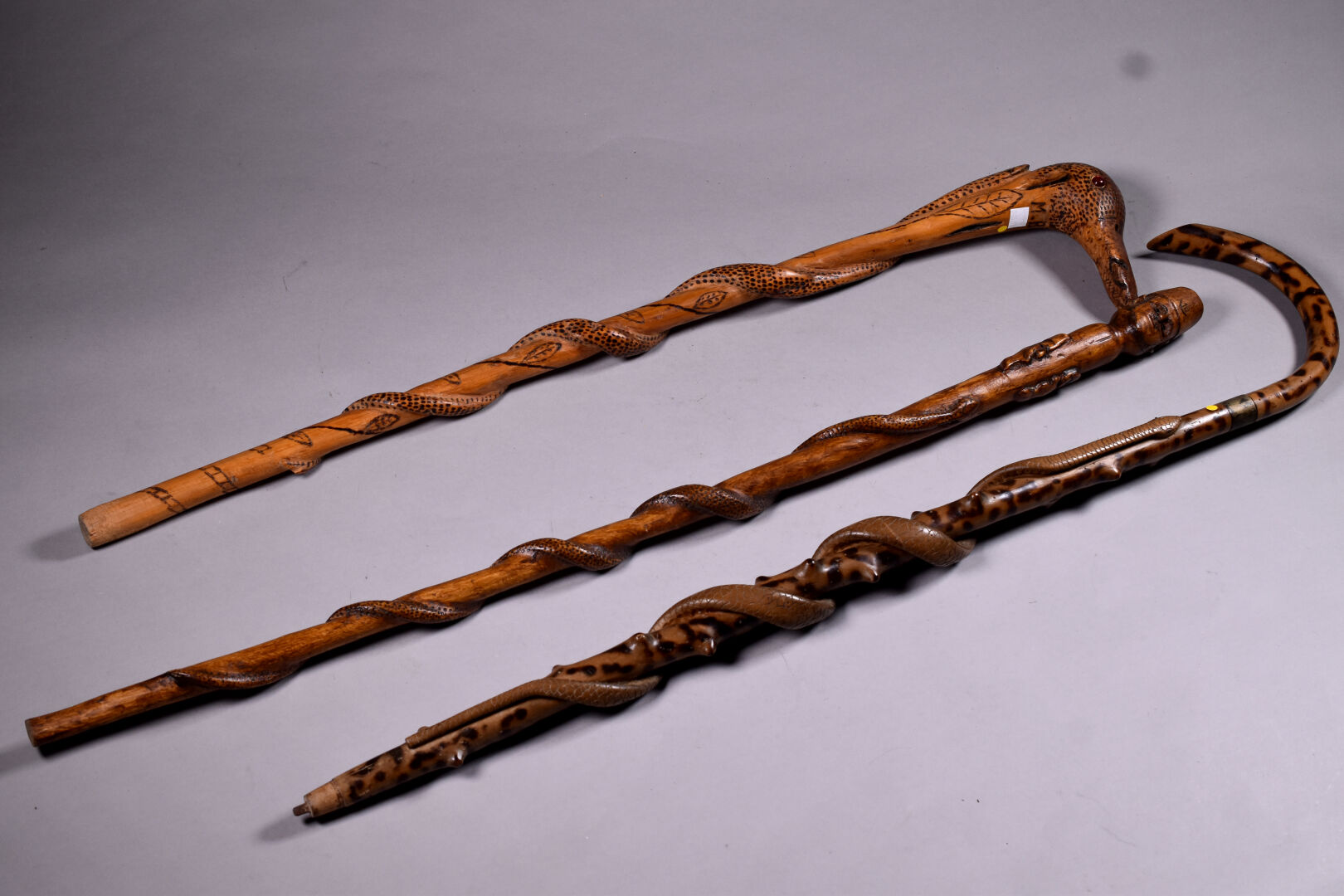 Trois cannes de poilu, une à tête de cane, les yeux en verre appliqués, une à tête de tirailleur sculpté et la dernière à décor d’un serpent. Long. : 89 cm – 98 cm – 95,5 cm.