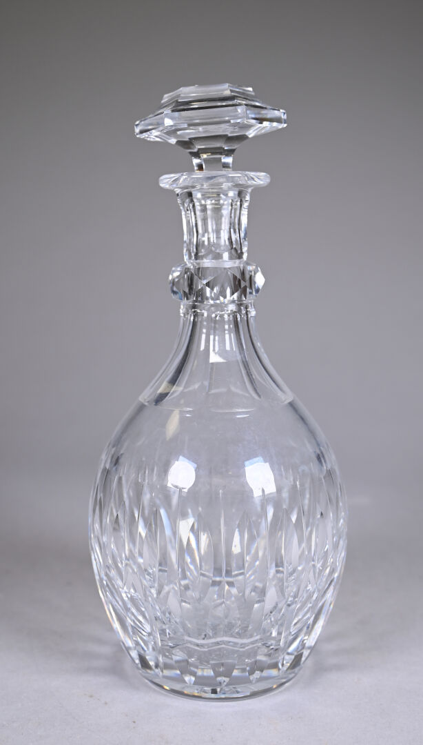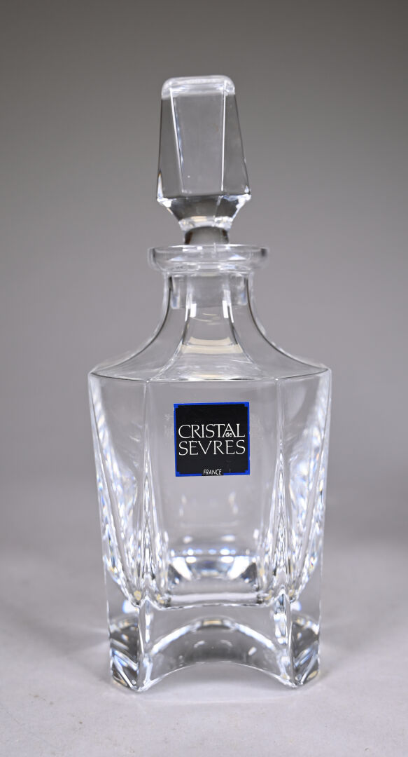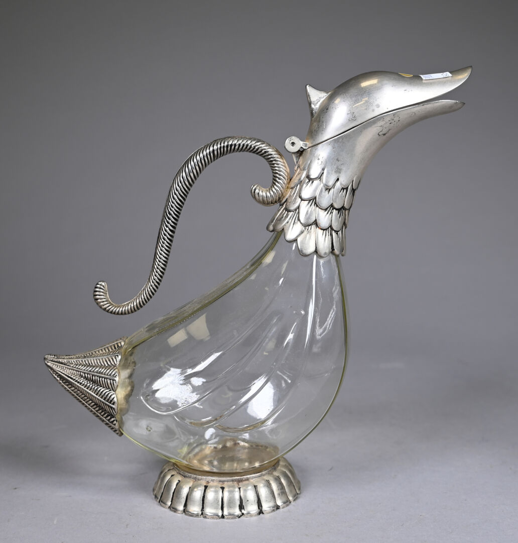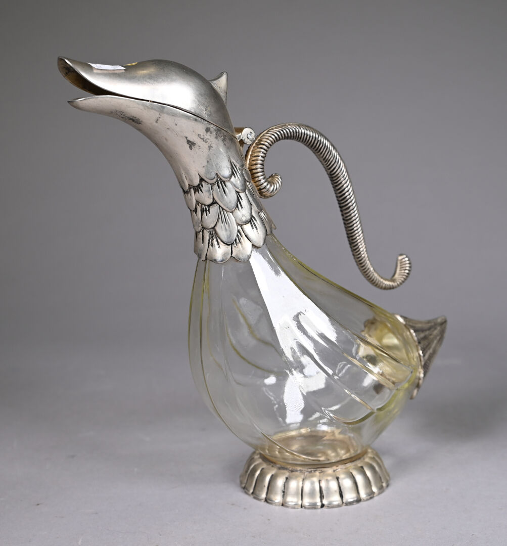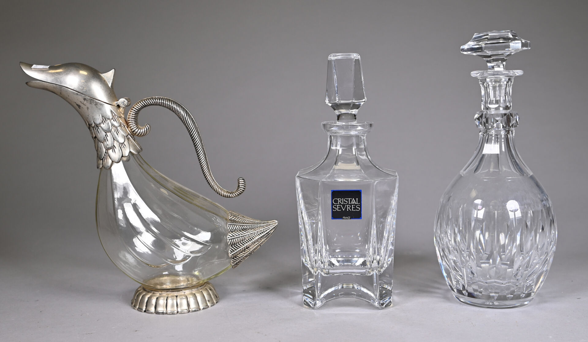 Trois carafes, deux en cristal soit une dans le goût de SAINT-LOUIS, une SEVRES et une en verre zoomorphe à monture en métal. Haut. de la plus grande. : 28,5 cm.