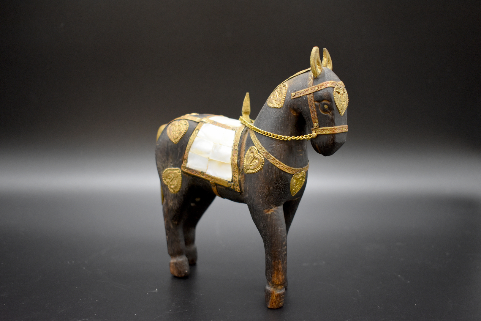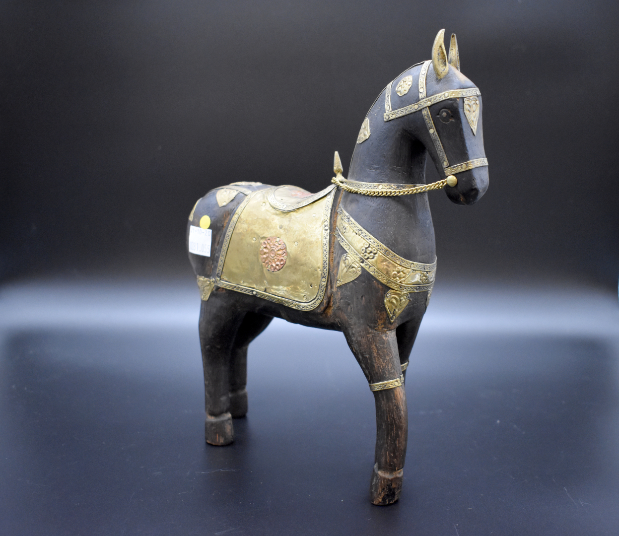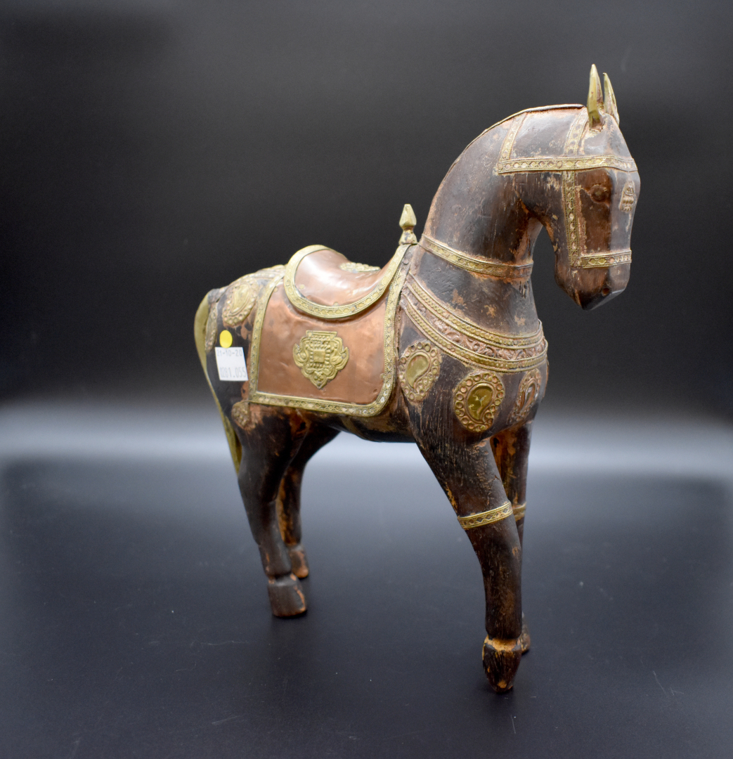 Trois chevaux en bois sculpté, cuivre et laiton martelé. Inde ? XXe siècle. Haut. moyenne : 26 cm.