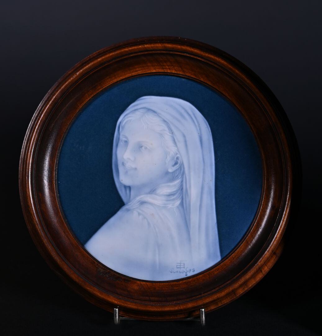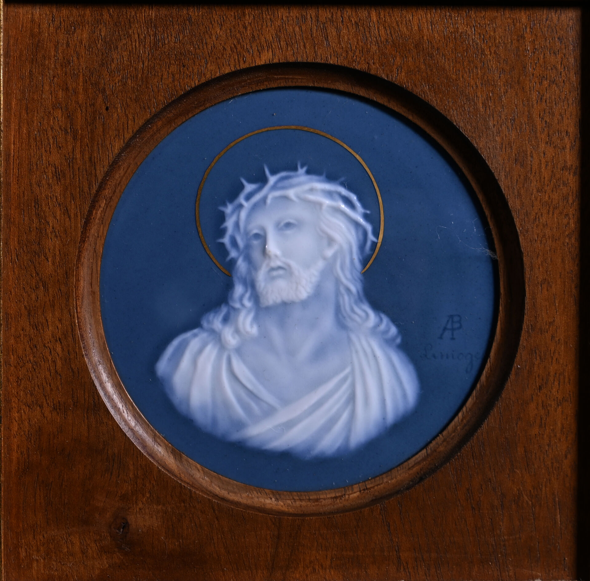 Trois médaillons en porcelaine à décor en blanc sur fond bleu façon camée, soit deux représentant la Vierge et le dernier un Christ aux épines. Monogrammés. Diam. : 14,5 cm et 9 cm à vue.