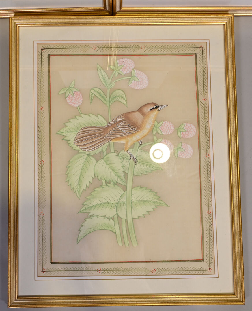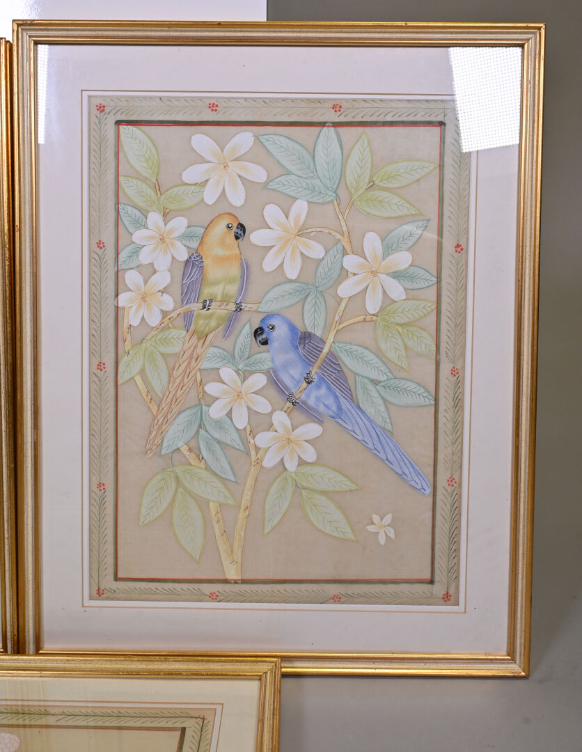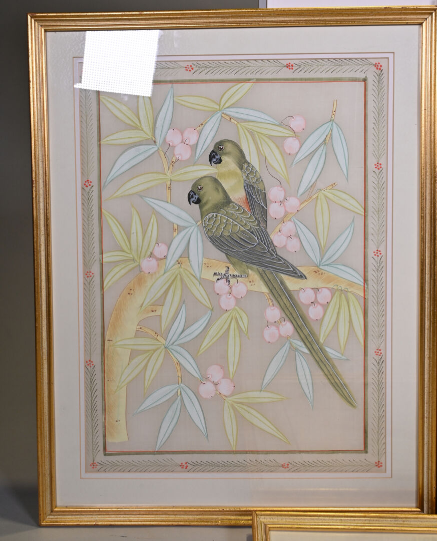 Trois peintures sur soie (?) représentant des oiseaux branchés parmi les fleurs. 50 x 37 cm à vue.