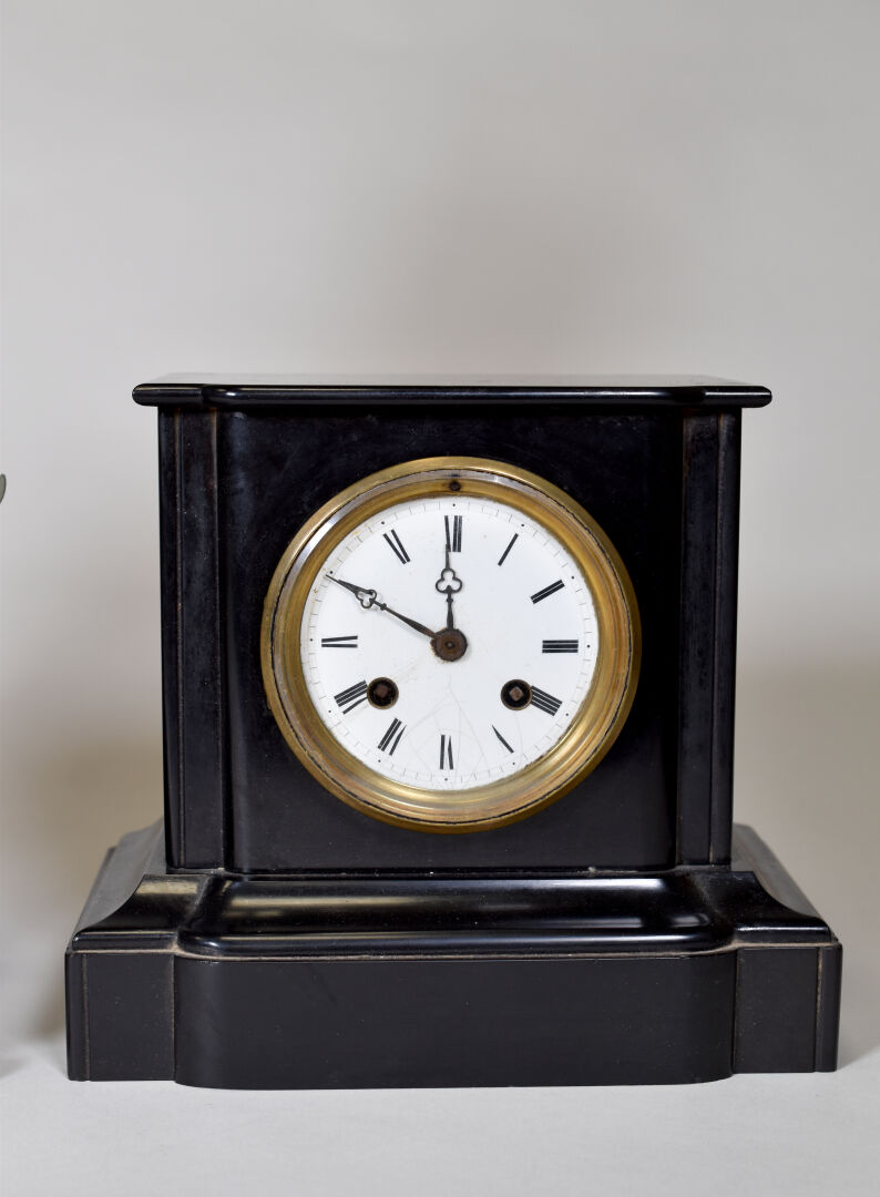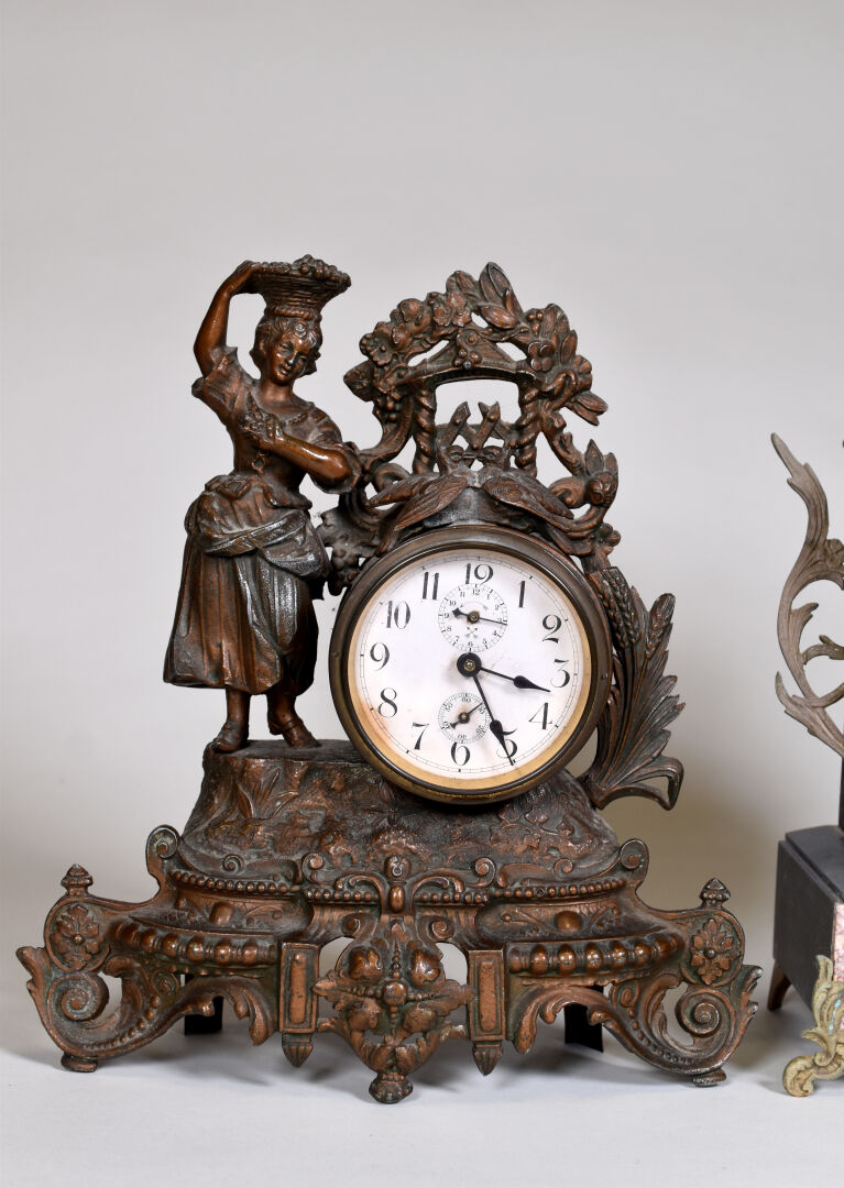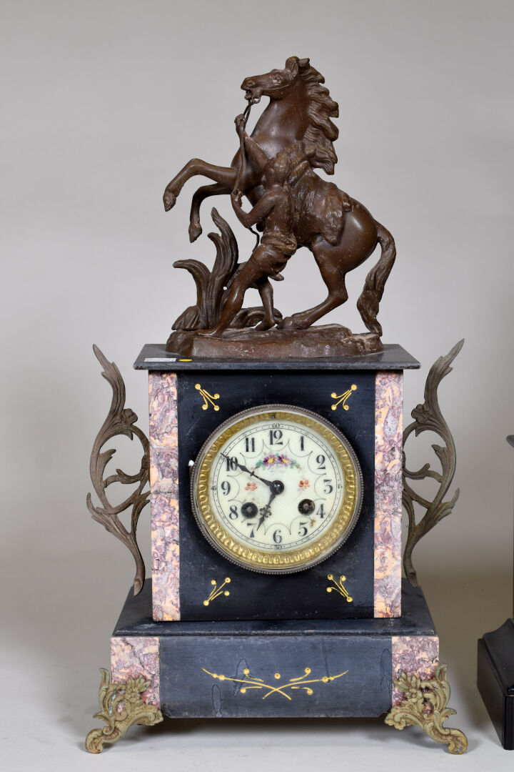 Trois pendules, une en onyx ornée d’un régule figurant le cheval de Marly, une borne en pierre dure noire et une en métal patiné brun médaille orné d’une figure de paysanne. Fin du XIXe ou début du XXe siècle. Haut. : 46 cm , 20 cm et 33 cm.