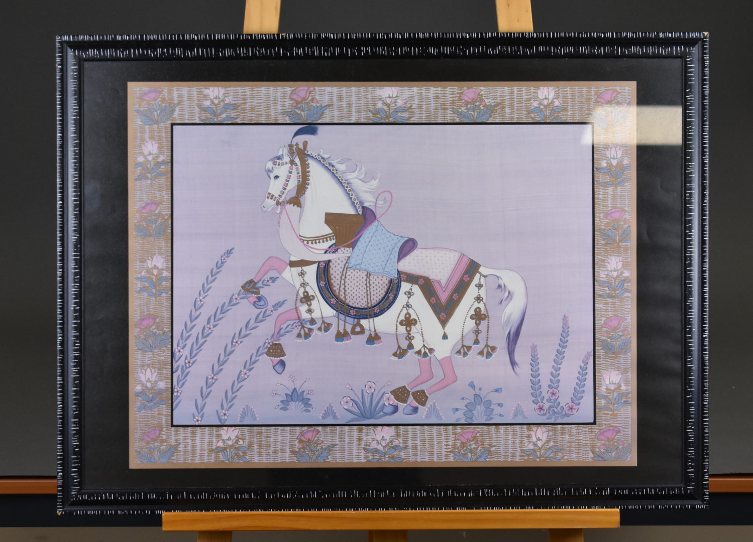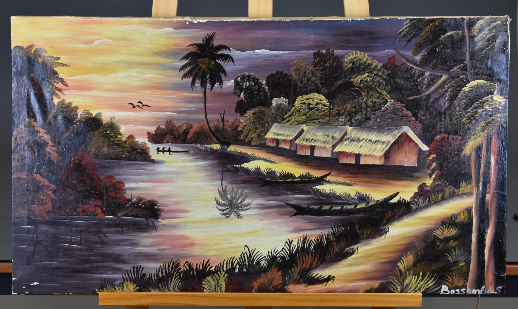 Trois pièces encadrées soit deux huiles souvenirs de voyage au Cameroun et une reproduction.