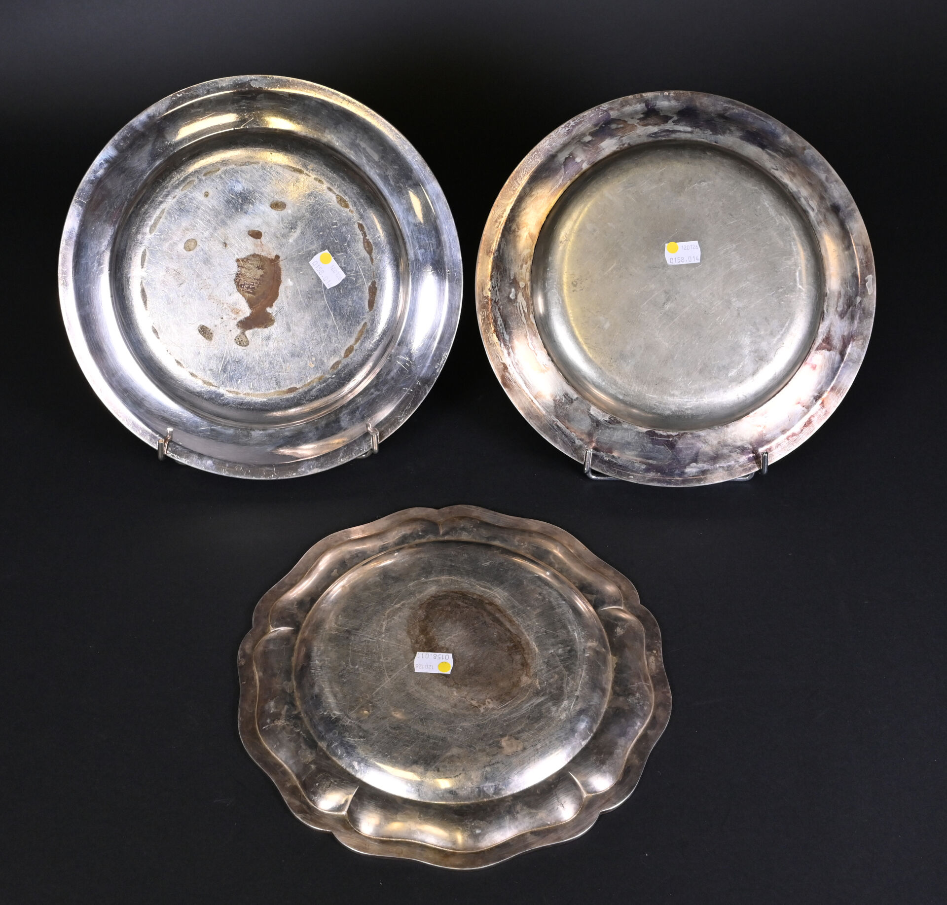 Trois plats en métal argenté dont un gravé « Georges V » (usures), ERCUIS, CHRISTOFLE et FELIX FRERES.