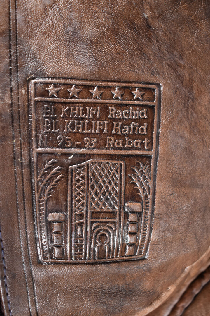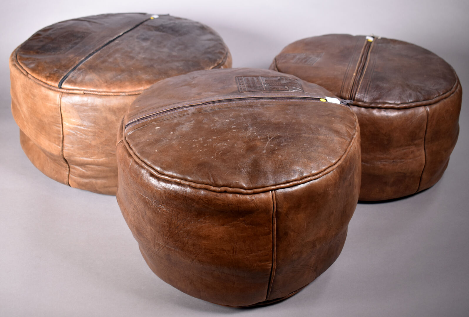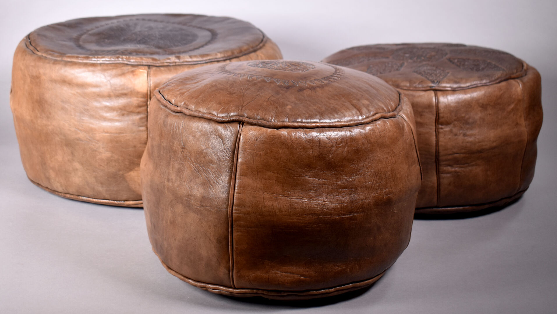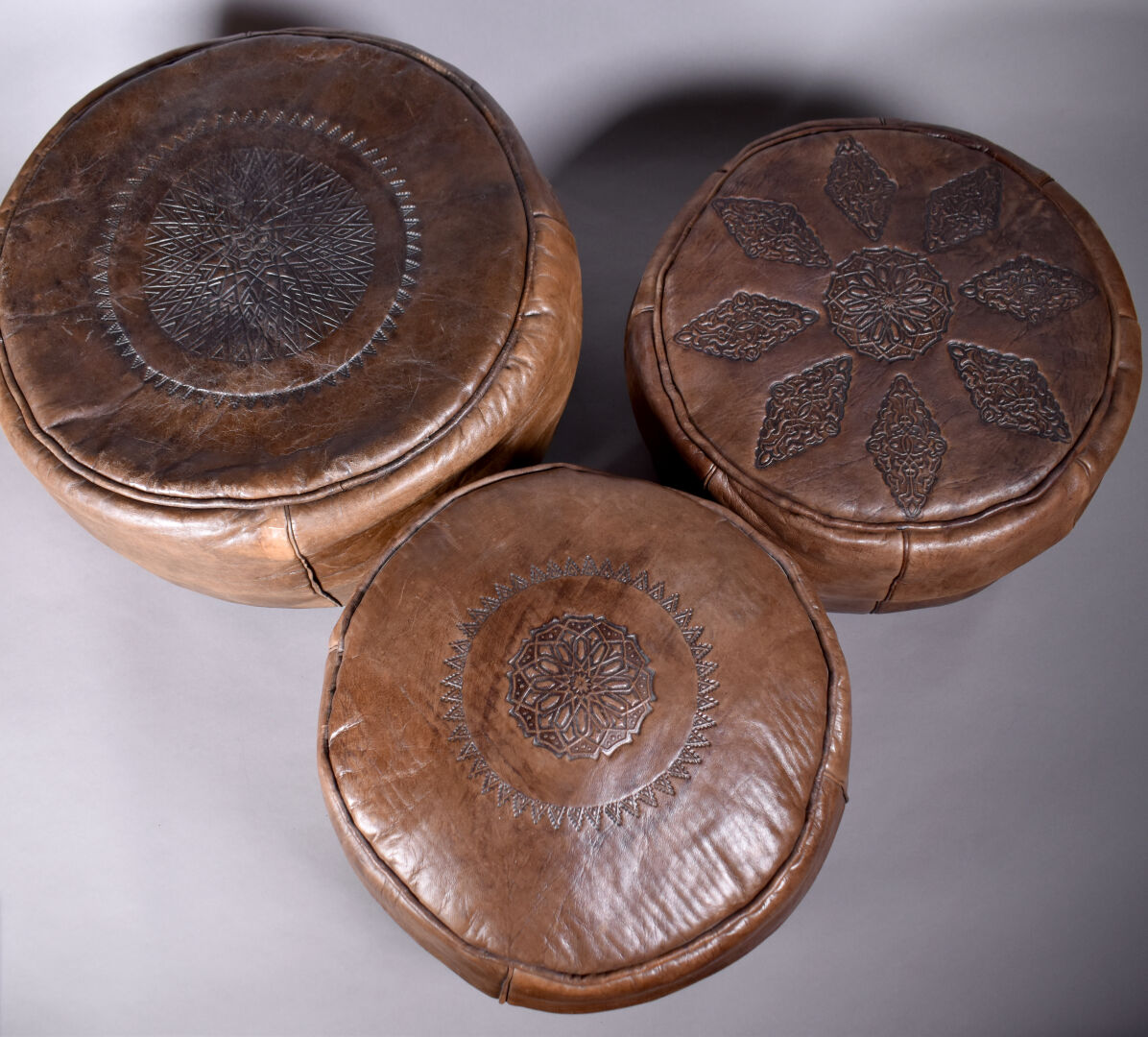 Trois poufs en cuir chocolat (usures). Maroc, XXe siècle. Haut. du plus grand : 25 cm – Diam. : 44 cm.