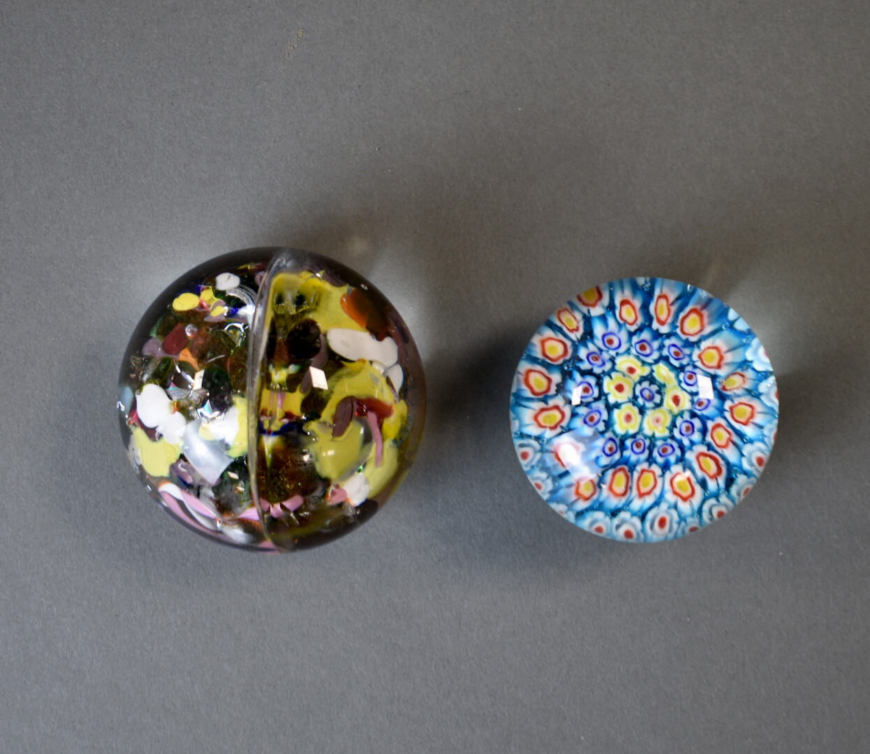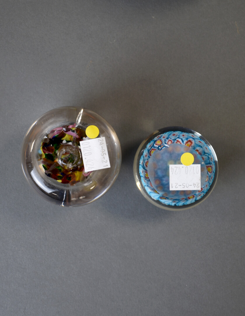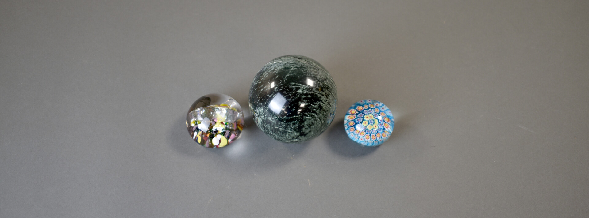 Trois presse-papier soit deux sulfures modernes et une sphere de marbre vert-gris. Diam. sphère : 9,5 cm.