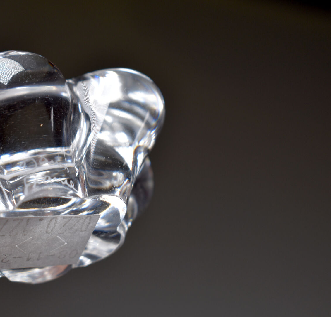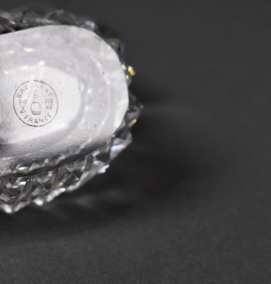 Trois salerons en cristal moulé, deux DAUM FRANCE avec leurs cuillères et un BACCARAT.