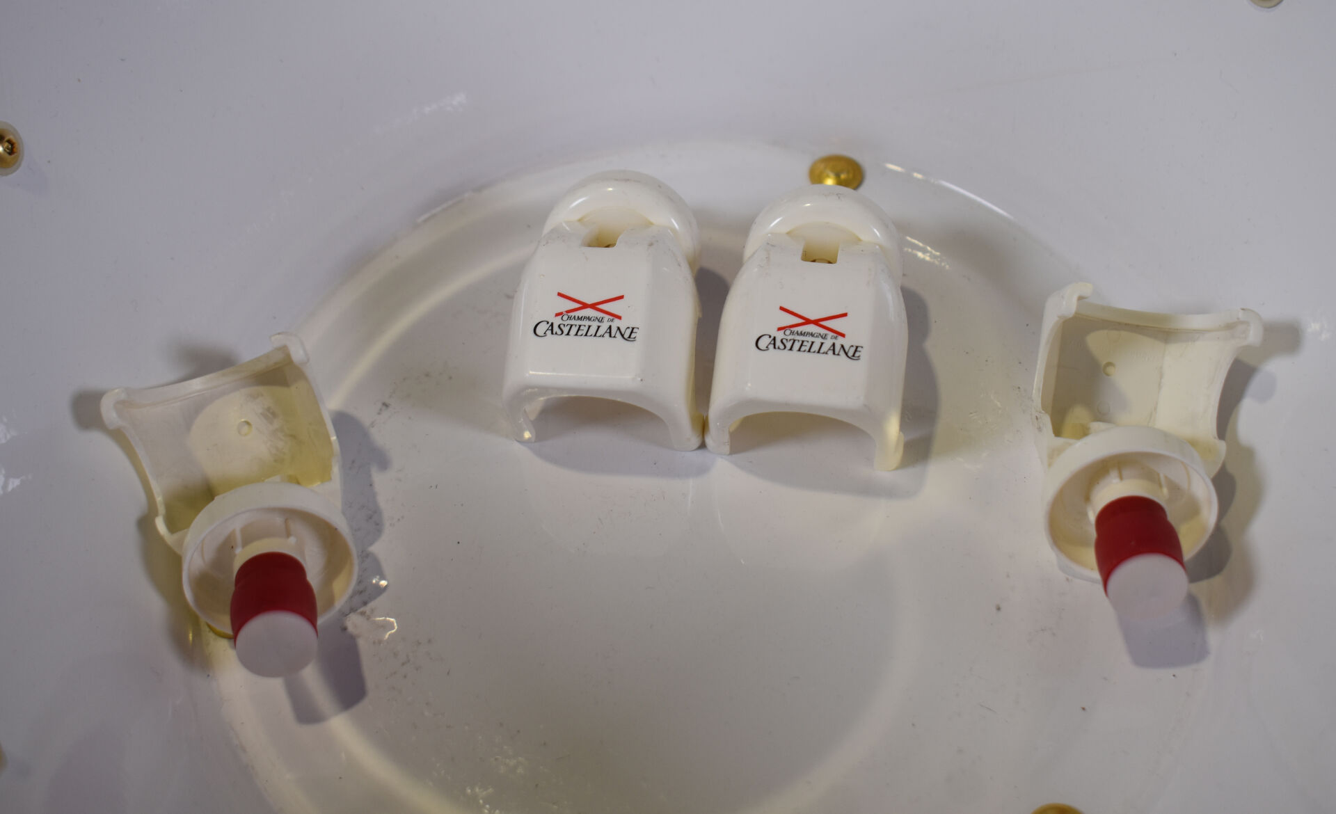 Trois seaux à champagne VCOMTE De CASTELLANE en métal laqué crème et doré. Signés. Haut. : 20,5 cm – Diam. : 40 cm (pour le plus grand). On joint des bouchons.