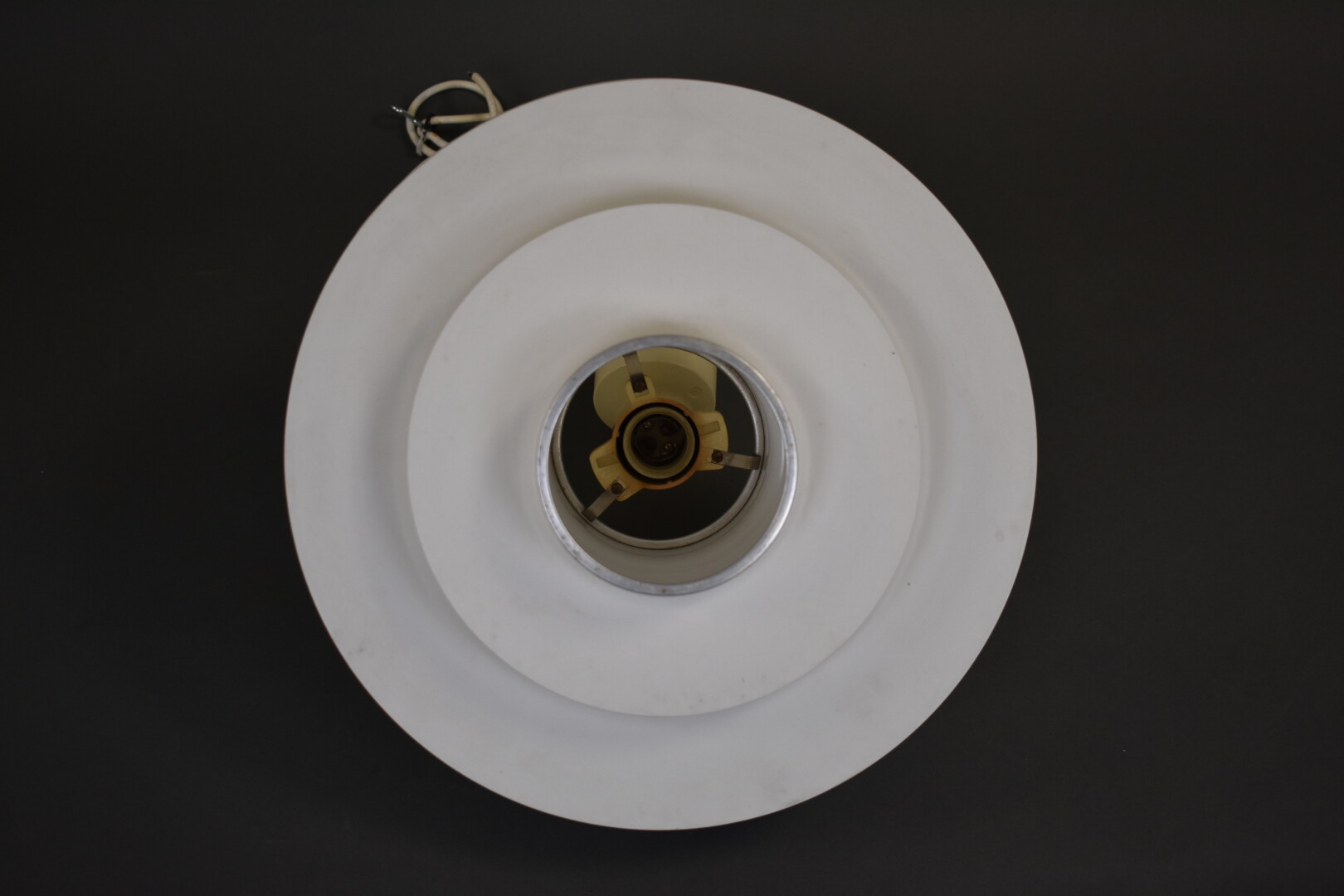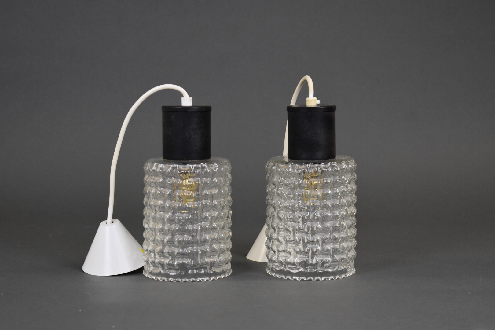 Trois suspensions soit une paire cylindrique en verre moulé, et une disque en pvc crème à deux lamelles de bois. Vers 1970. Haut. : 56,5 cm – et Haut. : 71 cm.