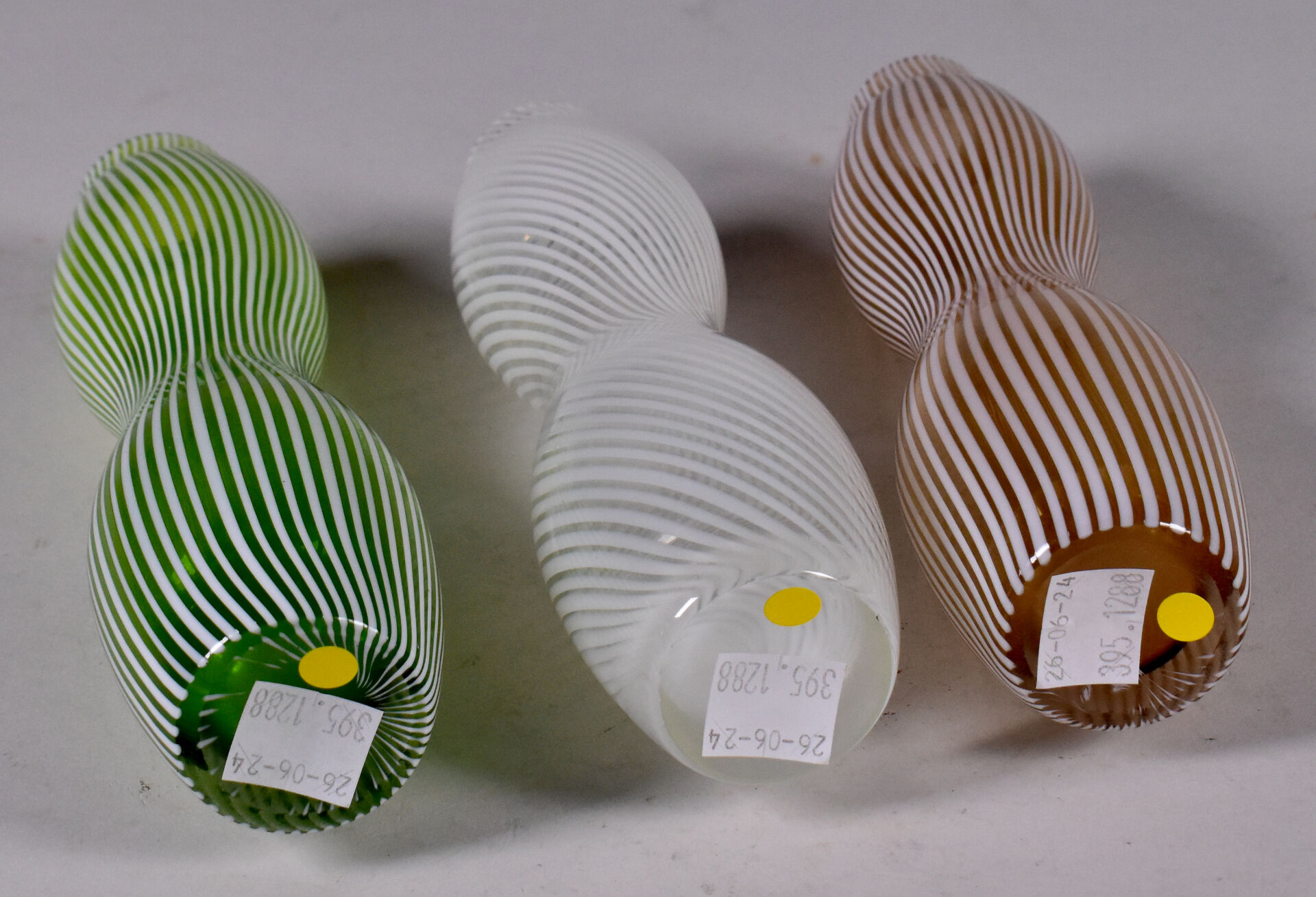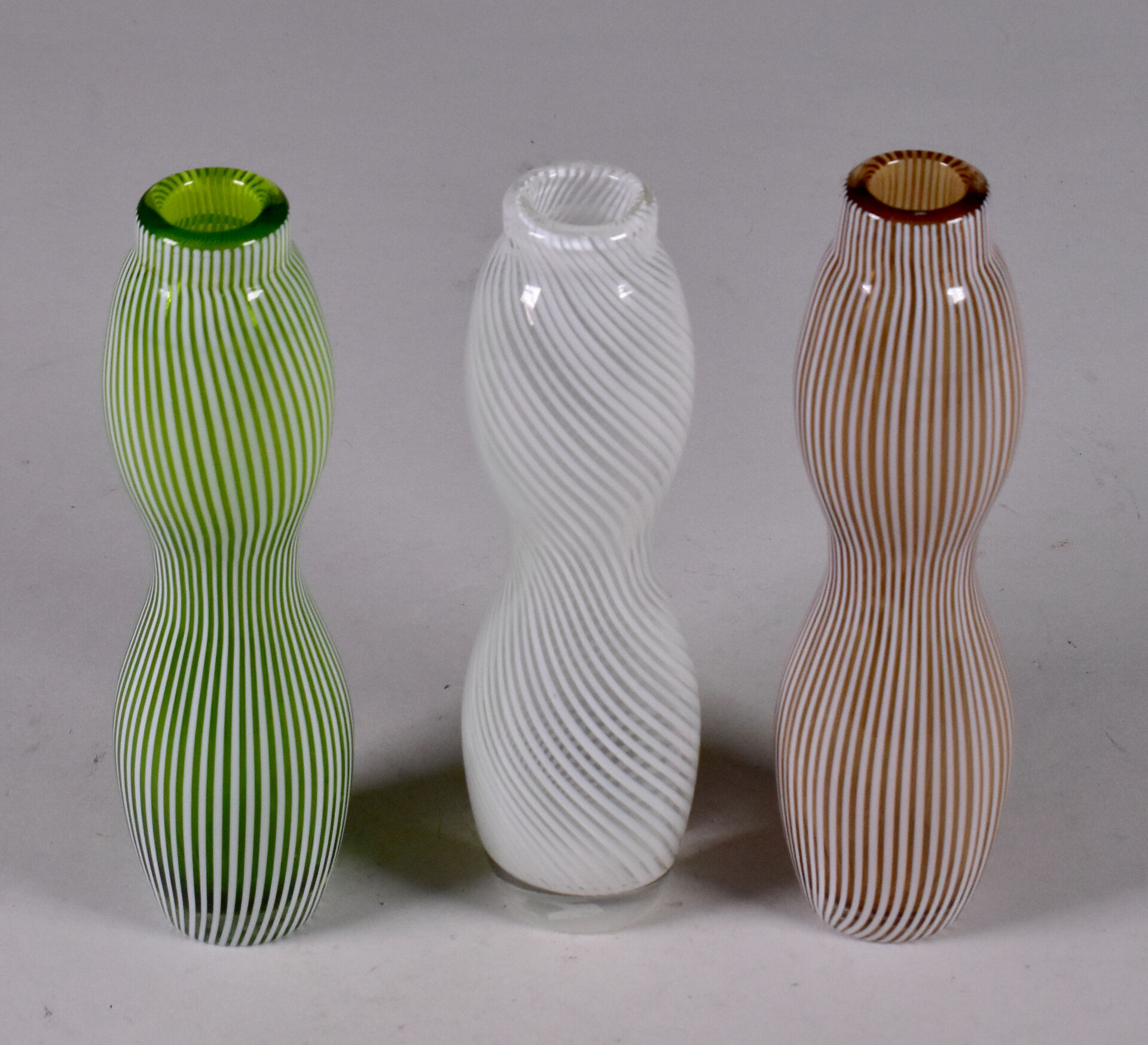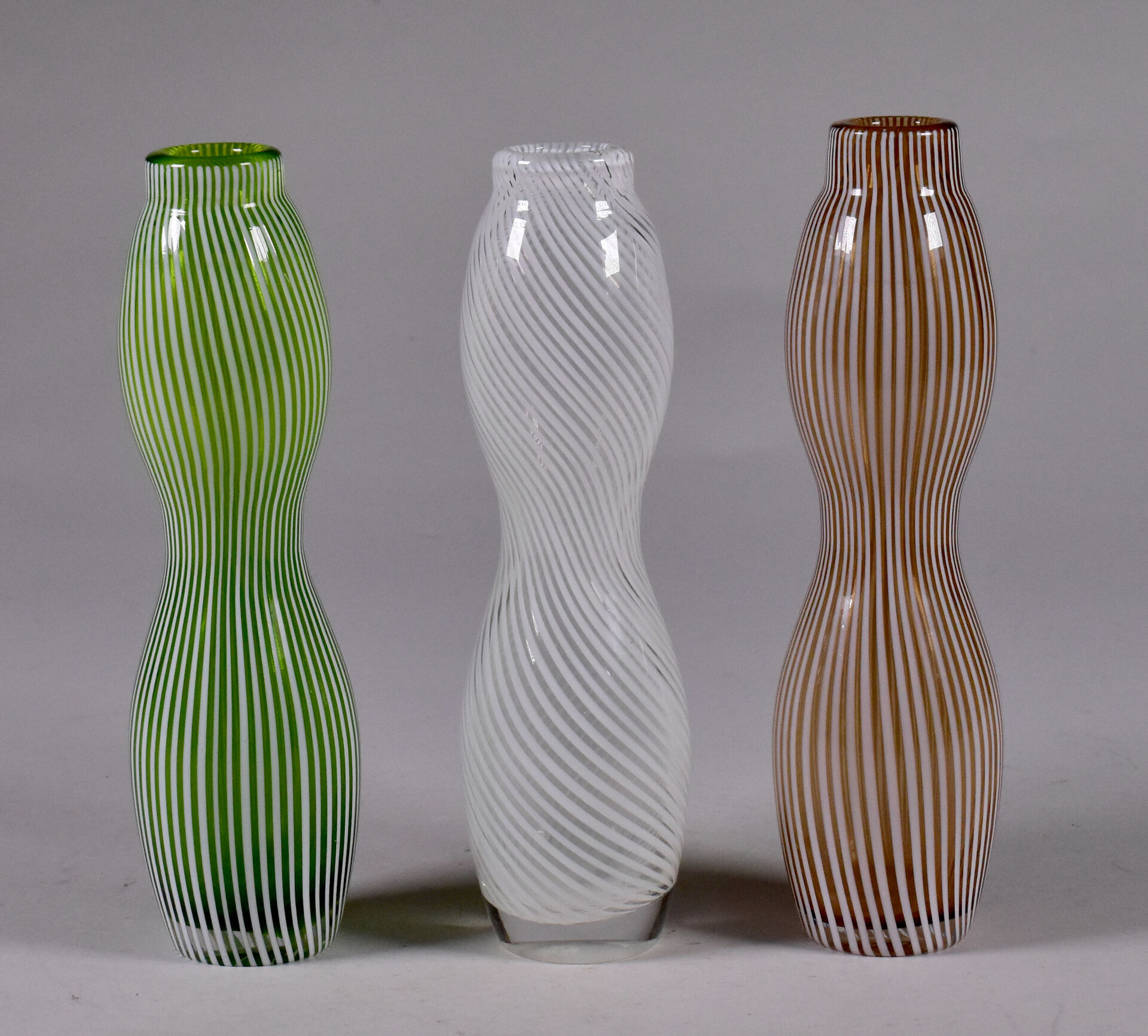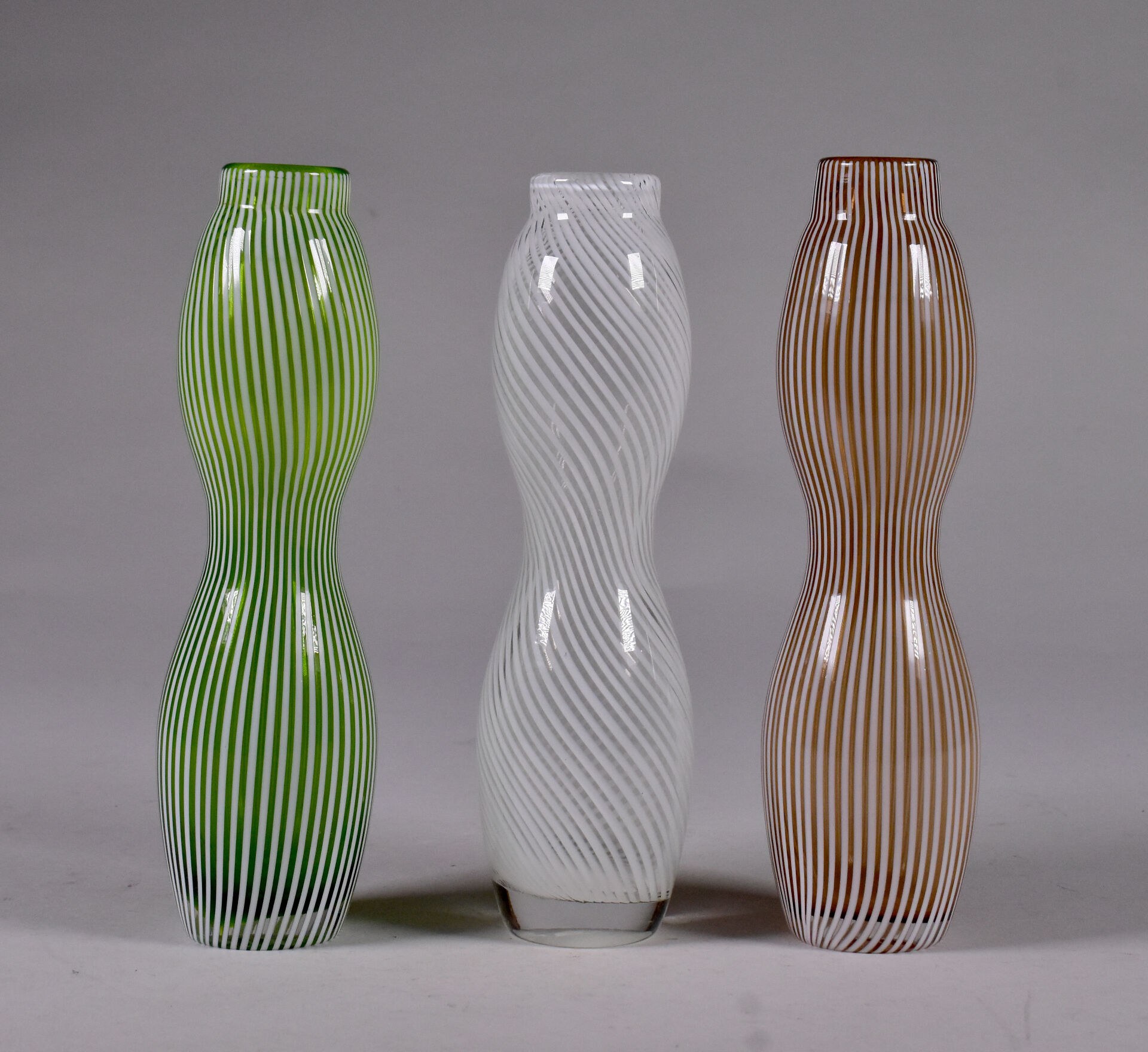 Trois vases coloquinte e verre filigrané brun, blanc et vert. Dans le gout de Dino MARTENS, Murano. Haut. : 19 cm.