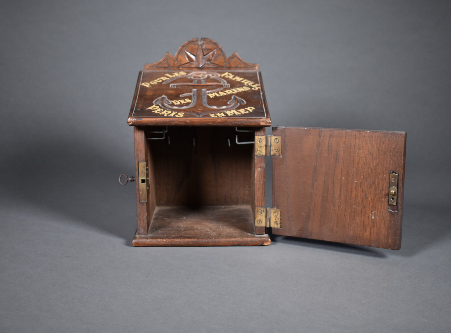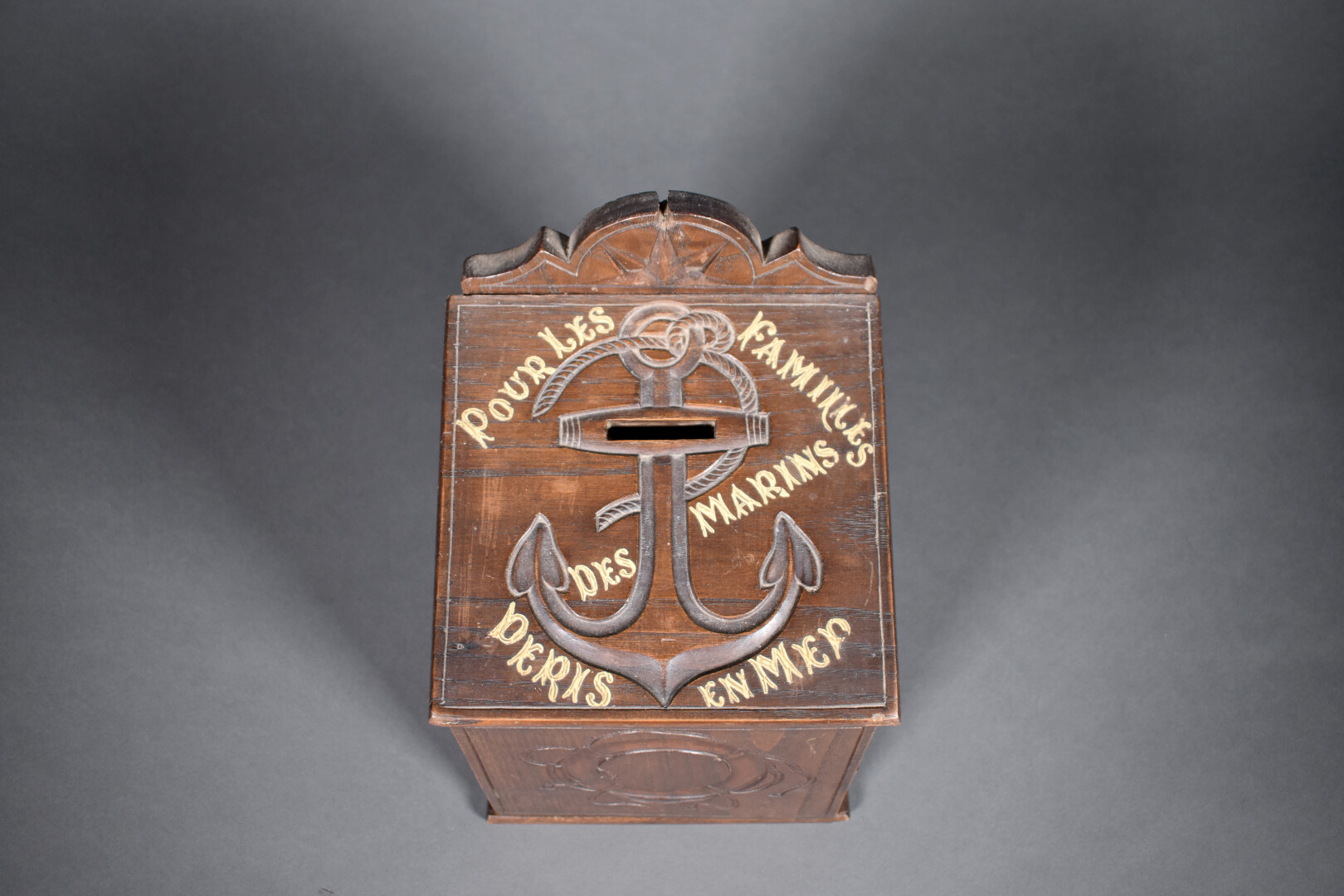 Tronc en chêne scuplté pour une chapelle dédiée aux marins (quelques usures, un fèle, éclats). Début du XXe siècle. Haut. : 30,5 cm – Larg. : 20,5 cm – Prof. : 20,5 cm.