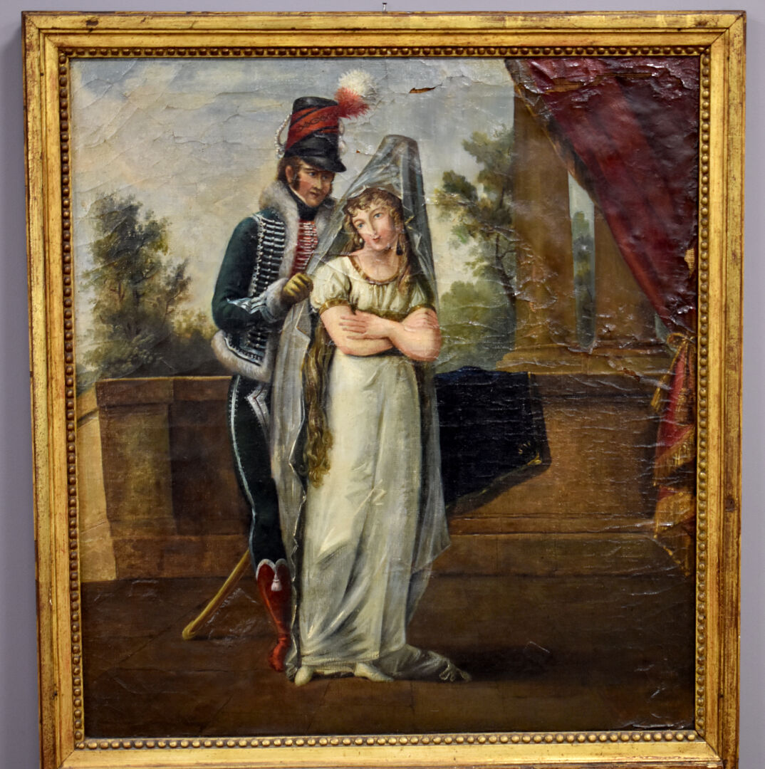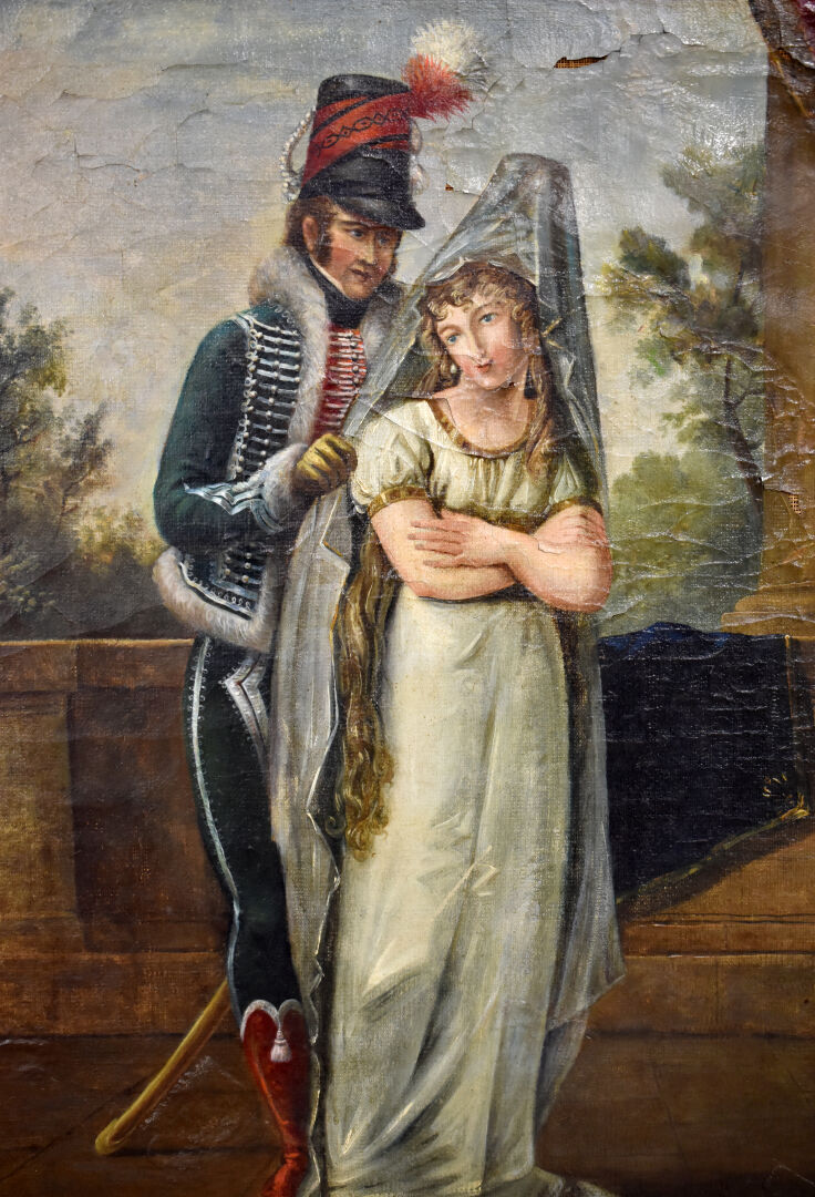 Trumeau en bois stuqué doré (manques) la partie haute ceinte d’une huile sur toile représentant un hussard faisant la cour à une élégante (restaurations, manques). La partie basse à fond de glace (piqures). Style Empire, XIXe siècle. 141 x 66 cm.
