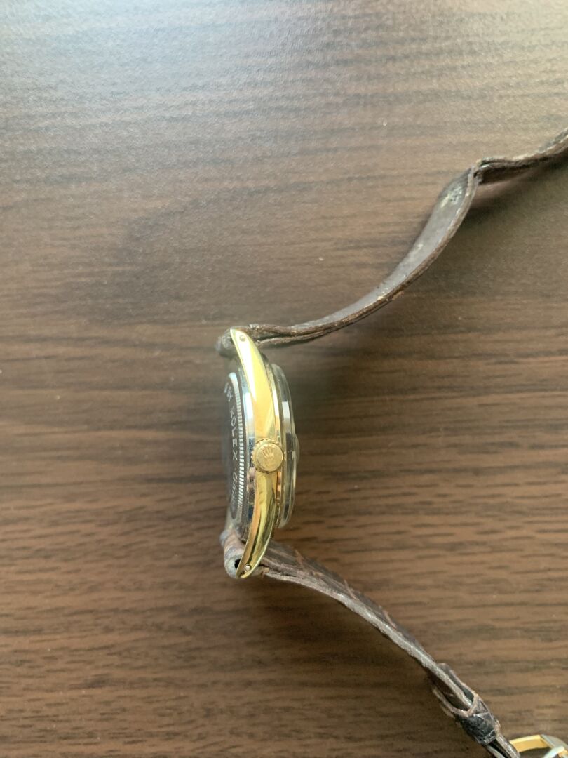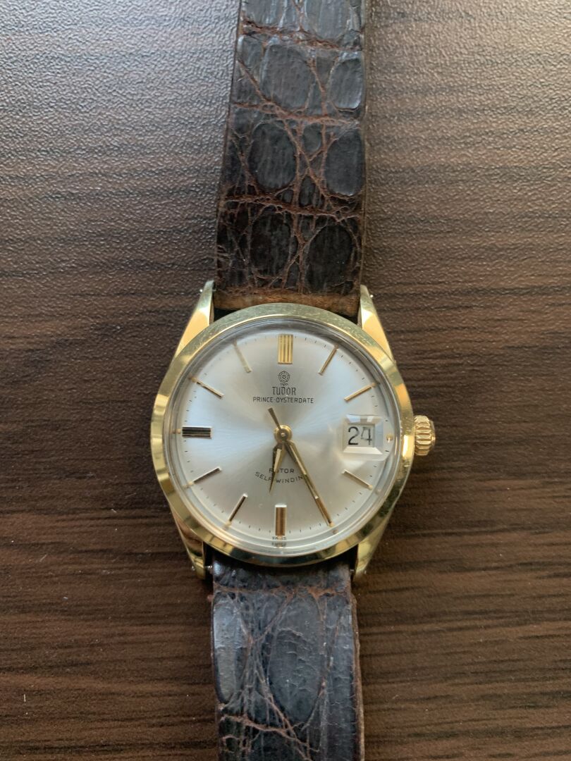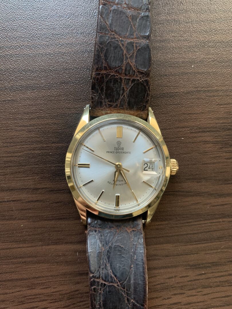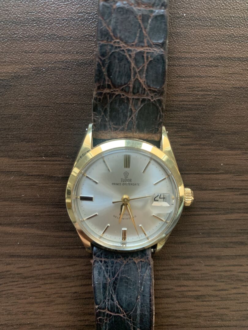 TUDOR AUTO-PRINCE. Montre bracelet d’homme. Boîtier rond en acier bi-color. Cadran à fond blanc nacré signé avec guichet dateur à 3h et logotée à la rose à 12h. Mouvement à calibre mécanique à remontage automatique. Bracelet en cuir brun sur boucle ardillon en métal. Diamètre : 33 mm. Fonctionne (bracelet et boucle très usée).