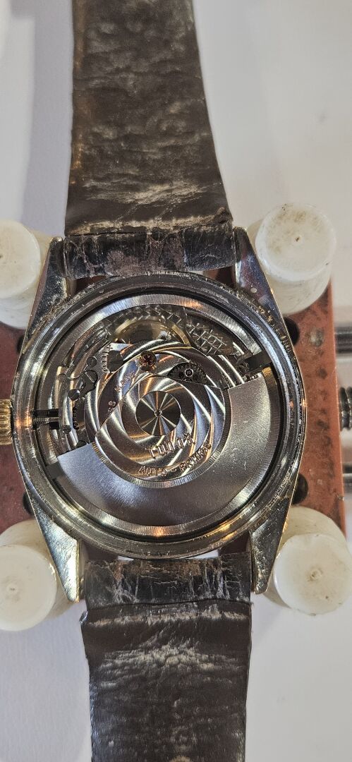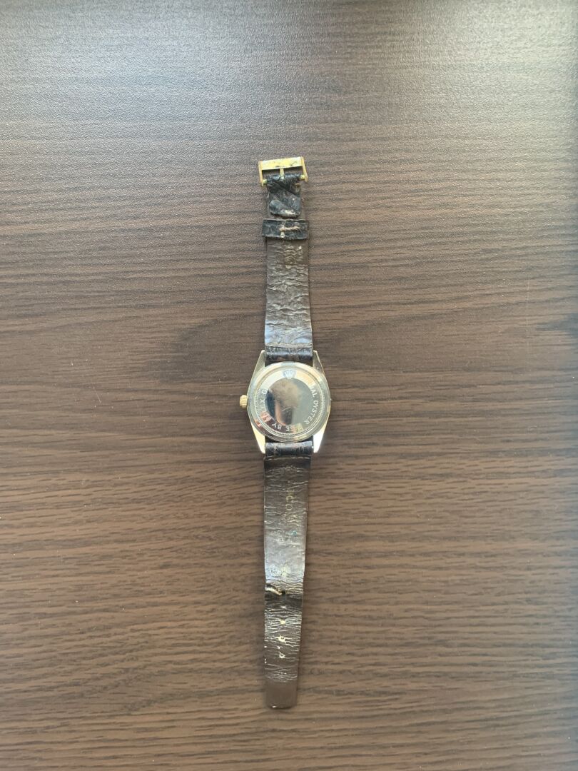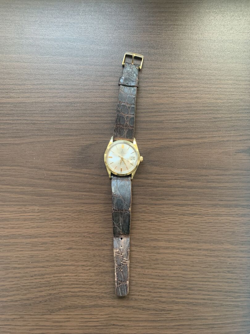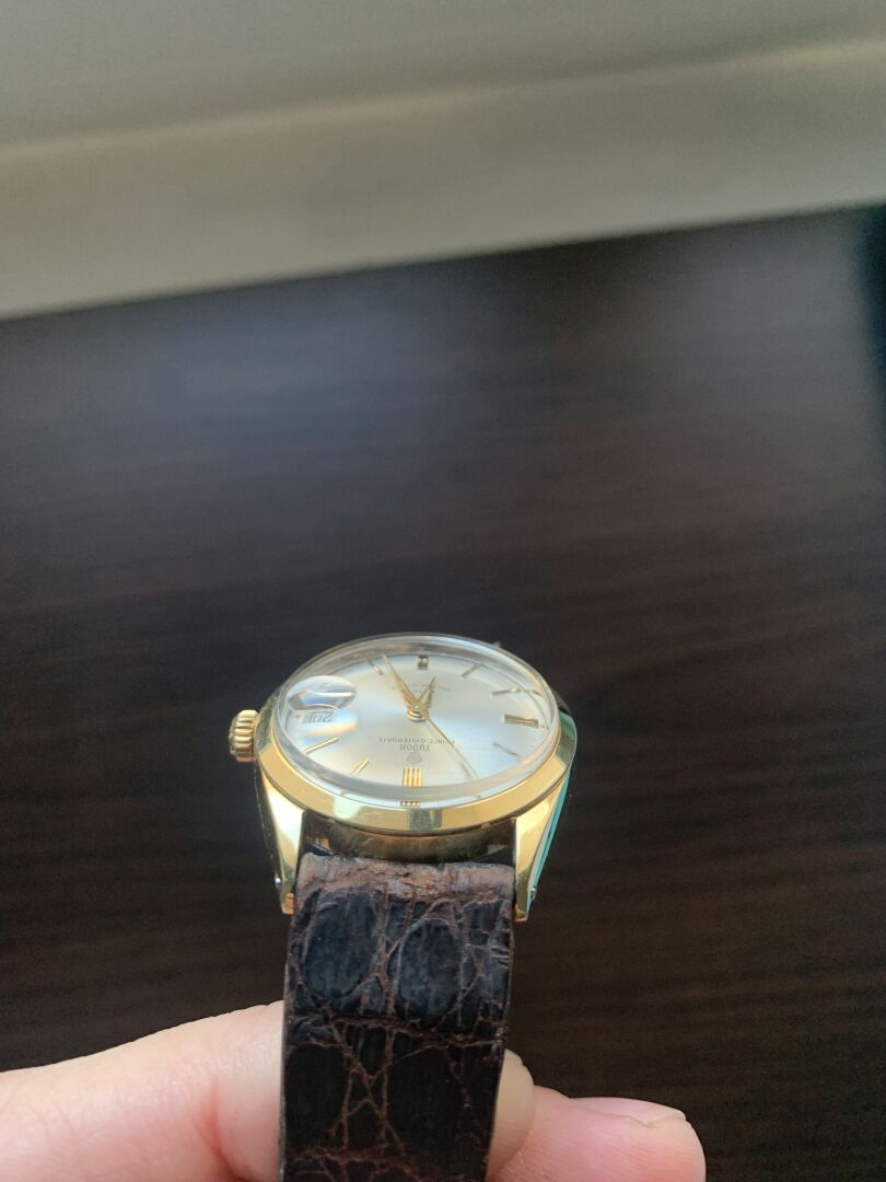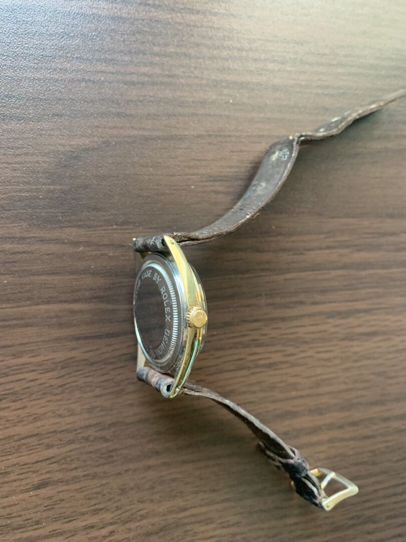TUDOR AUTO-PRINCE. Montre bracelet d’homme. Boîtier rond en acier bi-color. Cadran à fond blanc nacré signé avec guichet dateur à 3h et logotée à la rose à 12h. Mouvement à calibre mécanique à remontage automatique. Bracelet en cuir brun sur boucle ardillon en métal. Diamètre : 33 mm. Fonctionne (bracelet et boucle très usée).