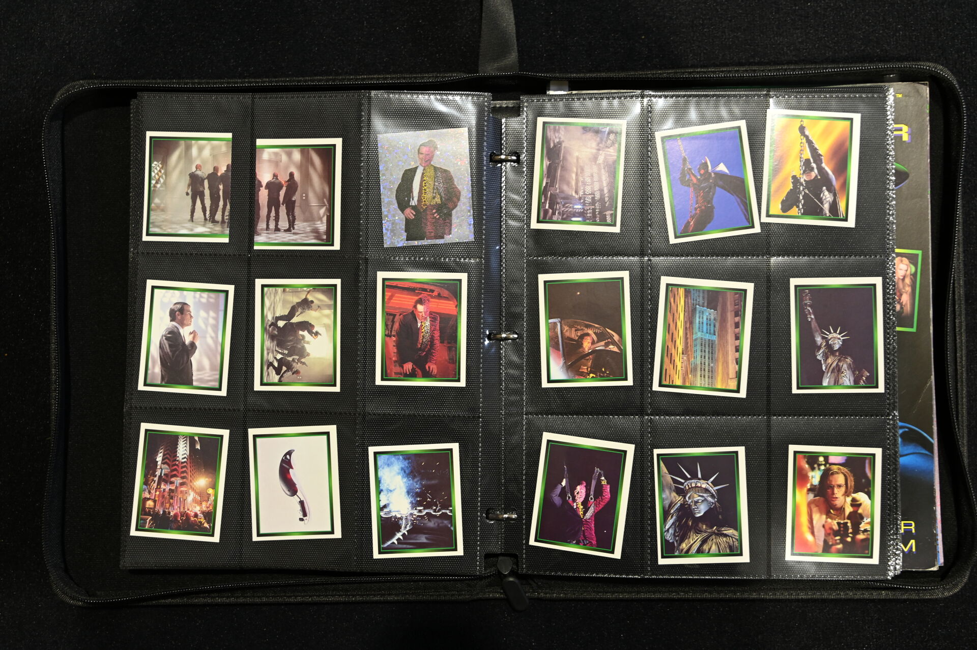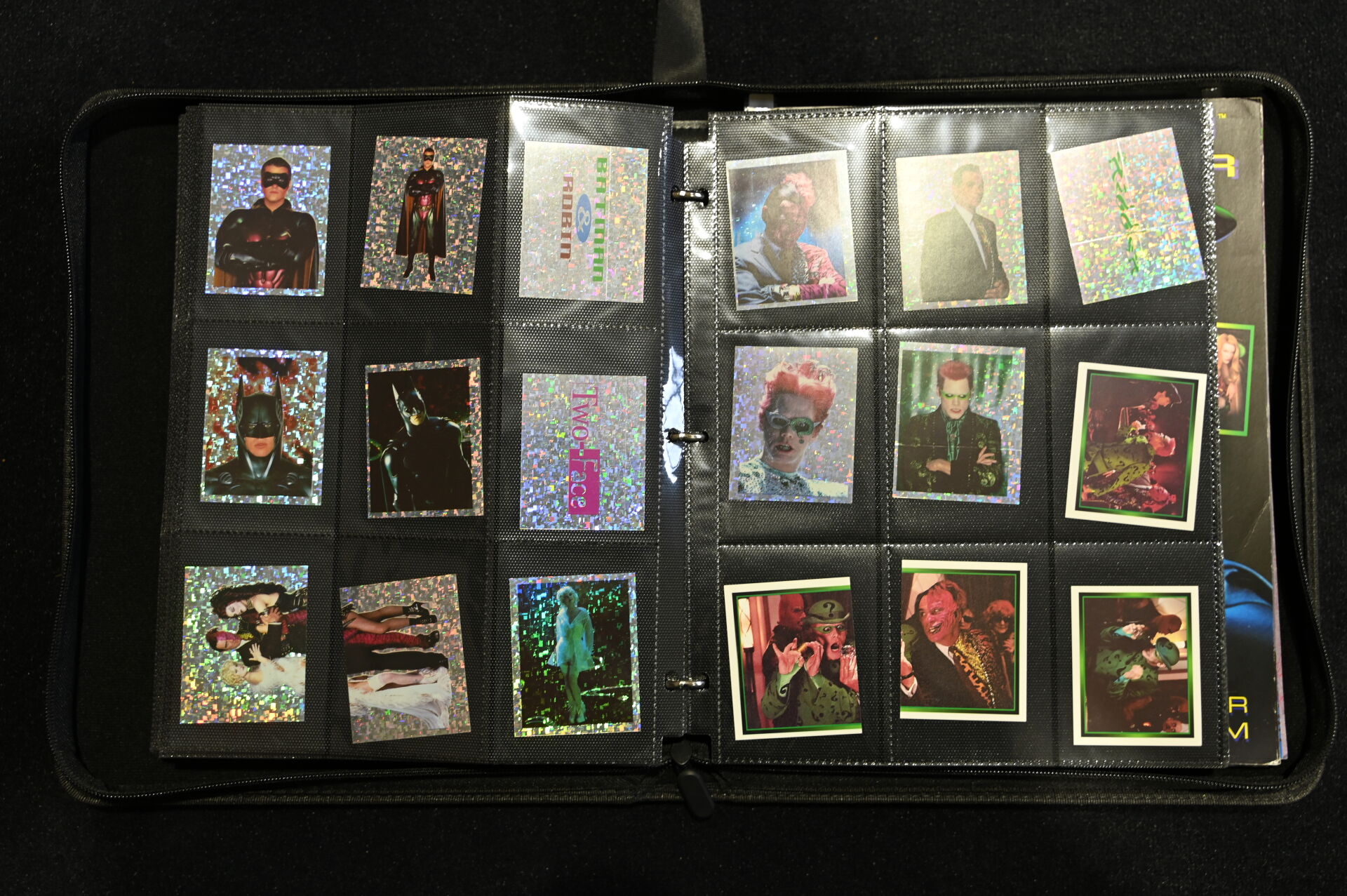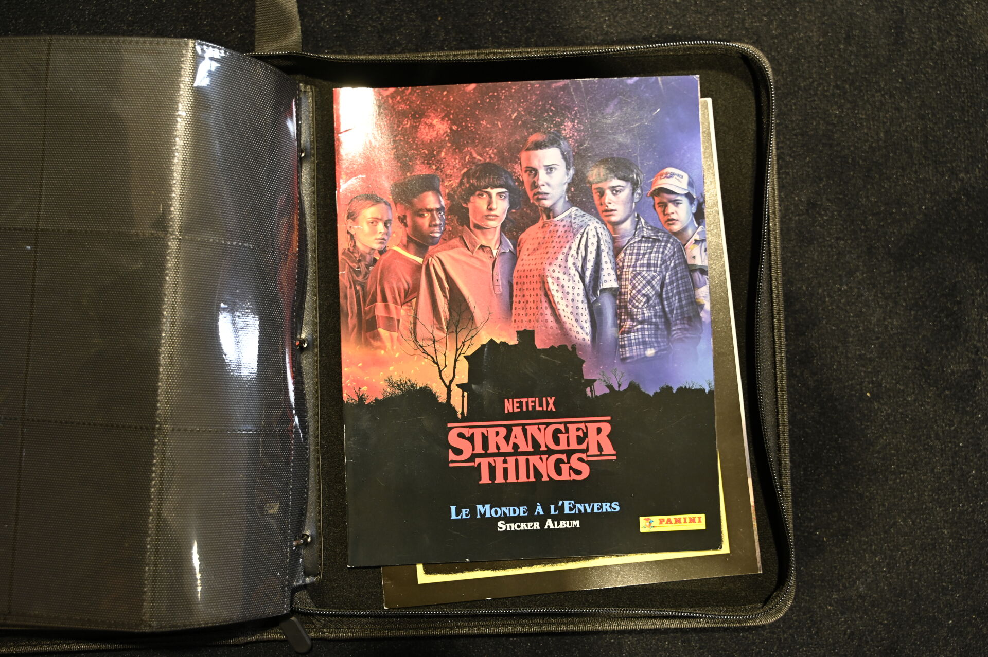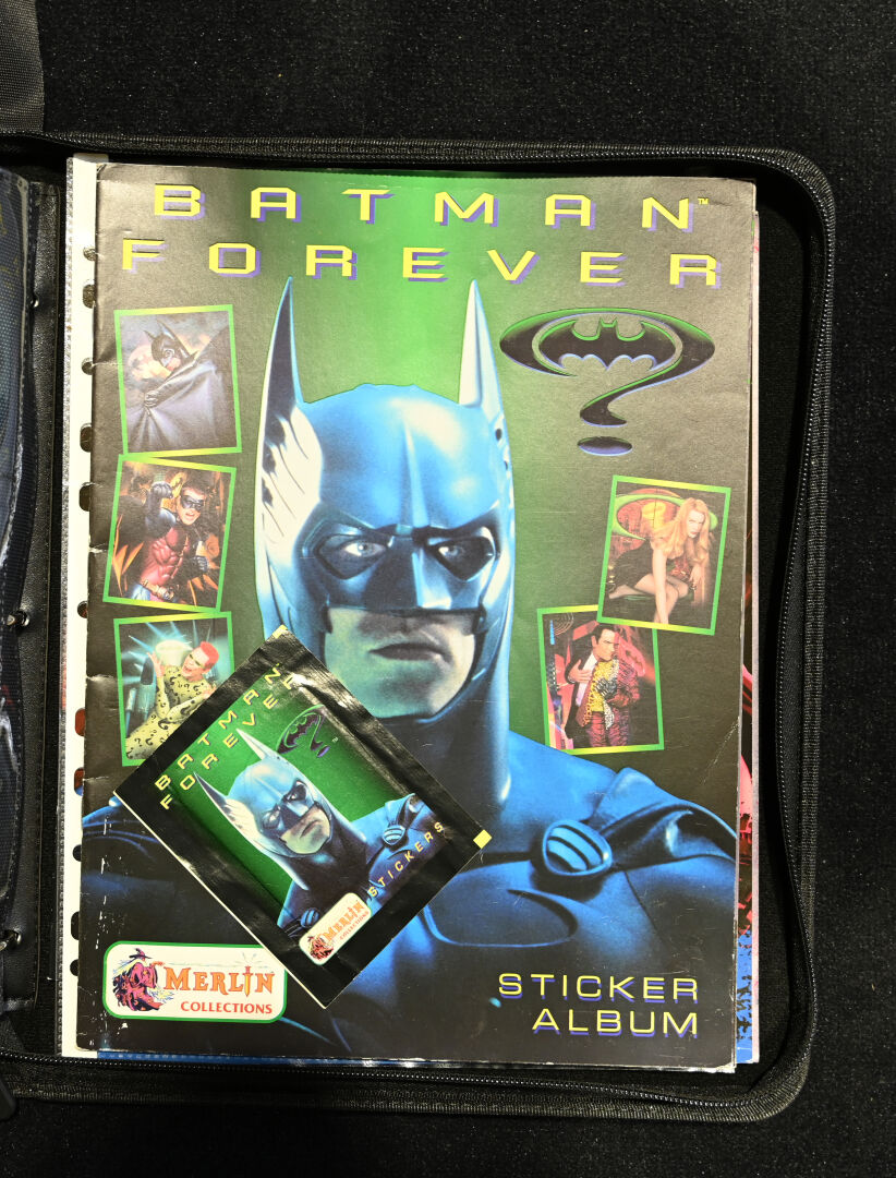 Un album comprenant des cartes et vignettes des univers X-FILES (USPC GAMES NXT 1996), STRANGER THINGS (PANINI) et BATMAN (MERLIN COLLECTIONS 1995, dont un paquet non ouvert), BATMAN PANINI.