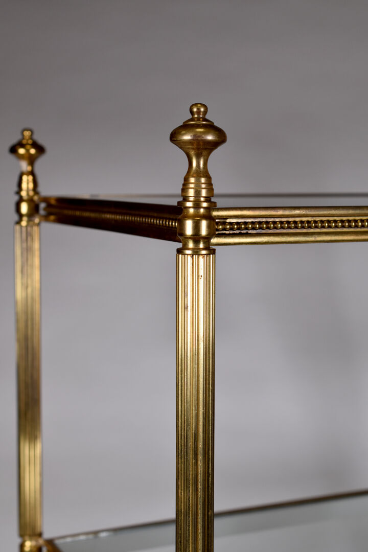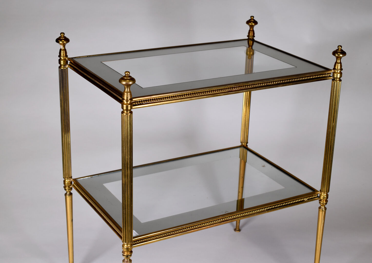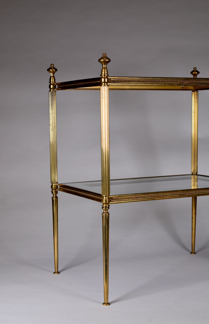 Un bout de canapé en laiton à double plateau de verre. Les pieds cannelés. Haut. 58 cm – Larg. : 49,5 cm – Prof. : 33,5 cm.