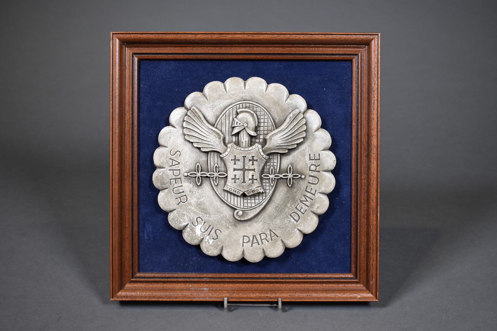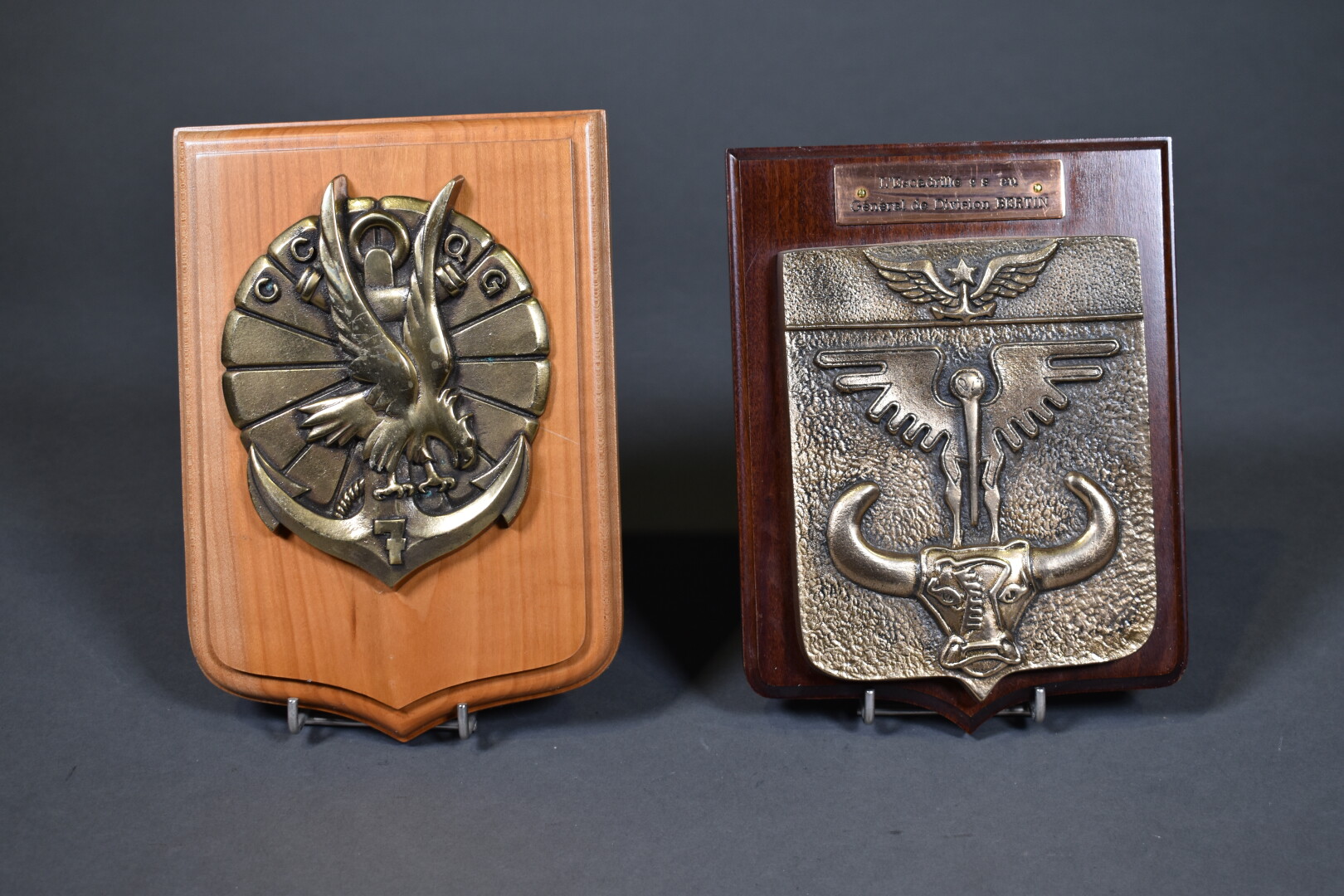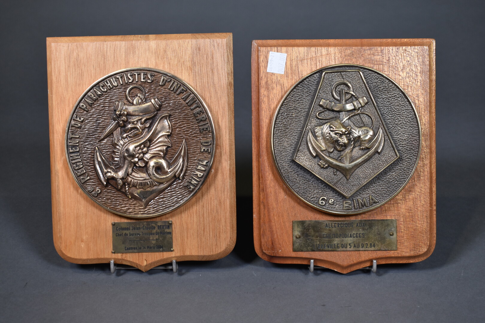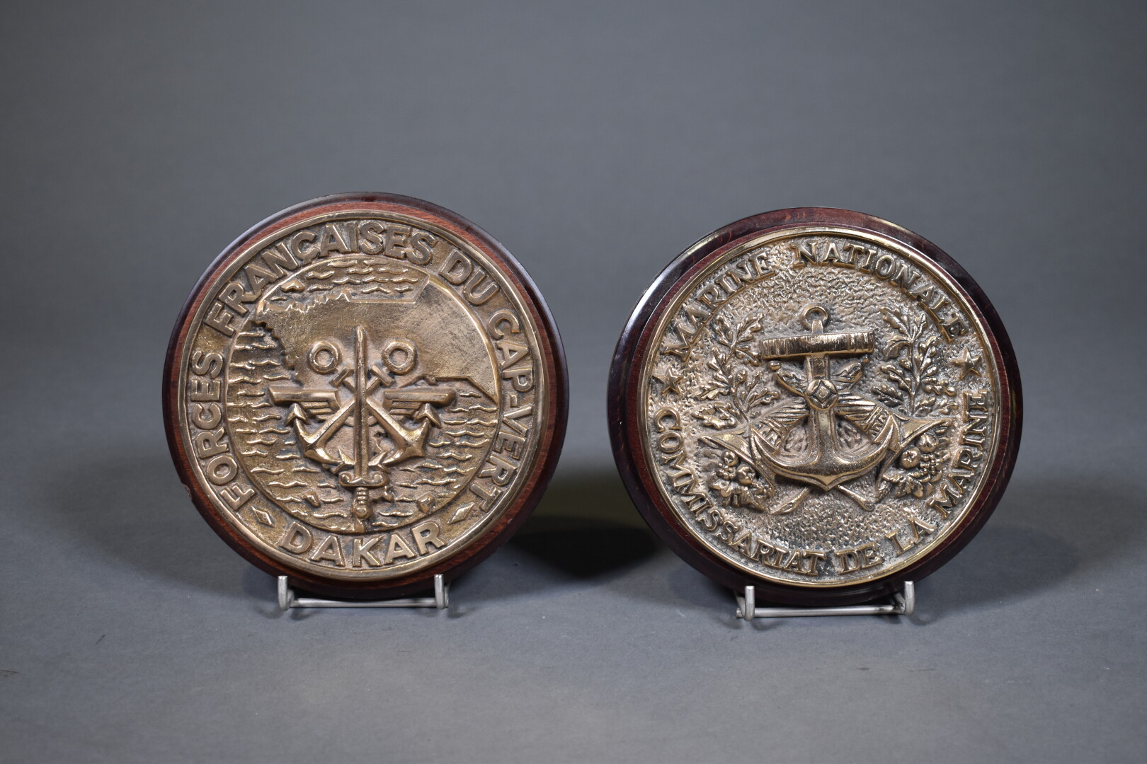 Un carton de souvenirs militaires, tape de bouche en bronze sur socle bois verni. Etat 1