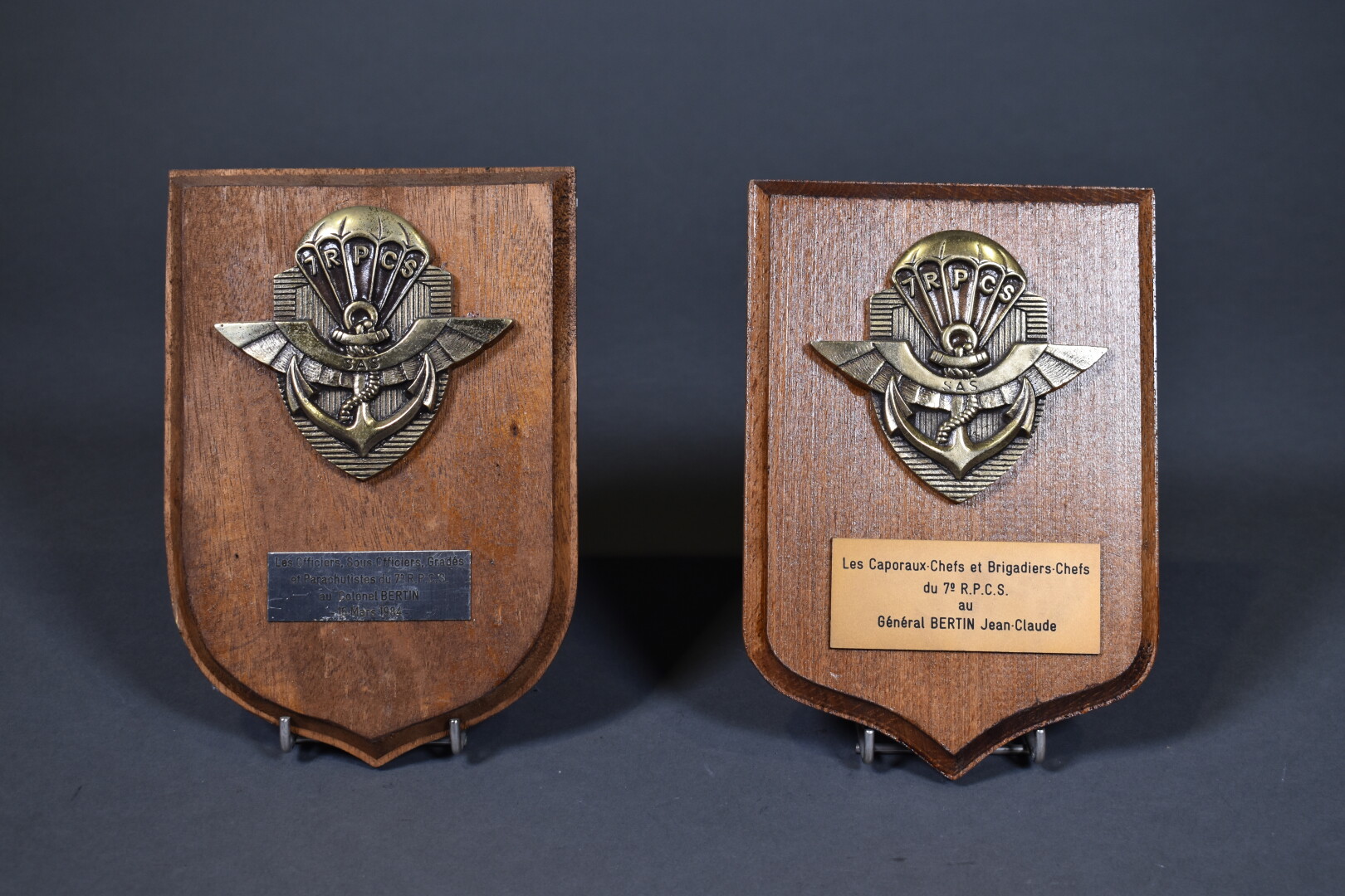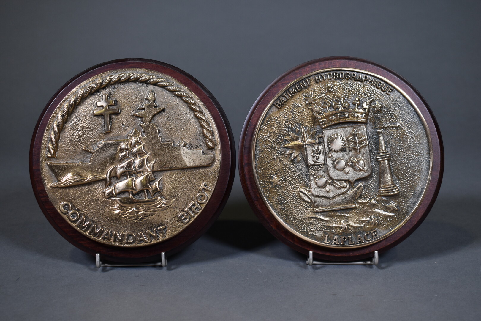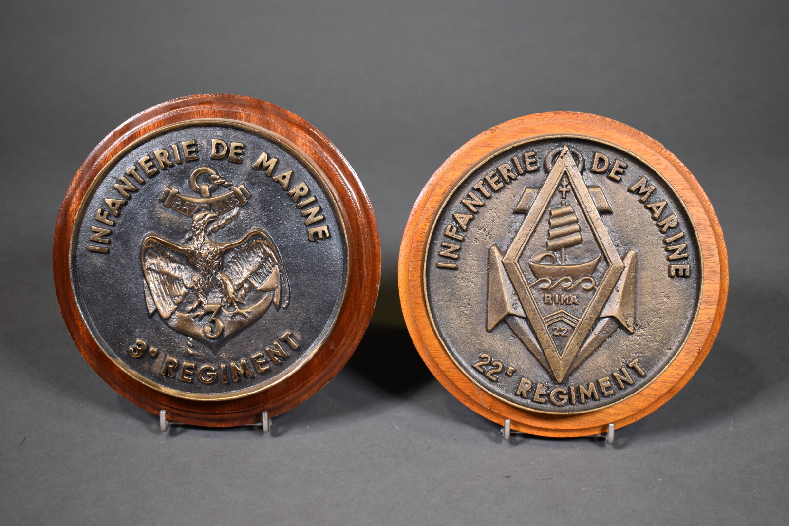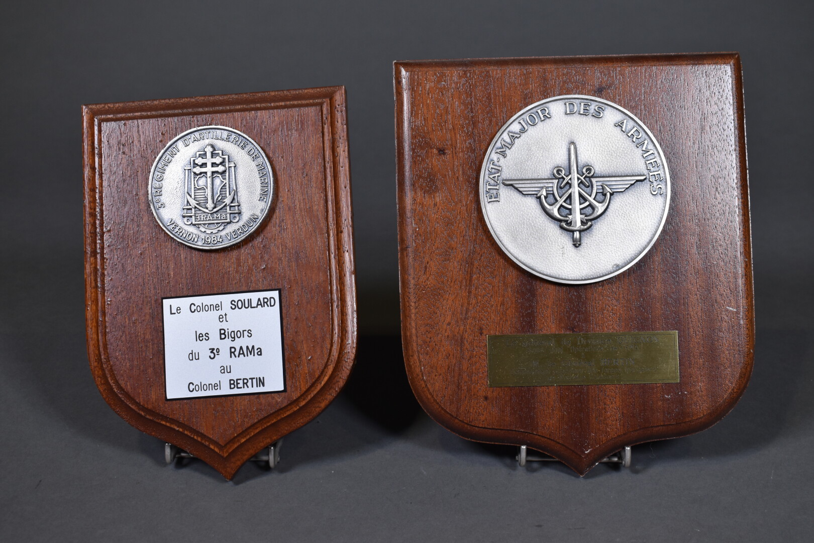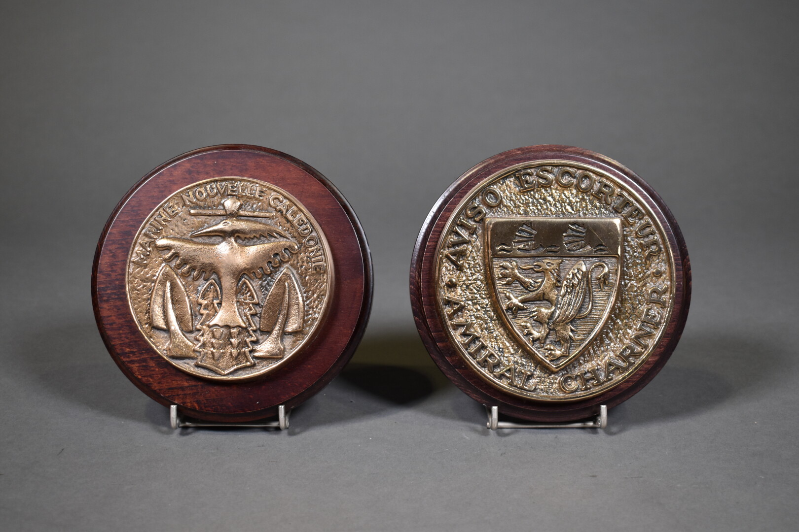 Un carton de souvenirs militaires, tape de bouche en bronze sur socle bois verni. Etat 1