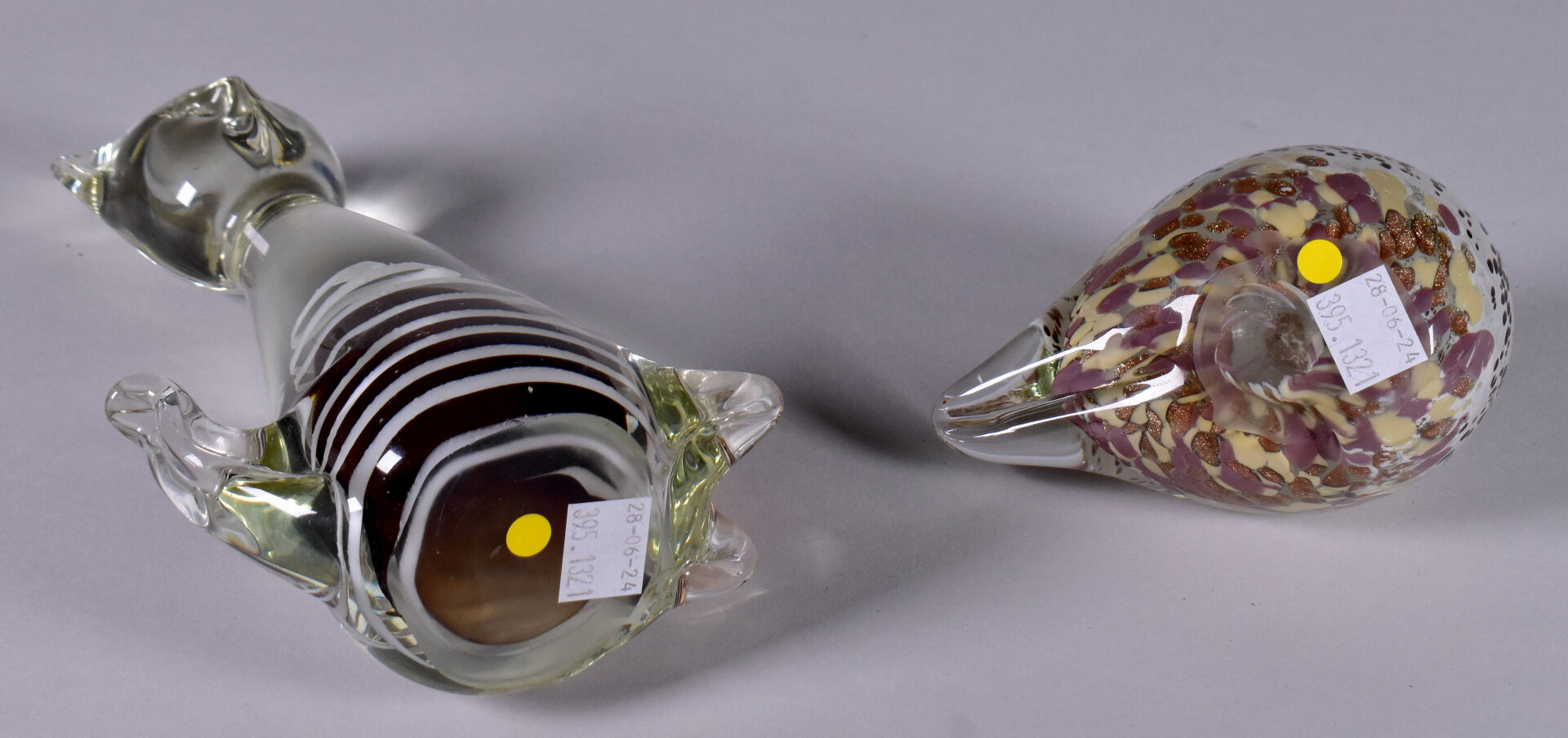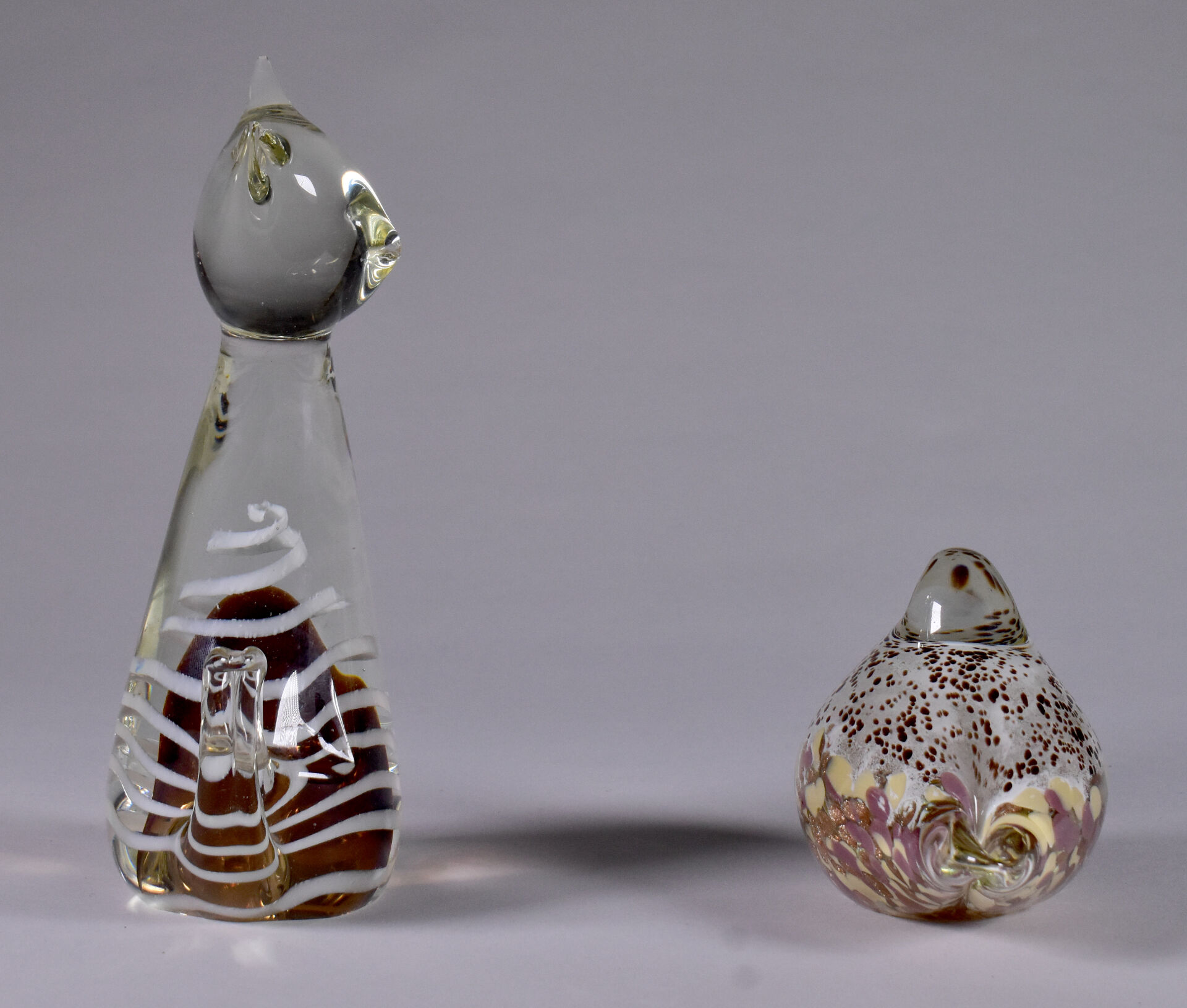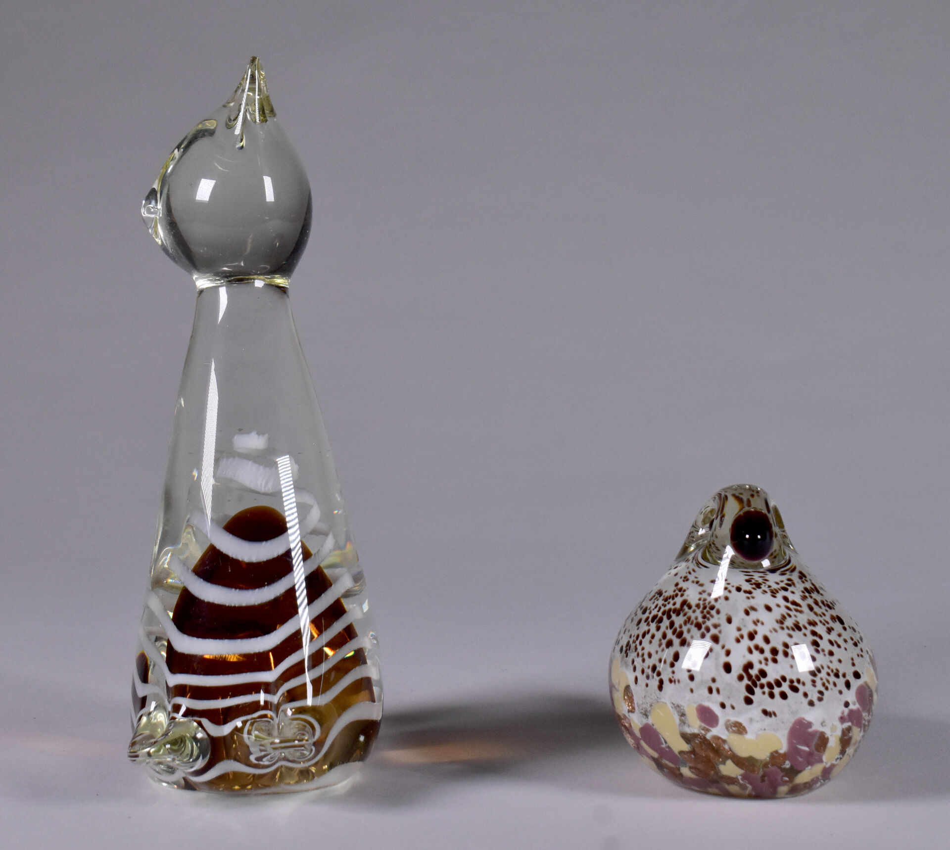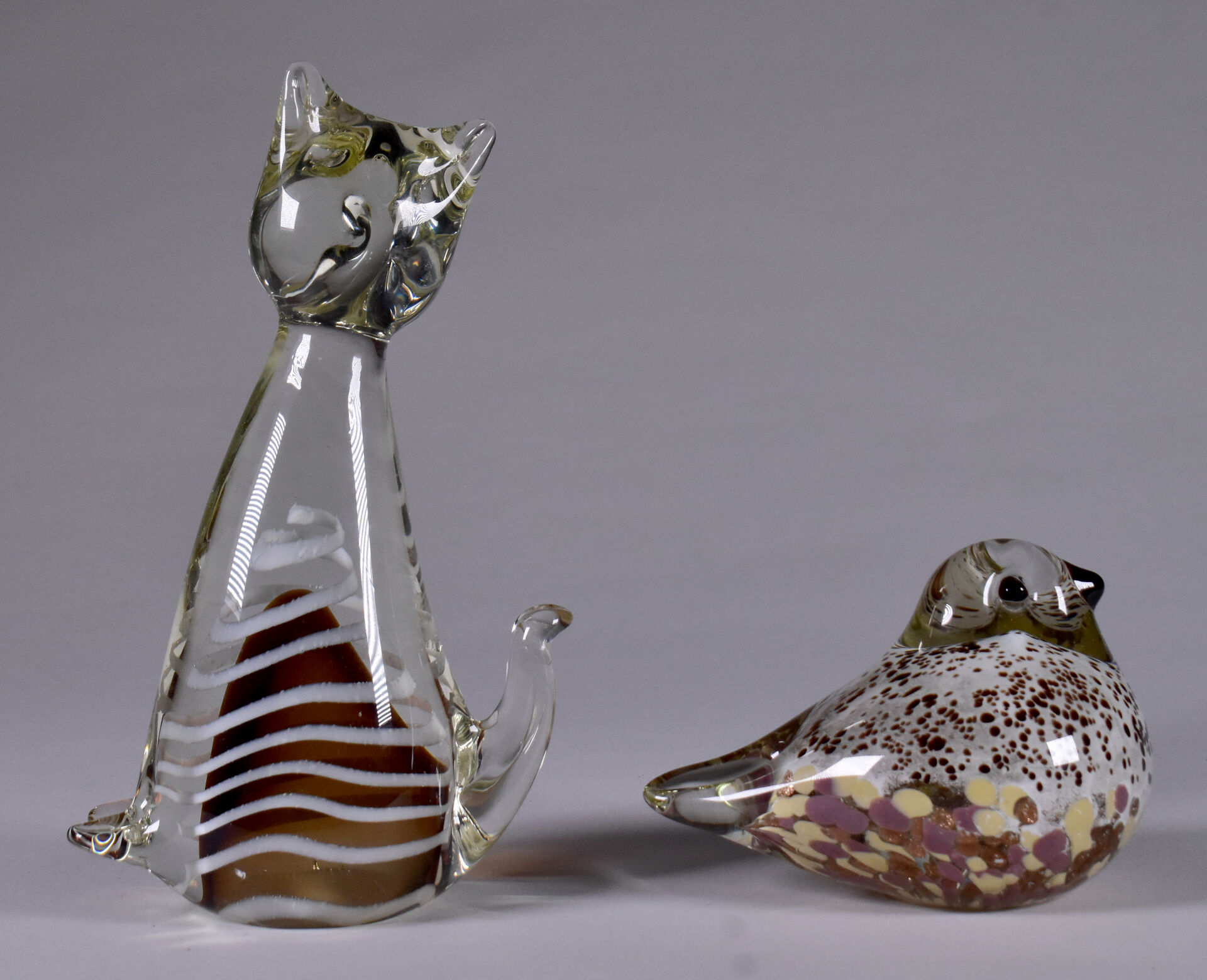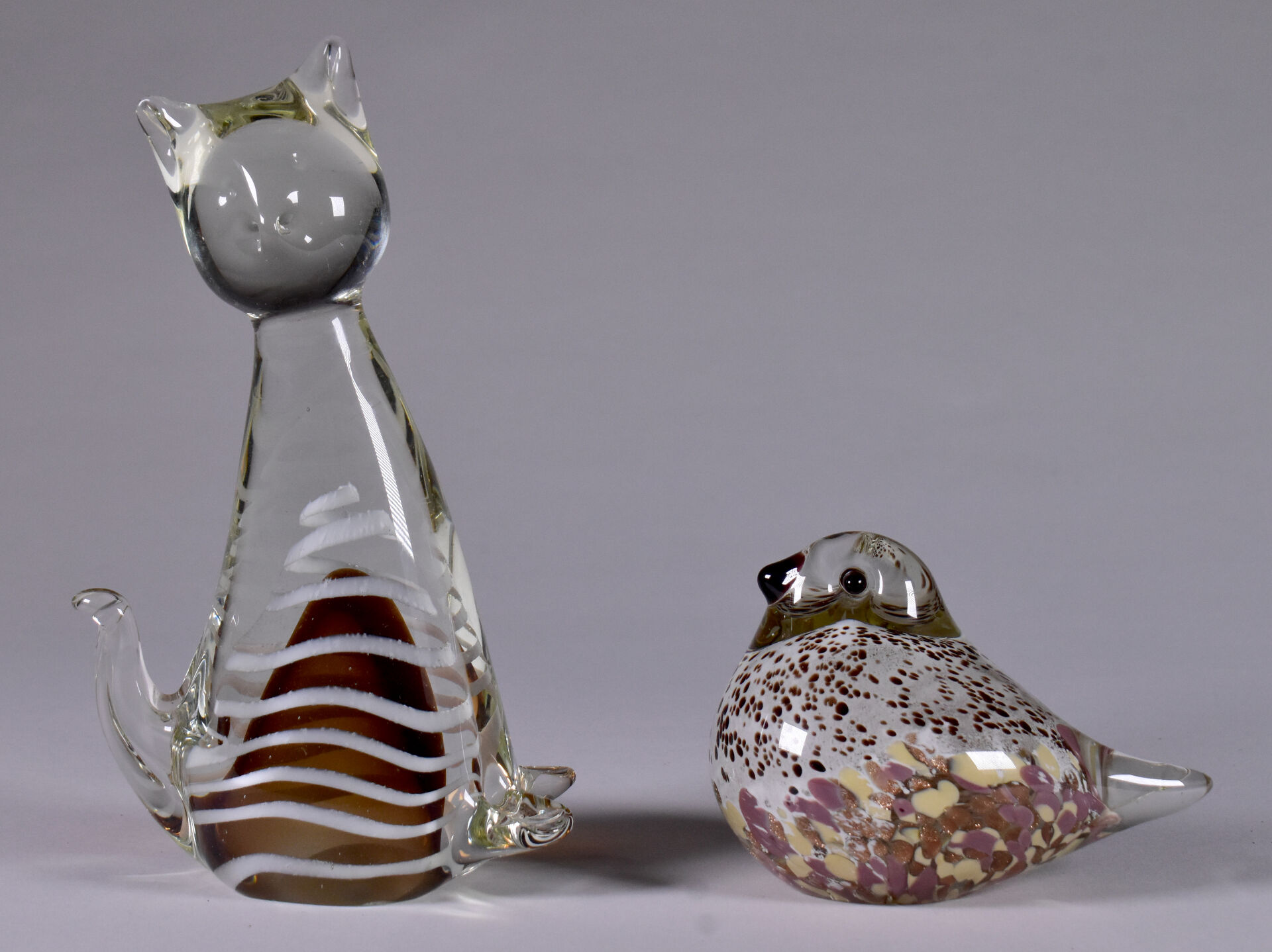 Un chat et un oiseau en verre multicouche, le chat à filigranes crème et intérieur brun, l’oiseau à intérieur tacheté et paillons cuivre. Murano, XXe siècle. Haut. du chat : 20,5 cm.