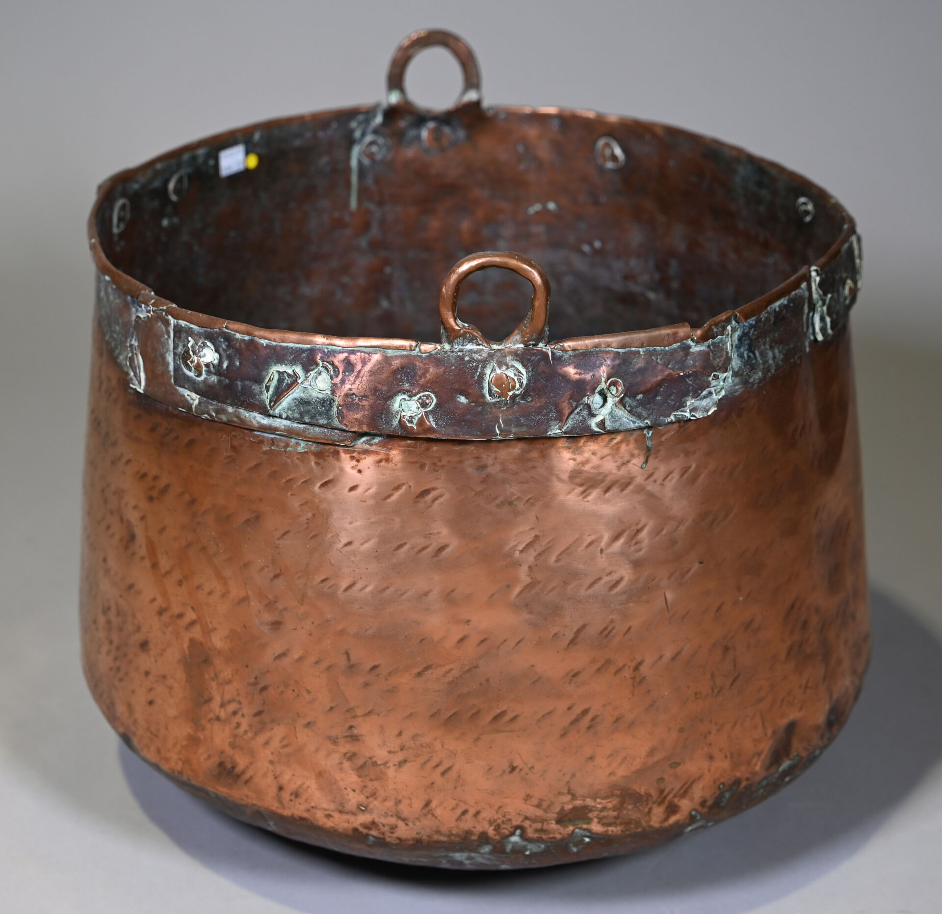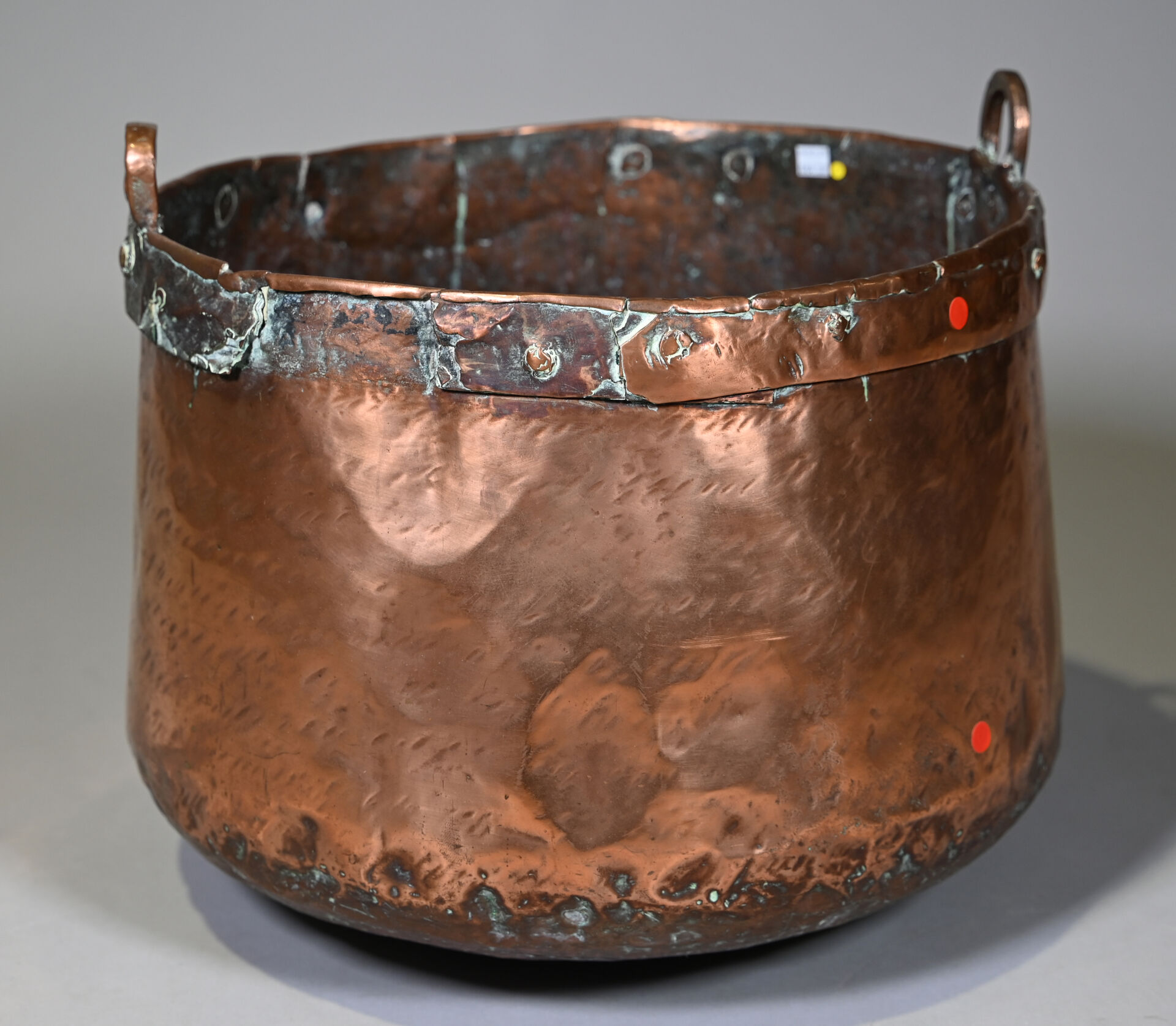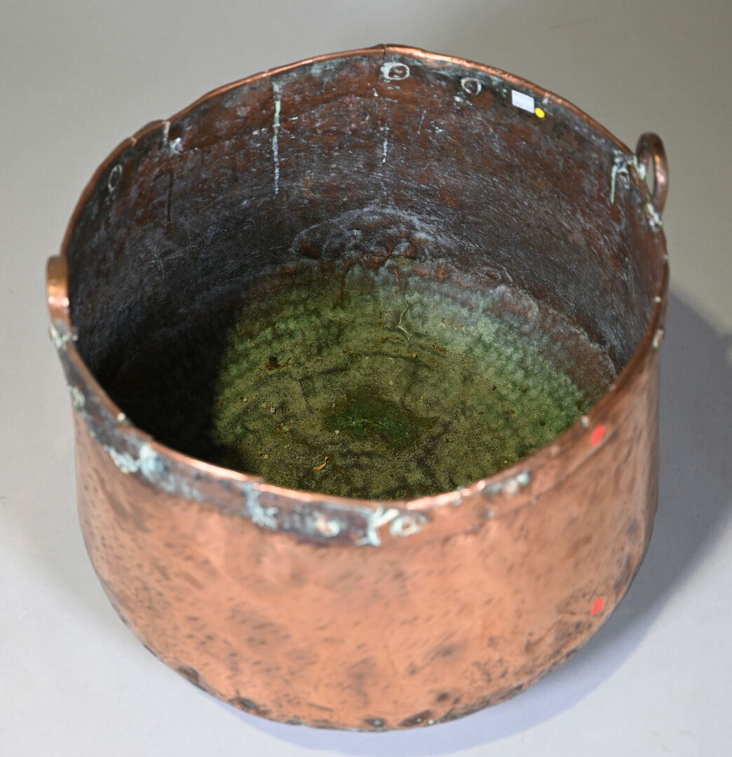 Un chaudron en cuivre (enfoncements). Haut. : 42 cm – Diam. : 46 cm.