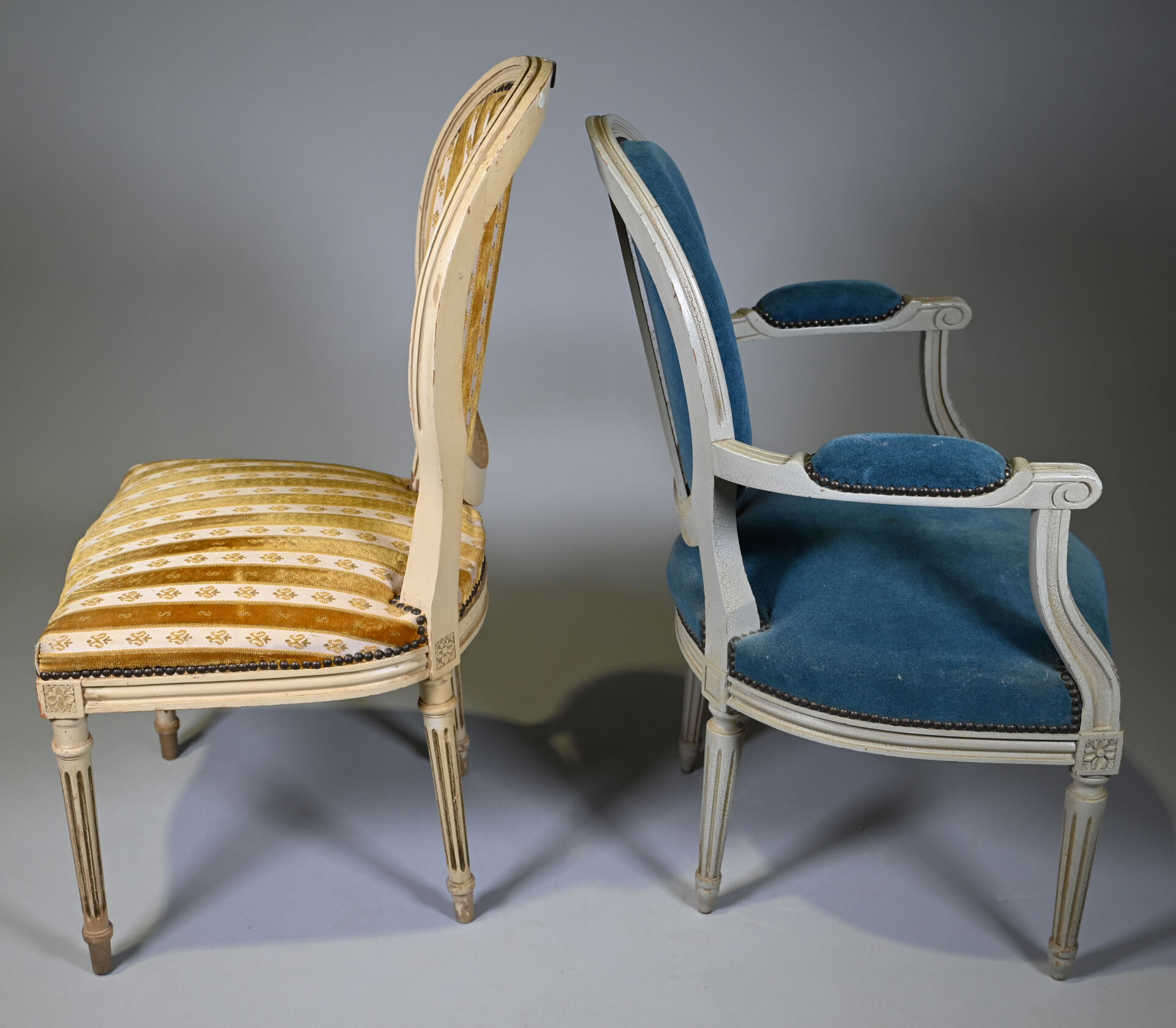 Un fauteuil et une chaise médaillon en bois sculpté laqué crème. Un à garniture de velours bleu, l’autre à garniture de velours rayé or . STyle Louis XVI, XXe siècle. Haut. : 90 cm (fauteuil).