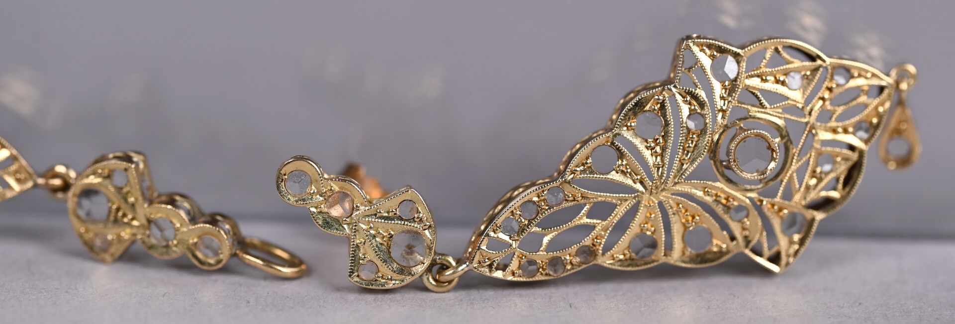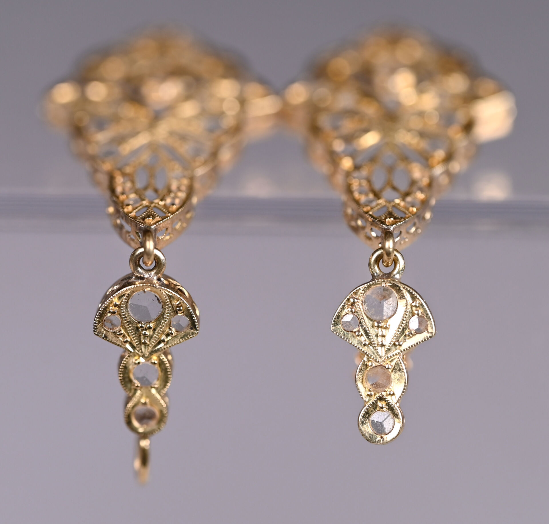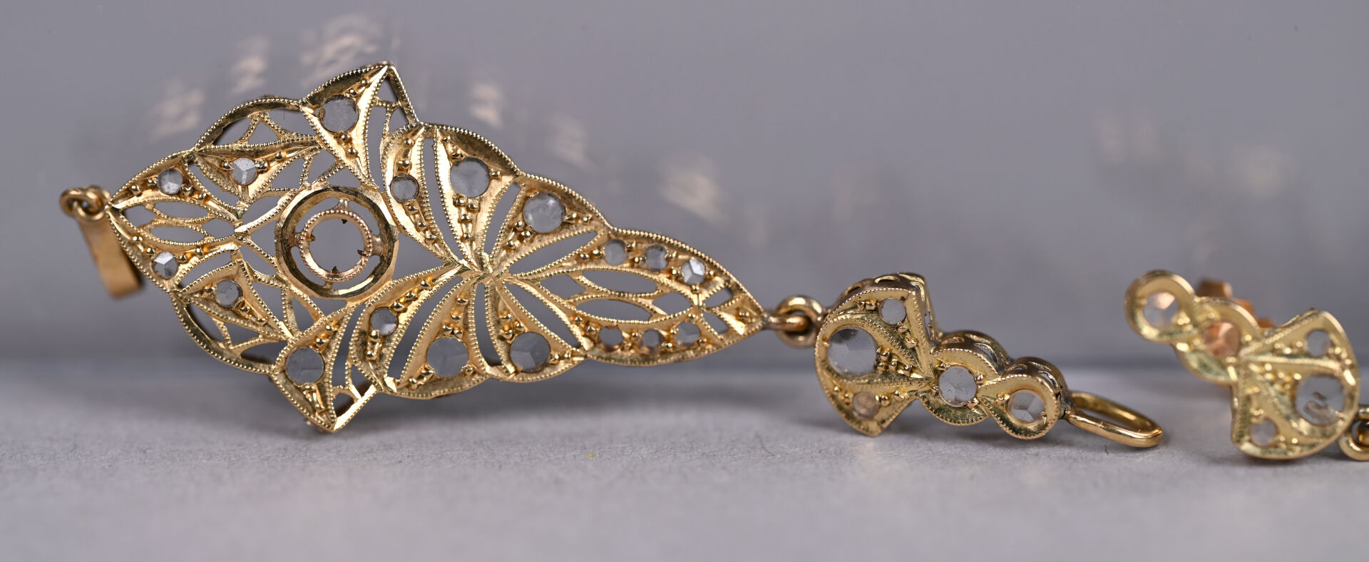 Un pendant d’oreille et un pendentif en or 18K 750/1000e, sertis de diamants taille rose sur une monture ajourée (manques). Haut. : 5,5 et 5 cm. Poids brut. : 3,7 g.