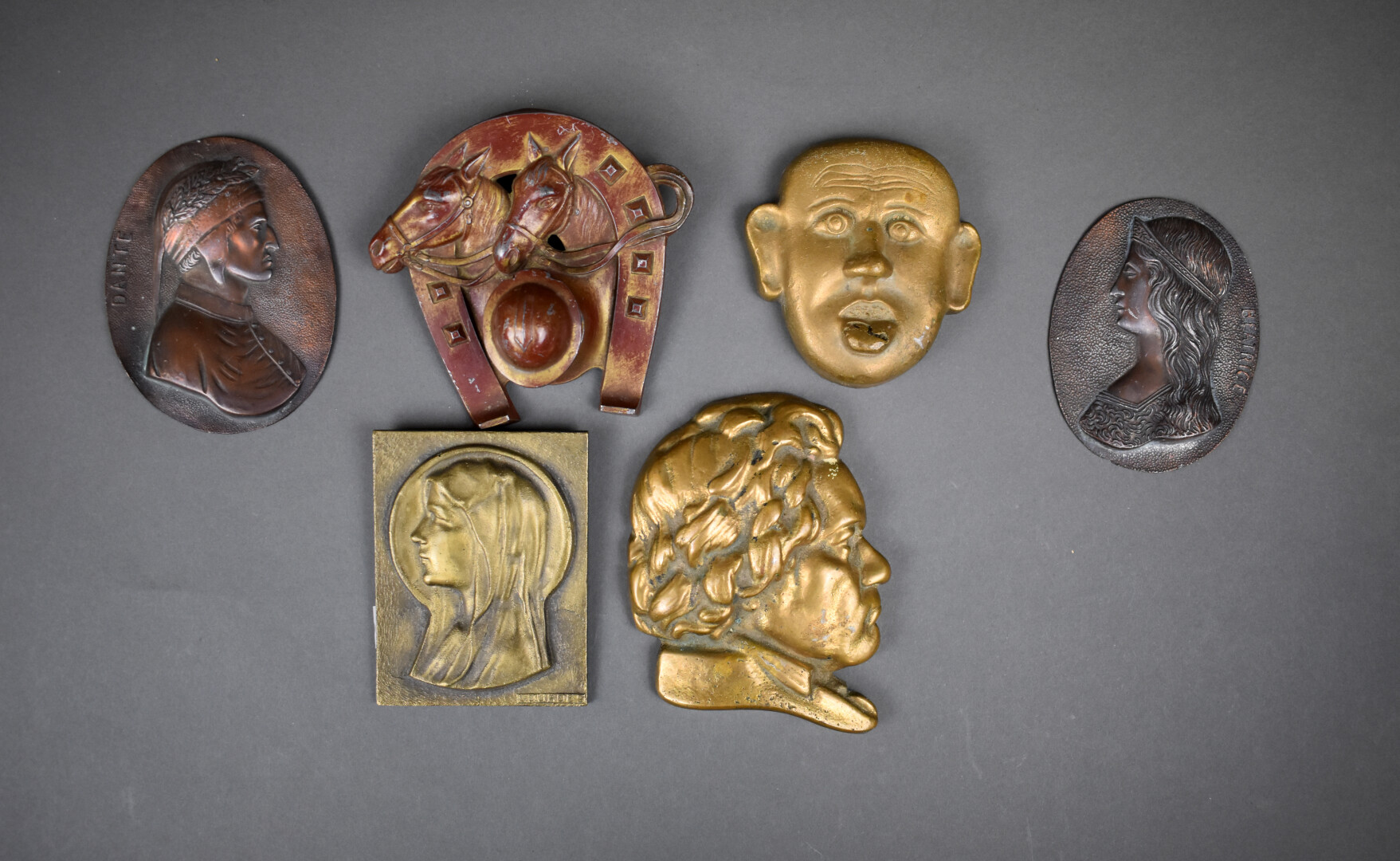 Un petit ensemble en métal en bronze soit des médailles religieuses, un saleron en métal, une plaque de porcelaine à décor lithographié.