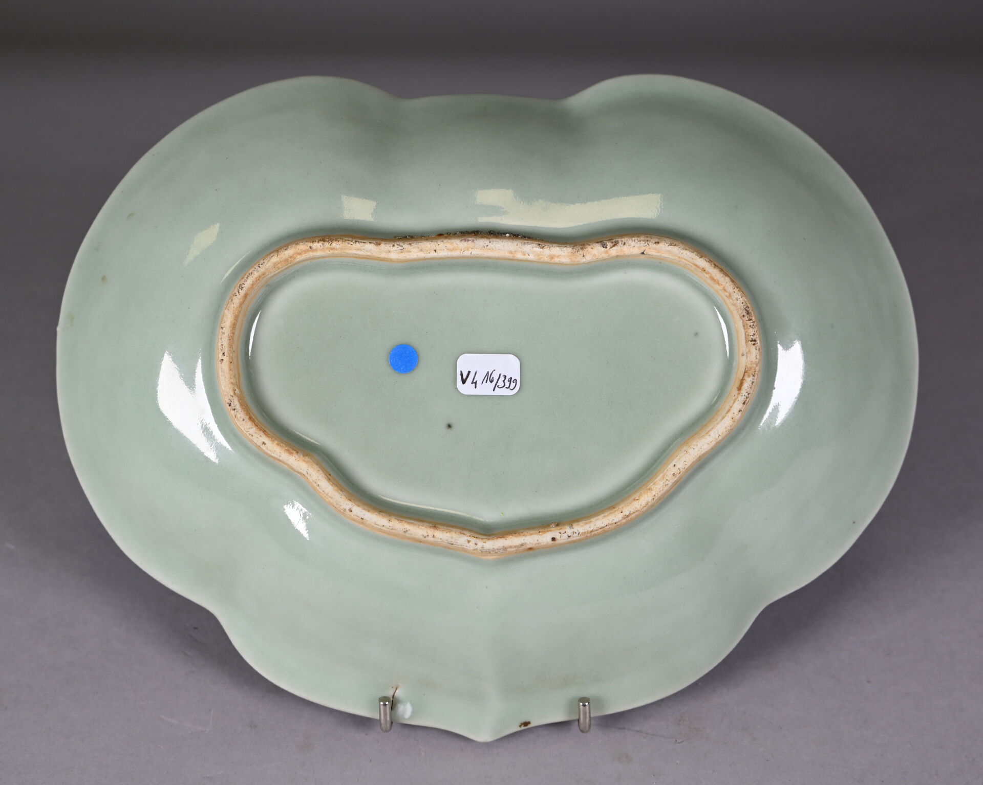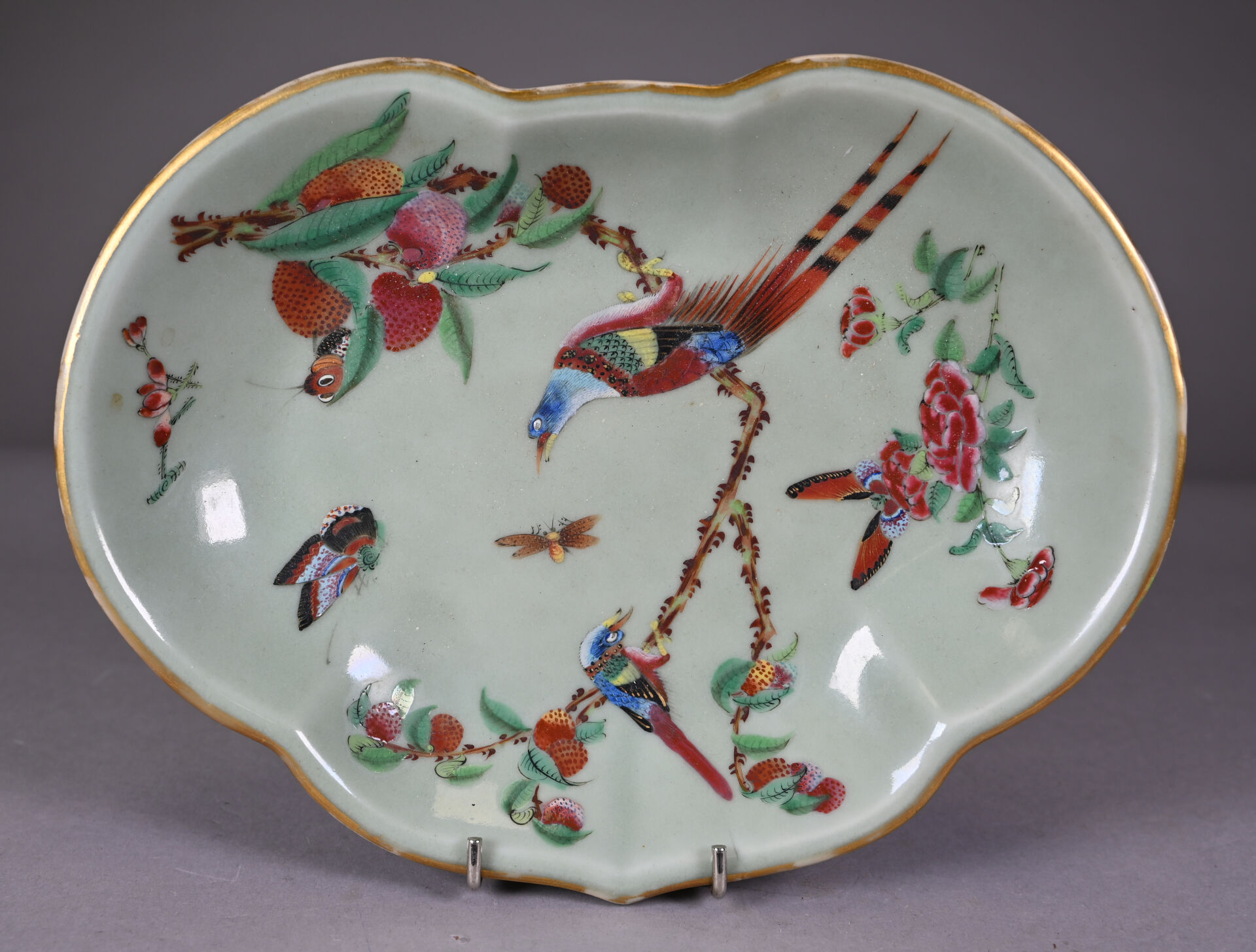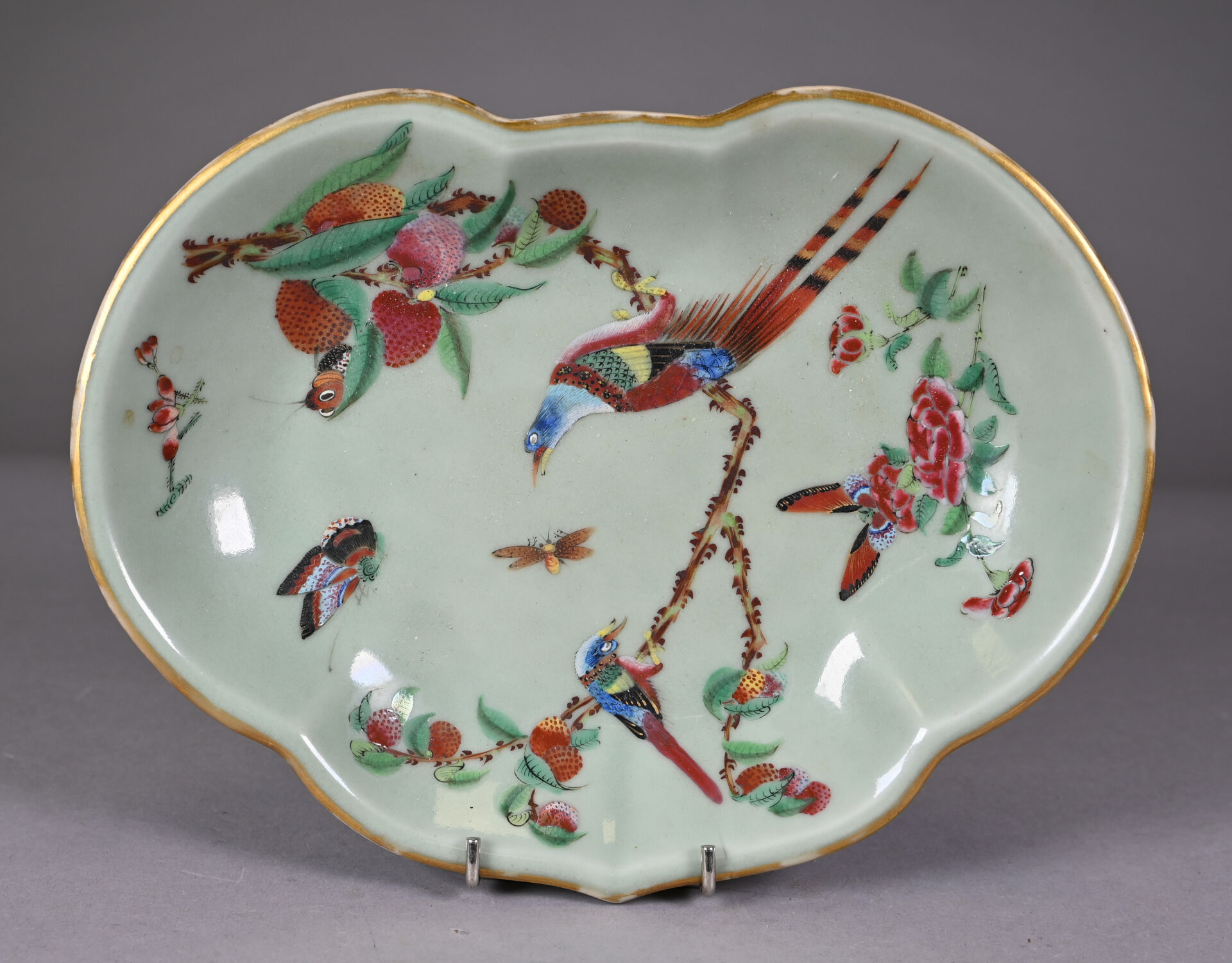 Un plat à bords violonés en porcelaine à décor émaillé en polychromie de la famille rose sur fond vert d’oiseaux fantastiques et papillons. Chine, fin du XIXe siècle. 27 x 20 cm.